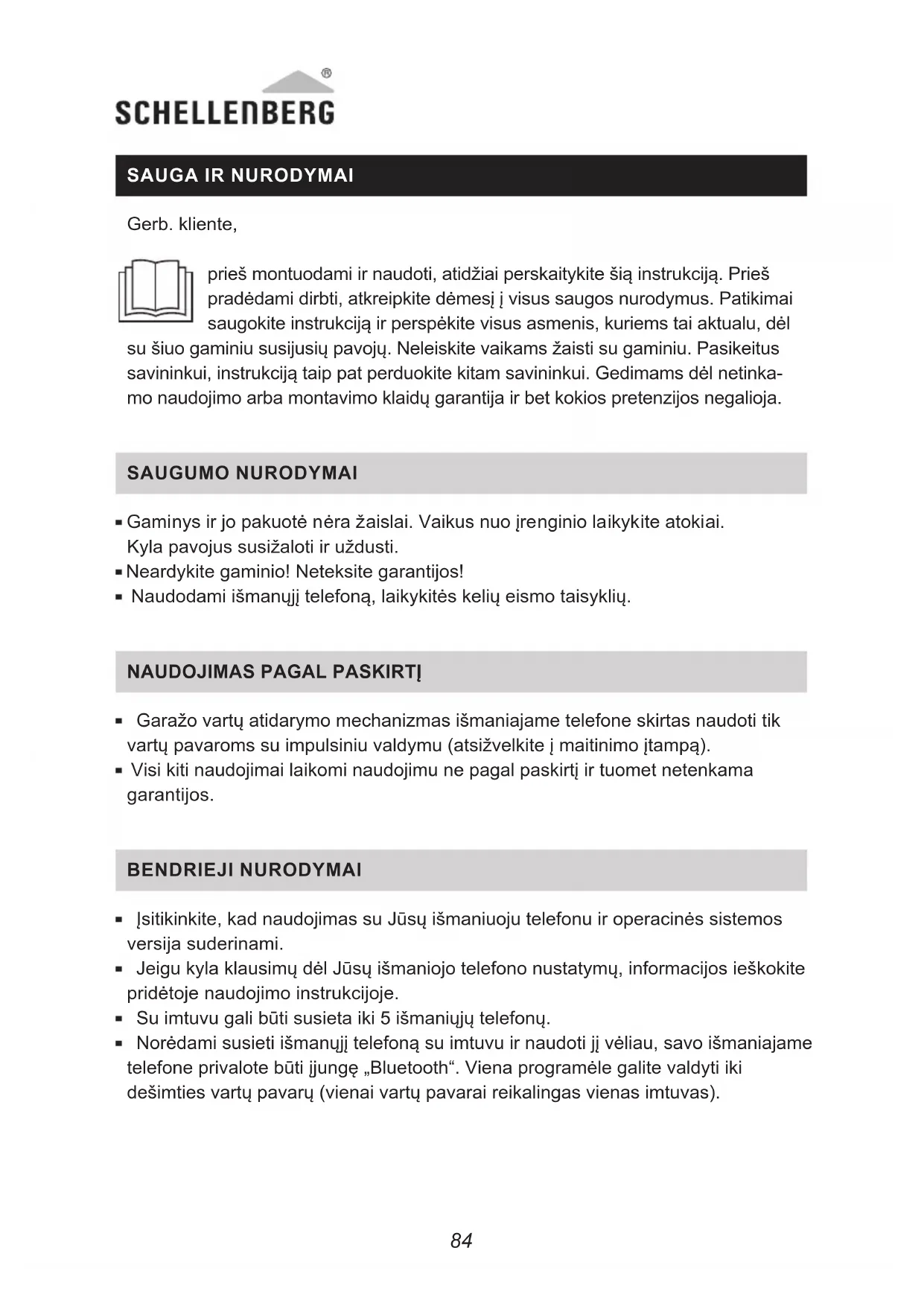 Garažovartųatidarymomechanizmasišmaniajametelefoneskirtasnaudotitik vartųpavaromssuimpulsiniuvaldymu(atsižvelkiteįmaitinimoįtampą). Visikitinaudojimailaikominaudojimunepagalpaskirtįirtuometnetenkama garantijos BENDRIEJI NURODYMAI Įsitikinkite,kadnaudojimassuJūsųišmaniuojutelefonuiroperacinėssistemos versija suderinami JeigukylaklausimųdėlJūsųišmaniojotelefononustatymų,informacijosieškokite pridėtojenaudojimoinstrukcijoje. Suimtuvugalibūtisusietaiki5išmaniųjųtelefonų. Norėdamisusietiišmanųjįtelefonąsuimtuvuirnaudotijįvėliau,savoišmaniajame telefoneprivalotebūtiįjungę„Bluetooth“.Vienaprogramėlegalitevaldytiiki dešimtiesvartųpavarų(vienaivartųpavaraireikalingasvienasimtuvas).8584