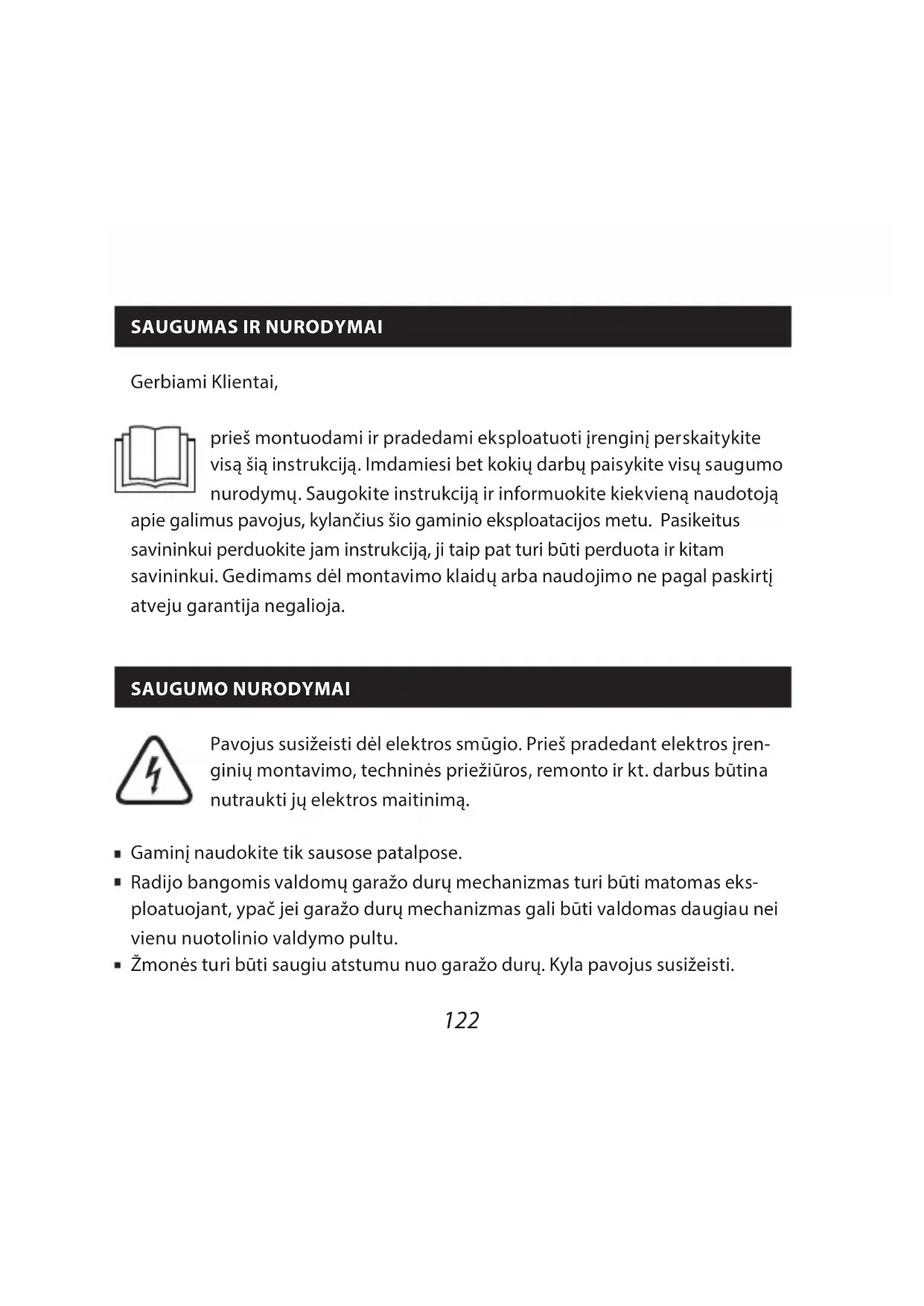 Gerbiami Klientai, prieš montuodami ir pradedami eksploatuoti įrenginį perskaitykite visą šią instrukciją Imdamiesi bet kokių darbų paisykite visų saugumo nurodymų Saugokite instrukciją ir informuokite kiekvieną naudotoją apie galimus pavojus, kylančius šio gaminio eksploatacijos metu Pasikeitus savininkui perduokite jam instrukciją, ji taip pat turi būti perduota ir kitam savininkui Gedimams dėl montavimo klaidų arba naudojimo ne pagal paskirtį atveju garantija negalioja SAUGUMO NURODYMAI Pavojus susižeisti dėl elektros smūgio Prieš pradedant elektros įren- ginių montavimo, techninės priežiūros, remonto ir kt darbus būtina nutraukti jų elektros maitinimą Gaminį naudokite tik sausose patalpose Radijo bangomis valdomų garažo durų mechanizmas turi būti matomas eks- ploatuojant, ypač jei garažo durų mechanizmas gali būti valdomas daugiau nei vienu nuotolinio valdymo pultu Žmonės turi būti saugiu atstumu nuo garažo durų Kyla pavojus susižeisti