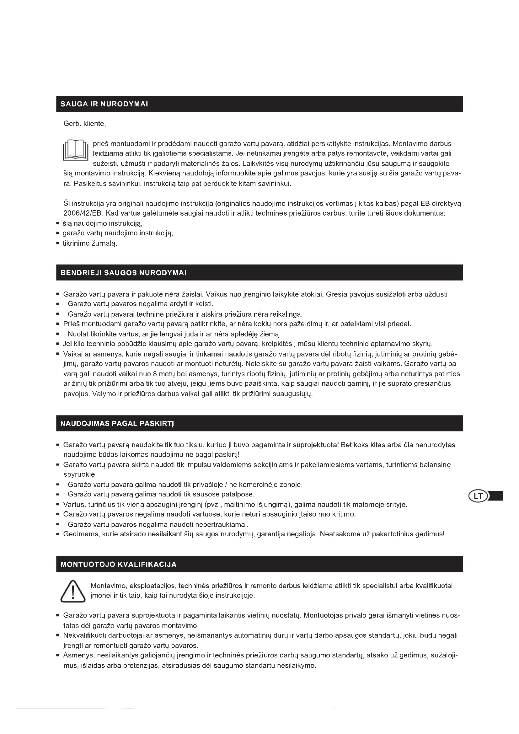 Gerb kliente, prieš montuodami ir pradėdami naudoti garažo vartų pavarą, atidžiai perskaitykite instrukcijas. Montavimo darbus leidžiama atlikti tik įgaliotiems specialistams. Jei netinkamai įrengėte arba patys remontavote, veikdami vartai gali sužeisti, užmušti ir padaryti materialinės žalos. Laikykitės visų nurodymų užtikrinančių jūsų saugumą ir saugokite šią montavimo instrukciją. Kiekvieną naudotoją informuokite apie galimus pavojus, kurie yra susiję su šia garažo vartų pava- ra. Pasikeitus savininkui, instrukciją taip pat perduokite kitam savininkui. Ši instrukcija yra originali naudojimo instrukcija (originalios naudojimo instrukcijos vertimas į kitas kalbas) pagal EB direktyvą 2006/42/EB. Kad vartus galėtumėte saugiai naudoti ir atlikti techninės priežiūros darbus, turite turėti šiuos dokumentus: šią naudojimo instrukciją, garažo vartų naudojimo instrukciją, tikrinimo žurnalą.