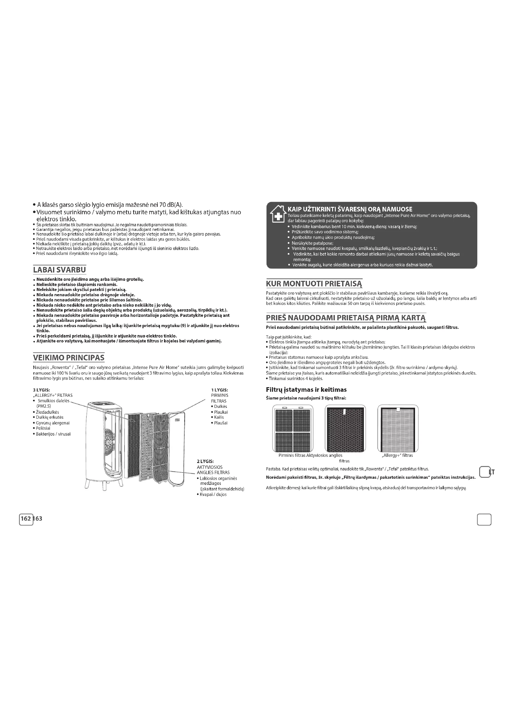 Atjunkite oro valytuvą, kai montuojate / išmontuojate ltrus ir kojeles bei valydami gaminį. VEIKIMO PRINCIPAS Naujasis „Rowenta“ / „Tefal“ oro valymo prietaisas „Intense Pure Air Home“ suteikia jums galimybę kvėpuoti namuose iki 100% švariu oru ir saugo jūsų sveikatą naudojant 3 ltravimo lygius, kaip aprašyta toliau. Kiekvienas ltravimo lygis yra būtinas, nes sulaiko atitinkamu teršalus: 3 LYGIS: „ALLERGY+“ FILTRAS