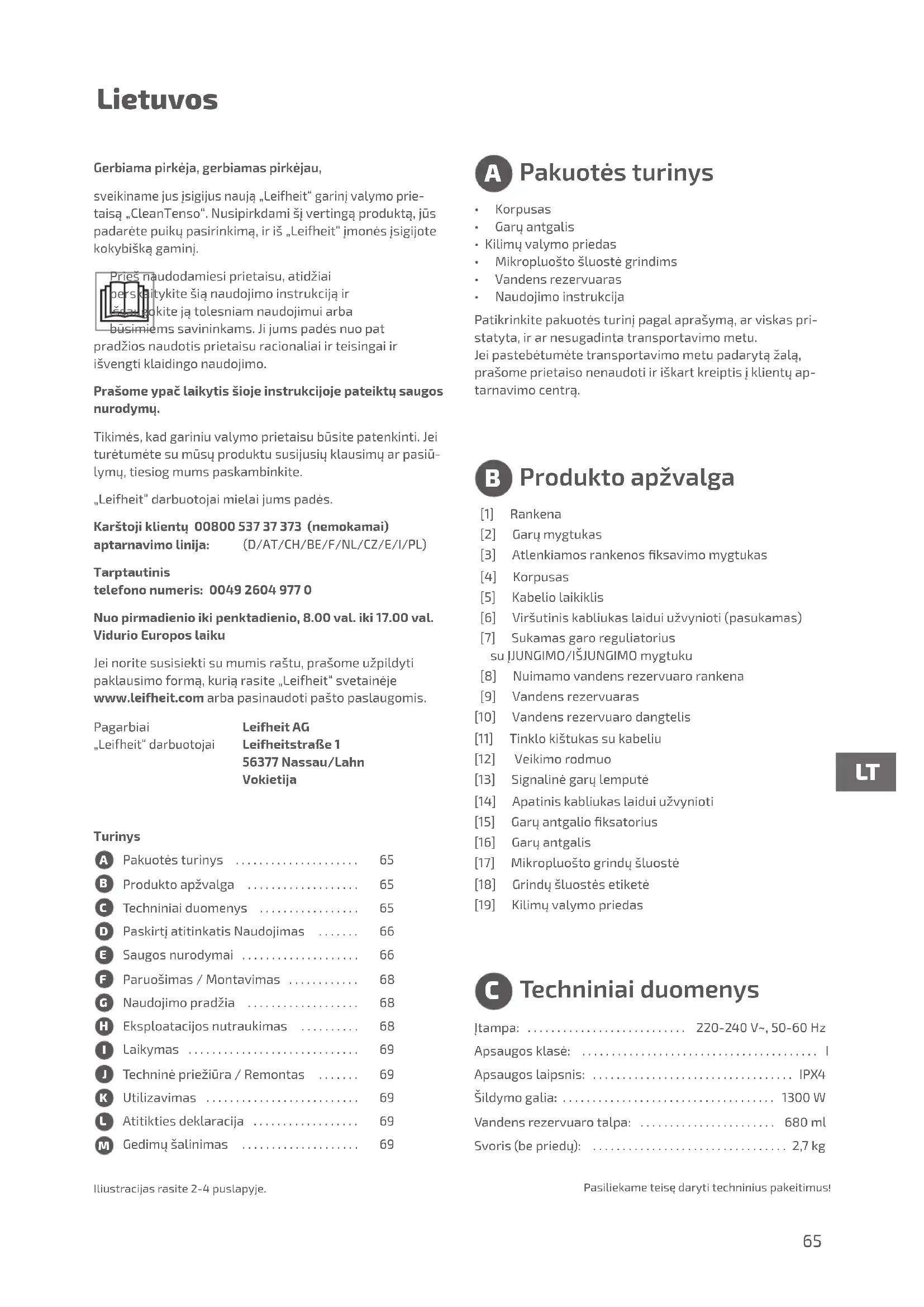 - Naudojimoinstrukcija Patikrinkitepakuotėsturinįpagalaprašymą,arviskaspri- statyta,irarnesugadintatransportavimometu. Jeipastebėtumėtetransportavimometupadarytąžalą, prašomeprietaisonenaudotiiriškartkreiptisįklientųap- tarnavimocentrą. Gerbiama pirkėja, gerbiamas pirkėjau, sveikinamejusįsigijusnaują„Leifheit“garinįvalymoprie- taisą „CleanTenso“.Nusipirkdamišįvertingąproduktą,jūs padarėtepuikųpasirinkimą,iriš„Leifheit“įmonėsįsigijote kokybiškągaminį. Priešnaudodamiesiprietaisu,atidžiai perskaitykitešiąnaudojimoinstrukcijąir išsaugokitejątolesniamnaudojimuiarba būsimiemssavininkams.Jijumspadėsnuopat pradžiosnaudotisprietaisuracionaliaiirteisingaiir išvengtiklaidingonaudojimo. Prašome ypač laikytis šioje instrukcijoje pateiktų saugos nurodymų. Tikimės,kadgariniuvalymoprietaisubūsitepatenkinti.Jei turėtumėtesumūsųproduktususijusiųklausimųarpasiū- lymų,tiesiogmumspaskambinkite. „Leifheit“darbuotojaimielaijumspadės. Karštoji klientų 00800 537 37 373 (nemokamai) aptarnavimo linija: (D/AT/CH/BE/F/NL/CZ/E/I/PL) Tarptautinis telefono numeris: 0049 2604 977 0 Nuo pirmadienio iki penktadienio, 8.00 val. iki 17.00 val. Vidurio Europos laiku Jeinoritesusisiektisumumisraštu,prašomeužpildyti paklausimoformą,kuriąrasite„Leifheit“svetainėje www.leifheit.comarbapasinaudotipaštopaslaugomis. Pagarbiai „Leifheit“darbuotojai [1] Rankena [2] Garųmygtukas [3] Atlenkiamosrankenosksavimomygtukas [4] Korpusas [5] Kabeliolaikiklis [6] Viršutiniskabliukaslaiduiužvynioti(pasukamas) [7] Sukamasgaroreguliatorius suĮJUNGIMO/IŠJUNGIMOmygtuku [8] Nuimamovandensrezervuarorankena [9] Vandensrezervuaras [10] Vandensrezervuarodangtelis [11] Tinklokištukassukabeliu [12] Veikimorodmuo [13] Signalinėgarųlemputė [14] Apatiniskabliukaslaiduiužvynioti [15] Garųantgalioksatorius [16] Garųantgalis [17] Mikropluoštogrindųšluostė [18] Grindųšluostėsetiketė [19] Kilimųvalymopriedas Įtampa: ........................... 220-240V~,50-60Hz Apsaugosklasė:........................................I Apsaugoslaipsnis:..................................IPX4 Šildymogalia:.................................... 1300W Vandensrezervuarotalpa:.......................680ml Svoris(bepriedų): .................................2,7kg