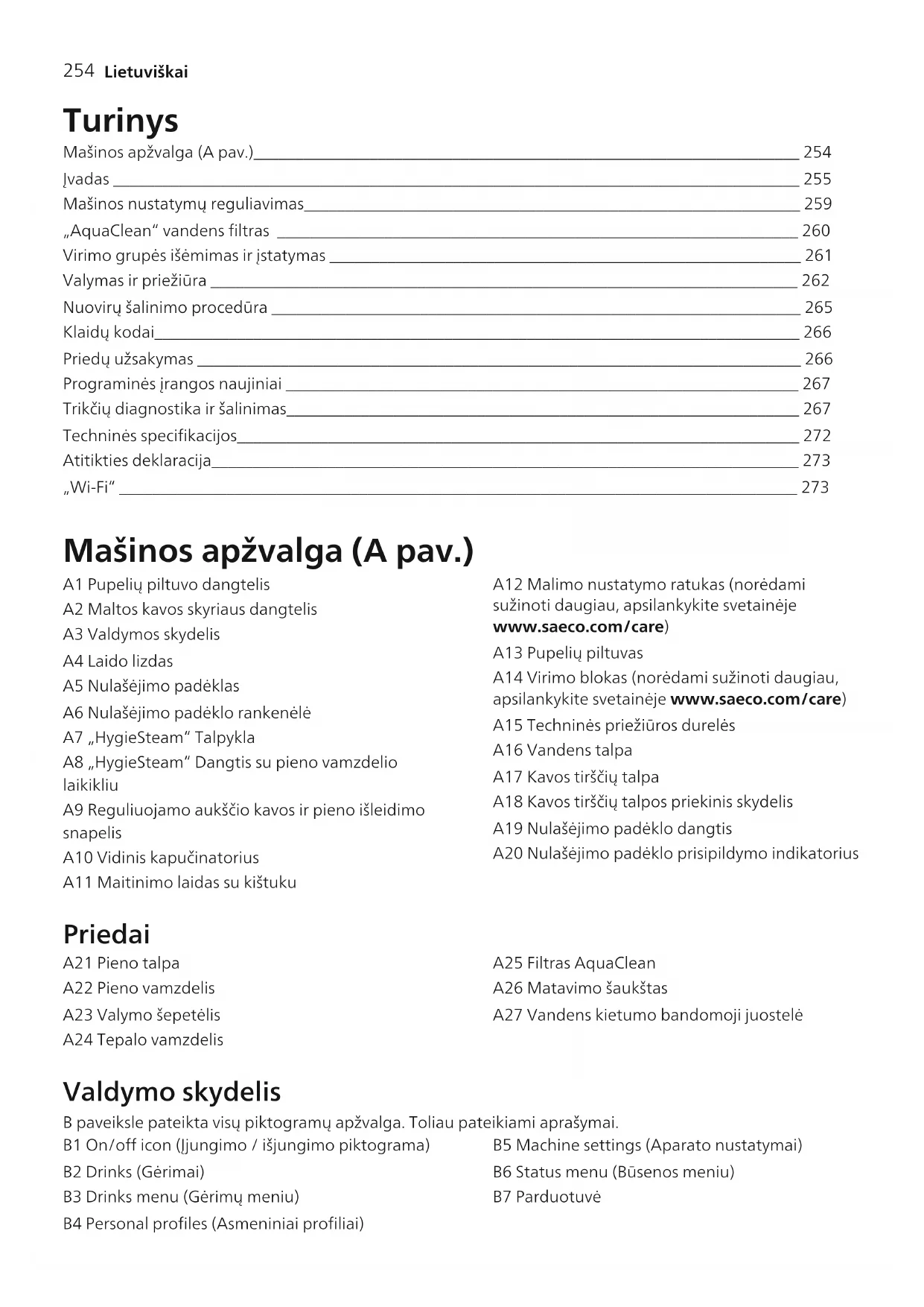 Lietuviškai Turinys Mašinos apžvalga (A pav.)__________________________________________________________________ 254 Įvadas ___________________________________________________________________________________ 255 Mašinos nustatymų reguliavimas____________________________________________________________ 259 „AquaClean“ vandens filtras _______________________________________________________________ 260 Virimo grupės išėmimas ir įstatymas _________________________________________________________ 261 Valymas ir priežiūra _______________________________________________________________________ 262 Nuovirų šalinimo procedūra ________________________________________________________________ 265 Klaidų kodai______________________________________________________________________________ 266 Priedų užsakymas _________________________________________________________________________ 266 Programinės įrangos naujiniai ______________________________________________________________ 267 Trikčių diagnostika ir šalinimas______________________________________________________________ 267 Techninės specifikacijos____________________________________________________________________ 272 Atitikties deklaracija_______________________________________________________________________ 273 „Wi-Fi“ __________________________________________________________________________________ 273 Mašinos apžvalga (A pav.) A1 Pupelių piltuvo dangtelis A2 Maltos kavos skyriaus dangtelis A3 Valdymos skydelis A4 Laido lizdas A5 Nulašėjimo padėklas A6 Nulašėjimo padėklo rankenėlė A7 „HygieSteam“ Talpykla A8 „HygieSteam“ Dangtis su pieno vamzdelio laikikliu A9 Reguliuojamo aukščio kavos ir pieno išleidimo snapelis A10 Vidinis kapučinatorius A11 Maitinimo laidas su kištuku A12 Malimo nustatymo ratukas (norėdami sužinoti daugiau, apsilankykite svetainėje www.saeco.com/care) A13 Pupelių piltuvas A14 Virimo blokas (norėdami sužinoti daugiau, apsilankykite svetainėje www.saeco.com/care) A15 Techninės priežiūros durelės A16 Vandens talpa A17 Kavos tirščių talpa A18 Kavos tirščių talpos priekinis skydelis A19 Nulašėjimo padėklo dangtis A20 Nulašėjimo padėklo prisipildymo indikatorius Priedai A21 Pieno talpa A22 Pieno vamzdelis A23 Valymo šepetėlis A24 Tepalo vamzdelis A25 Filtras AquaClean A26 Matavimo šaukštas A27 Vandens kietumo bandomoji juostelė Valdymo skydelis B paveiksle pateikta visų piktogramų apžvalga. Toliau pateikiami aprašymai. B1 On/off icon (Įjungimo / išjungimo piktograma) B2 Drinks (Gėrimai) B3 Drinks menu (Gėrimų meniu) B4 Personal profiles (Asmeniniai profiliai) B5 Machine settings (Aparato nustatymai) B6 Status menu (Būsenos meniu) B7 Parduotuvė255 Lietuviškai B8 Start/stop icon (Paleidimo / stabdymo piktograma) Įvadas Sveikiname įsigijus visiškai automatinę „Saeco“ kavos mašiną! Norėdami visapusiškai pasinaudoti „Saeco“ siūloma internetine pagalba, naudodami valdymo skydelį galite užregistruoti savo aparatą integruotu „Wi- Fi“ ryšiu arba galite apsilankyti svetainėje www.saeco.com/MyCoffeeMachine ir savo gaminį užregistruoti čia. Prieš naudodami mašiną pirmą kartą atidžiai perskaitykite atskirą saugos bukletą ir išsaugokite jį ateičiai. Visiškai automatinis „Saeco“ kavos aparatas leidžia prisijungti prie „Wi-Fi“ tinklo, kad kavos virimas teiktų dar daugiau džiaugsmo. Prijungę savo aparatą prie „Wi-Fi“ tinklo, galėsite: