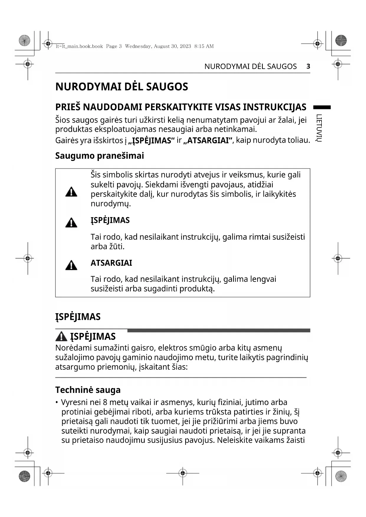 - Vyresni nei 8 metų vaikai ir asmenys, kurių fiziniai, jutimo arba protiniai gebėjimai riboti, arba kuriems trūksta patirties ir žinių, šį prietaisą gali naudoti tik tuomet, jei jie prižiūrimi arba jiems buvo suteikti nurodymai, kaip saugiai naudoti prietaisą, ir jei jie supranta su prietaiso naudojimu susijusius pavojus. Neleiskite vaikams žaisti Šis simbolis skirtas nurodyti atvejus ir veiksmus, kurie gali sukelti pavojų. Siekdami išvengti pavojaus, atidžiai perskaitykite dalį, kur nurodytas šis simbolis, ir laikykitės nurodymų. ĮSPĖJIMAS Tai rodo, kad nesilaikant instrukcijų, galima rimtai susižeisti arba žūti. ATSARGIAI Tai rodo, kad nesilaikant instrukcijų, galima lengvai susižeisti arba sugadinti produktą. lt-lt_main.book.book Page 3 Wednesday, August 30, 2023 8:15 AM4