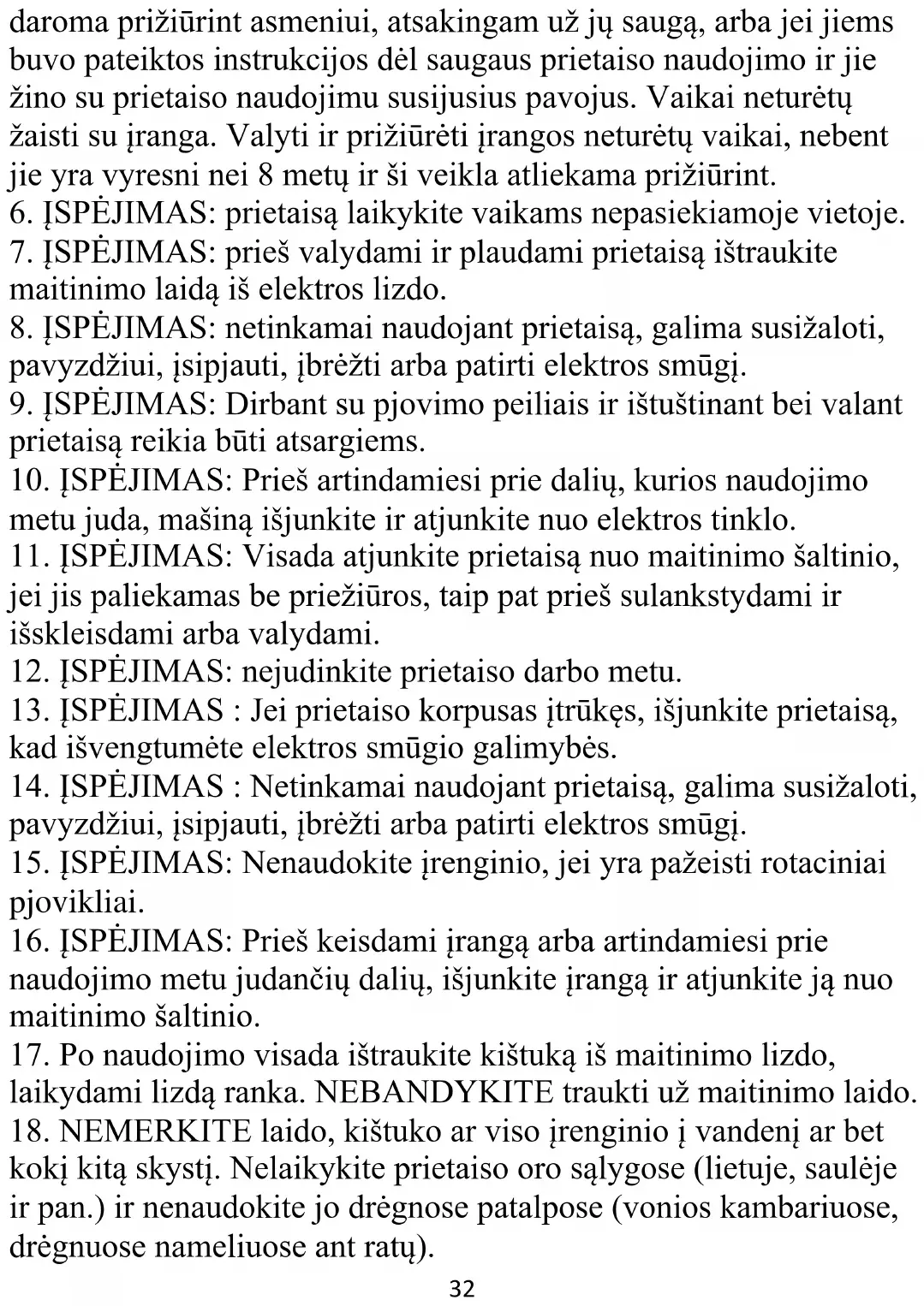 29. Nepalikite prietaiso, įjungto į elektros lizdą, be priežiūros.