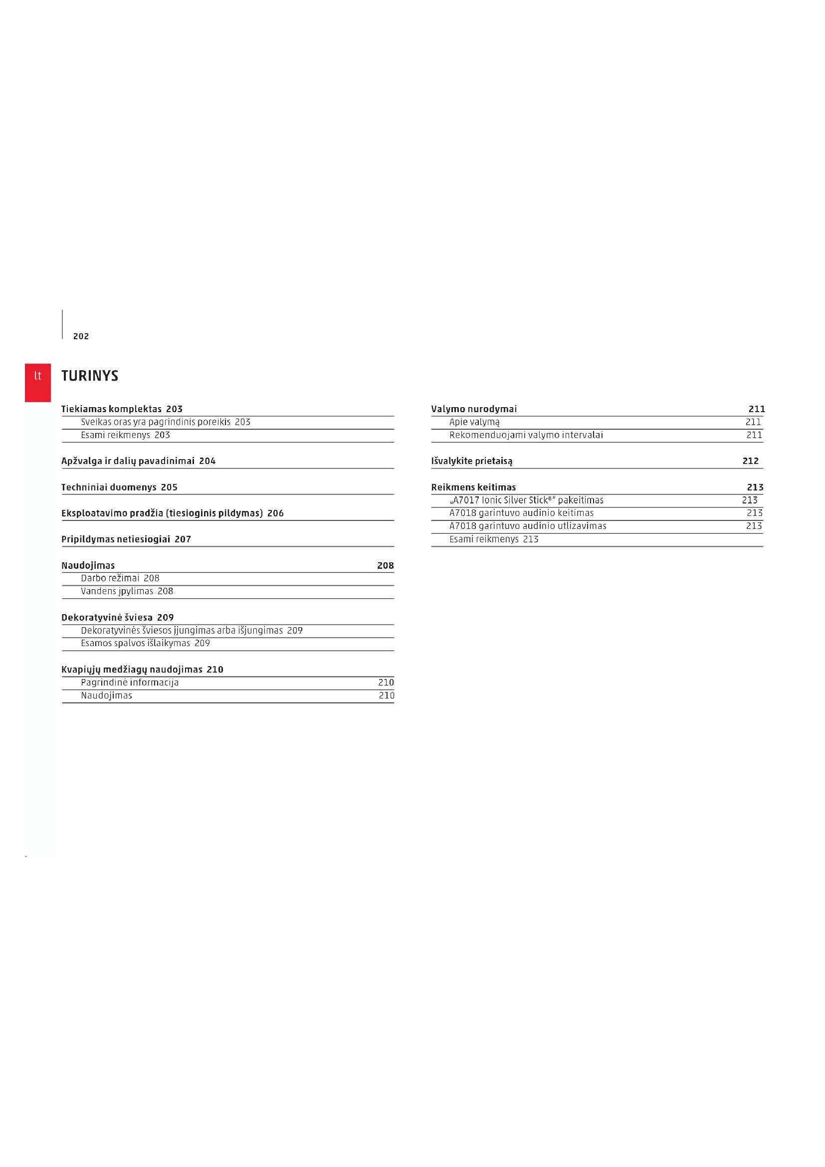 TURINYS Tiekiamas komplektas 203 Sveikas oras yra pagrindinis poreikis 203 Esami reikmenys 203 Apžvalga ir dalių pavadinimai 204 Techniniai duomenys 205 Eksploatavimo pradžia (tiesioginis pildymas) 206 Pripildymas netiesiogiai 207 Naudojimas 208 Darbo režimai 208 Vandens įpylimas 208 Dekoratyvinė šviesa 209 Dekoratyvinės šviesos įjungimas arba išjungimas 209 Esamos spalvos išlaikymas 209 Kvapiųjų medžiagų naudojimas 210 Pagrindinė informacija 210 Naudojimas 210 Valymo nurodymai 211 Apie valymą 211 Rekomenduojami valymo intervalai 211 Išvalykite prietaisą 212 Reikmens keitimas 213 „A7017 Ionic Silver Stick®“ pakeitimas 213 A7018 garintuvo audinio keitimas 213 A7018 garintuvo audinio utlizavimas 213 Esami reikmenys 213203