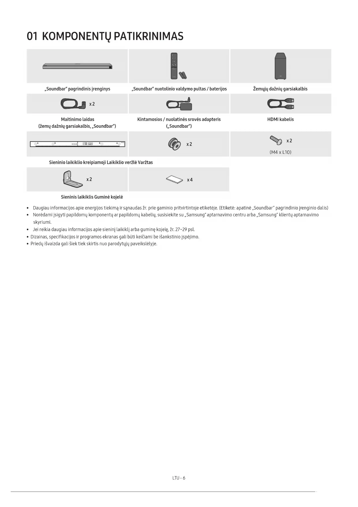 - 13 Trikčių šalinimas 30 14 Licencija 32 15 Atvirojo kodo licencijos pranešimas 32 16 Svarbios pastabos apie paslaugą 32 17 Specikacijos ir vadovas 33 Specikacijos LTU - 6 01 KOMPONENTŲ PATIKRINIMAS VOL WOOFER SOUNDBAR SOUND MODE PAIR „Soundbar“ pagrindinis įrenginys „Soundbar“ nuotolinio valdymo pultas / baterijos Žemųjų dažnių garsiakalbis x 2 Maitinimo laidas (žemų dažnių garsiakalbis, „Soundbar“) Kintamosios / nuolatinės srovės adapteris („Soundbar“) HDMI kabelis x 2 x 2 (M4 x L10) Sieninio laikiklio kreipiamoji Laikiklio veržlė Varžtas x 2 x 4 Sieninis laikiklis Guminė kojelė p. 33