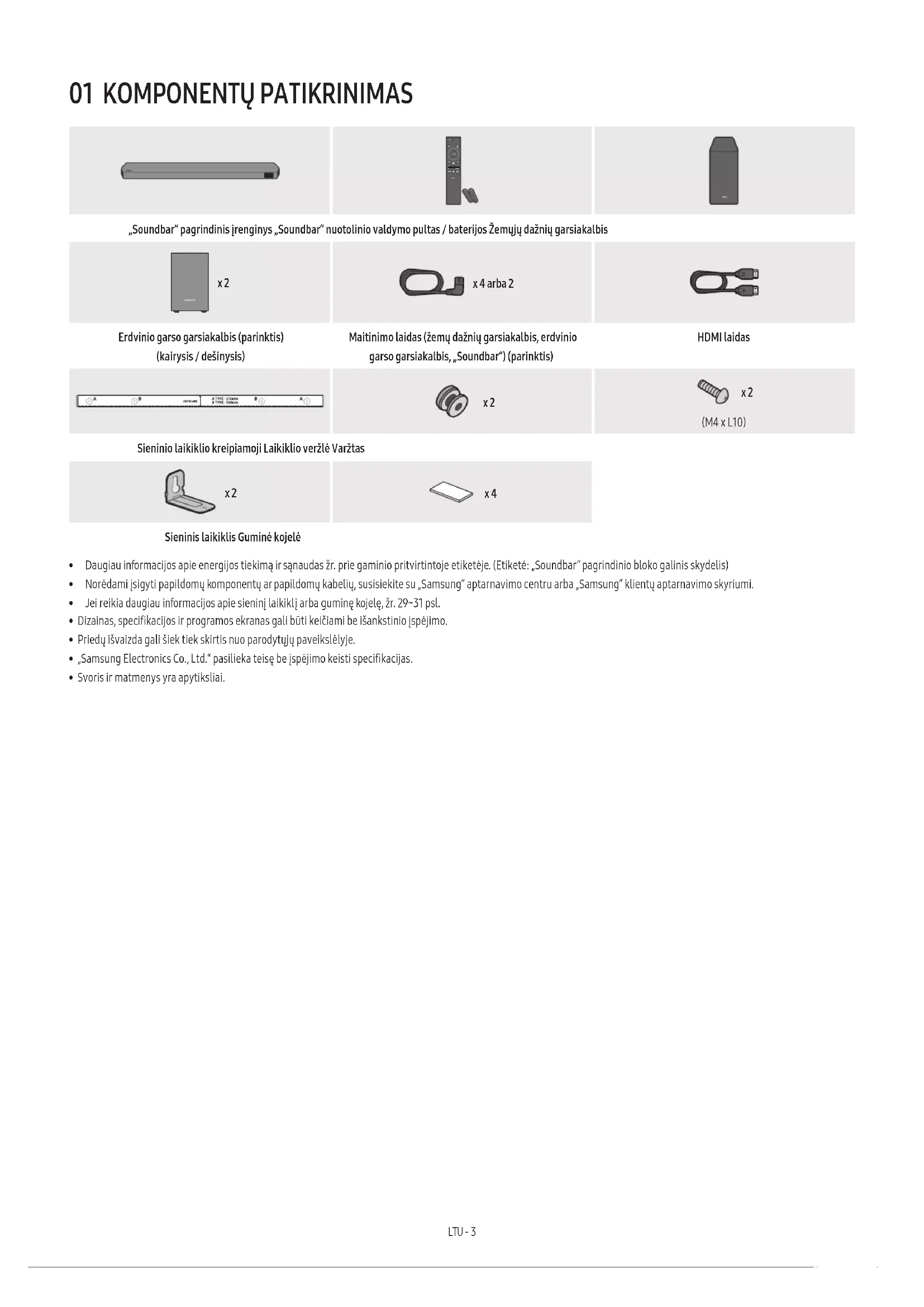 - Soundbar ir saderīga ar AirPlay2, kas instalēts iOS 13.4 vai jaunākā versijā.LTU - 2 TURINYS 01 Komponentų patikrinimas 3 02 Gaminio apžvalga 4 „Soundbar“ viršutinis skydelis . . . . . . . . . . . . . . . . . . . . . . . . . . . . . . . . . . . . . . . . . . . . . . .4 Apatinis „Soundbar“ skydelis . . . . . . . . . . . . . . . . . . . . . . . . . . . . . . . . . . . . . . . . . . . . . . . .5 03 „Soundbar“ garsiakalbio nuotolinio valdymo pulto naudojimas 6 Baterijų įdėjimas prieš pradedant naudotis nuotolinio valdymo pultu (2 AAA tipo baterijos) . . . . . . . . . . . . . . . . . . . . . . . . . . . . . . . . . . . . . . . . . . . . . . . . . . . . . . .6 Kaip naudotis nuotolinio valdymo pultu . . . . . . . . . . . . . . . . . . . . . . . . . . . . . . . . . . . . . .6 „Active Voice Amplier“ (AVA) . . . . . . . . . . . . . . . . . . . . . . . . . . . . . . . . . . . . . . . . . . . . . . .8 Paslėptų mygtukų naudojimas (mygtukai su keliomis funkcijomis) . . . . . . . . . . . . .8 Skirtingų režimų garso efektų išvesties specikacijos . . . . . . . . . . . . . . . . . . . . . . . . .8 „Soundbar“ garsumo reguliavimas televizoriaus nuotoliniu pulteliu. . . . . . . . . . .10 04 „Soundbar“ prijungimas 11 Maitinimo ir įrenginių prijungimas . . . . . . . . . . . . . . . . . . . . . . . . . . . . . . . . . . . . . . . . . . 11 ‒ Rekomenduojamas garsiakalbių išdėstymas . . . . . . . . . . . . . . . . . . . . . . . . . . . . 12 ‒ Erdvinio garso garsiakalbio režimas (tik HW-Q9**C, HW-Q9**GC) . . . . . . . . 12 ‒ Žemų dažnių garsiakalbio arba erdvinio garso garsiakalbių prijungimas rankiniu būdu . . . . . . . . . . . . . . . . . . . . . . . . . . . . . . . . . . . . . . . . . . . . . 13 ‒ Žemų dažnių ir erdvinio garso garsiakalbių gale esančios LED indikatoriaus lemputės . . . . . . . . . . . . . . . . . . . . . . . . . . . . . . . . . . . . . . . . . . . . 14 05 Prisijungimas prie televizoriaus 15 Televizoriaus, palaikančio HDMI ARC (garso grąžinimo kanalas), prijungimas . . . . . . . . . . . . . . . . . . . . . . . . . . . . . . . . . . . . . . . . . . . . . . . . . . . . . . . . . . . . . . .15 Prijungimas naudojant optinį kabelį. . . . . . . . . . . . . . . . . . . . . . . . . . . . . . . . . . . . . . . . .16 Prijungimas per „Bluetooth“ . . . . . . . . . . . . . . . . . . . . . . . . . . . . . . . . . . . . . . . . . . . . . . . .17 Prijungimas naudojant „Wi-Fi“ . . . . . . . . . . . . . . . . . . . . . . . . . . . . . . . . . . . . . . . . . . . . . .19 „Q-Symphony“ funkcijos naudojimas . . . . . . . . . . . . . . . . . . . . . . . . . . . . . . . . . . . . . . . 20 „SpaceFit Sound“ naudojimas. . . . . . . . . . . . . . . . . . . . . . . . . . . . . . . . . . . . . . . . . . . . . . .21 06 Išorinio įrenginio prijungimas 22 1 būdas. Prijungimas naudojant HDMI laidą (gebantį atkurti ir dekoduoti „Dolby Atmos“ / DTS:X). . . . . . . . . . . . . . . . . . . . . . . . . .22 2 būdas. Prijungimas naudojant optinį kabelį . . . . . . . . . . . . . . . . . . . . . . . . . . . . . . . .23 07 Mobiliojo įrenginio prijungimas 24 1 būdas. Prijungimas per „Bluetooth“. . . . . . . . . . . . . . . . . . . . . . . . . . . . . . . . . . . . . . . .24 2 būdas. Prijungimas naudojant „Wi-Fi“ (belaidis tinklas) . . . . . . . . . . . . . . . . . . . . .26 „Tap Sound“ funkcijos naudojimas. . . . . . . . . . . . . . . . . . . . . . . . . . . . . . . . . . . . . . . . . . .27 08 Prisijungimas per „Apple Airplay 2“ 28 09 Sieninio laikiklio montavimas 29 Su įrengimu susijusios atsargumo priemonės. . . . . . . . . . . . . . . . . . . . . . . . . . . . . . . .29 Tvirtinimo prie sienos komponentai. . . . . . . . . . . . . . . . . . . . . . . . . . . . . . . . . . . . . . . . .29 Erdvinio garso garsiakalbių tvirtinimas prie sienos (tik taikomiems modeliams). . . . . . . . . . . . . . . . . . . . . . . . . . . . . . . . . . . . . . . . . . . . . . . 30 10 „Soundbar“ įrengimas priešais televizorių 30 Komponentai. . . . . . . . . . . . . . . . . . . . . . . . . . . . . . . . . . . . . . . . . . . . . . . . . . . . . . . . . . . . . 30 11 Programinės įrangos naujinimas 31 Automatinis naujinimas. . . . . . . . . . . . . . . . . . . . . . . . . . . . . . . . . . . . . . . . . . . . . . . . . . . .31 Naujinimas naudojant USB . . . . . . . . . . . . . . . . . . . . . . . . . . . . . . . . . . . . . . . . . . . . . . . . .31 Inicijavimas . . . . . . . . . . . . . . . . . . . . . . . . . . . . . . . . . . . . . . . . . . . . . . . . . . . . . . . . . . . . . . .32 12 Trikčių šalinimas 32LTU - 3 01 KOMPONENTŲ PATIKRINIMAS SOUNDBAR „Soundbar“ pagrindinis įrenginys „Soundbar“ nuotolinio valdymo pultas / baterijos Žemųjų dažnių garsiakalbis POWER x 2 x 4 arba 2 Erdvinio garso garsiakalbis (parinktis) (kairysis / dešinysis) Maitinimo laidas (žemų dažnių garsiakalbis, erdvinio garso garsiakalbis, „Soundbar“) (parinktis) HDMI laidas x 2 x 2 (M4 x L10) Sieninio laikiklio kreipiamoji Laikiklio veržlė Varžtas x 2 x 4 Sieninis laikiklis Guminė kojelė