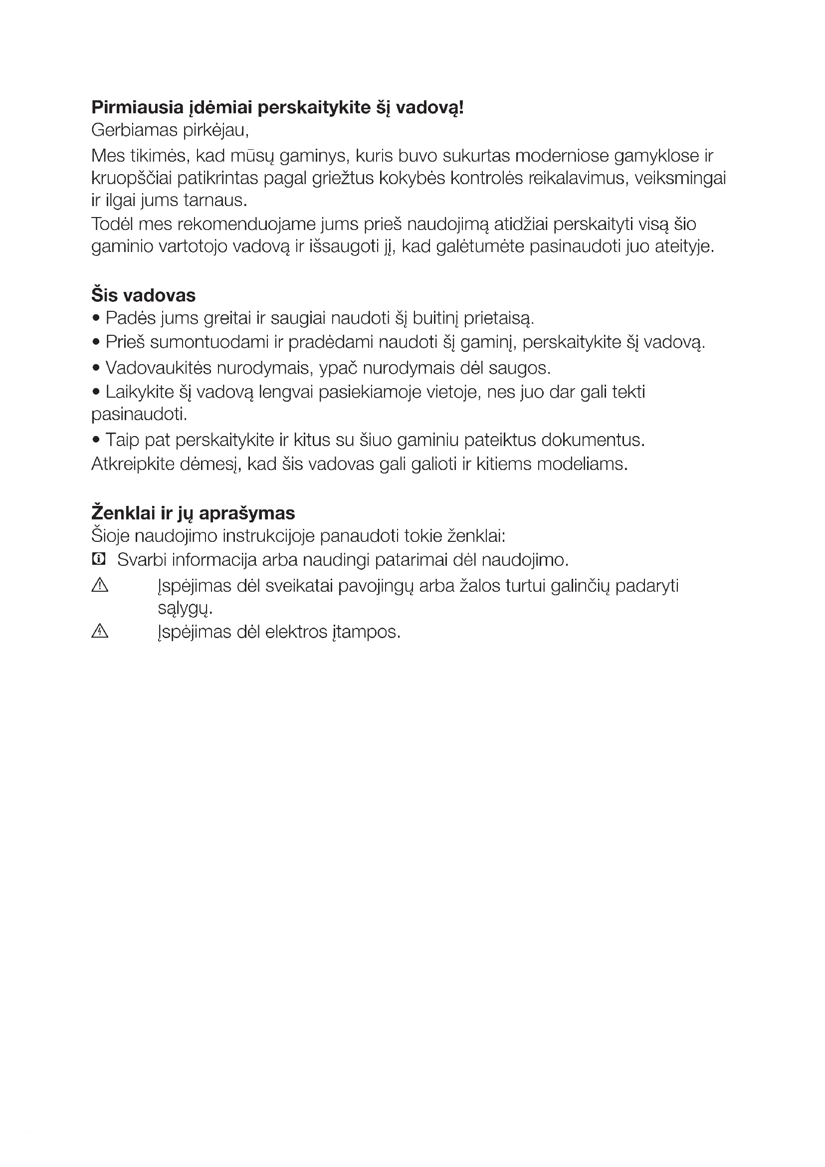 - Jeigu gaminyje įrengta aušinimo sistema, kurioje naudojama R600a: 9 Nepaisykite šio įspėjimo, jeigu gaminyje įrengta aušinimo sistema, kurioje naudojama R134a p. 9