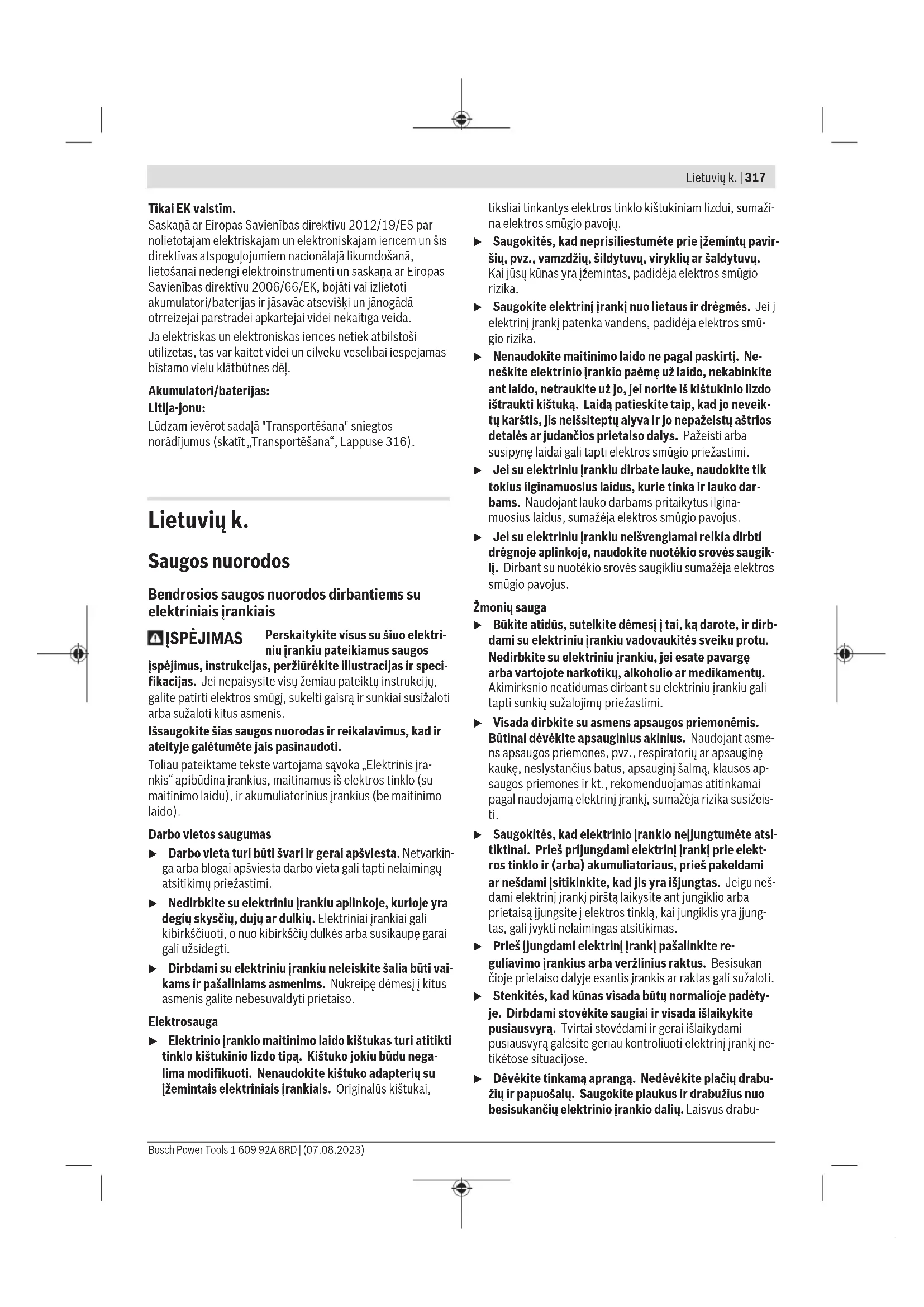 Šioje instrukcijoje pateiktas vibracijos lygis ir triukšmo emisi- ja buvo išmatuoti pagal standartizuotą matavimo metodą, ir juos galima naudoti elektriniams įrankiams palyginti. Jie taip pat skirti vibracijos ir triukšmo emisijai iš anksto įvertinti. Nurodytas vibracijos lygis ir triukšmo emisijos vertė atspindi pagrindinius elektrinio įrankio naudojimo atvejus. Tačiau jei- gu elektrinis įrankis naudojamas kitokiai paskirčiai, su kito- kiais darbo įrankiais arba jeigu jis nepakankamai techniškai prižiūrimas, vibracijos lygis ir triukšmo emisijos vertė gali ki- sti. Tokiu atveju vibracijos ir triukšmo emisija per visą darbo laikotarpį gali žymiai padidėti. Norint tiksliai įvertinti vibracijos ir triukšmo emisiją per tam tikrą darbo laiką, reikia atsižvelgti ir į laiką, per kurį elektrinis įrankis buvo išjungtas arba, nors ir veikė, bet nebuvo naudo- jamas. Tai įvertinus, vibracijos ir triukšmo emisija per visą darbo laiką žymiai sumažės. Dirbančiajam nuo vibracijos poveikio apsaugoti paskirkite papildomas apsaugos priemones, pvz.: elektrinių ir darbo įrankių techninę priežiūrą, rankų šildymą, darbo eigos orga- nizavimą. Akumuliatorius Bosch akumuliatorinius elektrinius įrankius parduoda ir be akumuliatoriaus. Ar į jūsų elektrinio įrankio tiekiamą komp- lektą įeina akumuliatorius, galite pažiūrėti ant pakuotės. Akumuliatoriaus įkrovimas u Naudokite tik techninių duomenų skyriuje nurodytus kroviklius. Tik šie krovikliai yra priderinti prie Jūsų elekt- riniame prietaise naudojamo ličio jonų akumuliatoriaus. Nuoroda: laikantis tarptautinių transportavimo teisės aktų, ličio jonų akumuliatoriai tiekiami dalinai įkrauti. Kad akumu- liatorius veiktų visa galia, prieš pirmąjį naudojimą akumulia- torių visiškai įkraukite. Akumuliatoriaus įdėjimas Įkrautą akumuliatorių stumkite į akumuliatoriaus laikiklį, kol pajusite, kad užsifiksavo. Akumuliatoriaus išėmimas Norėdami išimti akumuliatorių, paspauskite akumuliatoriaus atblokavimo klavišus ir išimkite akumuliatorių. Traukdami nenaudokite jėgos. Akumuliatoriuje yra 2fiksavimo pakopos, kurios saugo, kad netikėtai paspaudus akumuliatoriaus atblokavimo klavišą, akumuliatorius neiškristų. Į elektrinį prietaisą įstatytą akumu- liatorių tinkamoje padėtyje palaiko spyruoklė. Akumuliatoriaus įkrovos būklės indikatorius Nuoroda: ne visų tipų akumuliatoriai yra su įkrovos būklės in- dikatoriumi. Žali akumuliatoriaus įkrovos būklės indikatoriairodo akumu- liatoriausįkrovos būklę. Dėl saugumo, įkrovos būklę galima pažiūrėti tik tada, kai elektrinis įrankis neveikia. Jei norite, kad būtų parodyta įkrovos būklė, paspauskite įkrovos būklės mygtuką arba . Tai galima ir tada, kai akumuliatorius yra išimtas. Jei paspaudus mygtuką nešviečia nei vienas šviesadiodis in- dikatorius, vadinasi akumuliatorius yra pažeistas ir jį reikia pakeisti. Akumuliatoriaus tipas GBA 18V... Šviesos diodas Talpa Šviečia nuolat 3× žali 60–100% Šviečia nuolat 2× žali 30–60% Šviečia nuolat 1× žalias 5–30% Mirksi 1× žalias 0–5% Akumuliatoriaus tipas ProCORE18V... Šviesos diodas Talpa Šviečia nuolat 5× žali 80–100% Šviečia nuolat 4× žali 60–80% Šviečia nuolat 3× žali 40–60% Šviečia nuolat 2× žali 20–40% 1 609 92A 8RD | (07.08.2023) Bosch Power ToolsLietuvių k. | 321 Šviesos diodas Talpa Šviečia nuolat 1× žalias 5–20% Mirksi 1× žalias 0–5% Nuorodos, kaip optimaliai elgtis su akumuliatoriumi Saugokite akumuliatorių nuo drėgmės ir vandens. Akumuliatorių sandėliuokite tik nuo −20°C iki 50°C tem- peratūroje. Pvz., nepalikite akumuliatoriaus vasarą automo- bilyje. Akumuliatoriaus ventiliacines angas valykite minkštu, švariu ir sausu teptuku. Pastebimas įkrauto akumuliatoriaus veikimo laiko sutrumpė- jimas rodo, kad akumuliatorius susidėvėjo ir jį reikia pakeisti. Laikykitės pateiktų šalinimo nurodymų. Montavimas u Prieš atliekant bet kokius elektrinio įrankio priežiūros darbus (atliekant techninę priežiūrą ar keičiant įrankį ir t. t.), o taip pat elektrinį įrankį transportuojant ir sandėliuojant, būtina iš jo išimti akumuliatorių. Prie- šingu atveju galite susižeisti, netyčia nuspaudę įjungimo- išjungimo jungiklį. Įrankių keitimas u Įrankį keiskite mūvėdami apsauginėmis pirštinėmis. Prisilietus prie darbo įrankių iškyla susižalojimo pavojus. Darbo įrankio parinkimas Naudokite jūsų elektriniam įrankiui skirtus darbo įrankius. Darbo įrankis GOP18V‑34 Žemiau esančioje lentelėje pateikti darbo įrankių pavyzdžiai. Daugiau darbo įrankių rasite plačioje Bosch papildomos įrangos programoje. Darbo įrankis Medžiaga Naudojimas AIZ 10 AB „Starlock“ 10×20mm bime- talo įpjaunamasis pjūklelis medienai ir metalui Minkštoji mediena, minkš- tasis plastikas, gipso kar- tonas, plonasienio aliu- minio ir spalvotųjų metalų profiliuočiai, plonos skar- dos, negrūdintos vinys ir varžtai Mažų ruošinių atpjovimas ir įpjovos; subtilūs medienos pri- derinimo darbai; Pavyzdžiui: išėmų kabeliams pjovimas, įpjovų gipso karto- no plokštėse darymas, papildomų išpjovų, skirtų furnitūrai ir spynoms, išpjovimas AIZ 32 EPC „Starlock“ 32×50mmHCS įpjaunamasis pjūk- lelis medienai Minkštoji mediena Atpjovimas ir įpjovų darymas neišdraskant pjovimo kraštų dėl užapvalintos pjovimo briaunos („Curved-Tec“); taip pat pjovimas arti krašto, kampuose ir sunkiai prieinamose vie- tose; Pavyzdžiui: įpjova, norint įmontuoti ventiliacines groteles arba kištukinį lizdą AIZ 32 APB/ AIZ 32 APIB „Starlock“ 32×50mm bime- talo įpjaunamasis pjūklelis medienai ir metalui Kompozicinės medžiagos iš medienos ir minkšti spalvotieji metalai, negrū- dintos vinys ir varžtai, ma- žesnių matmenų profiliuo- čiai ir vamzdžiai iš spalvo- tųjų metalų Įpjovos ir pjūviai medienoje, minkštuose sp