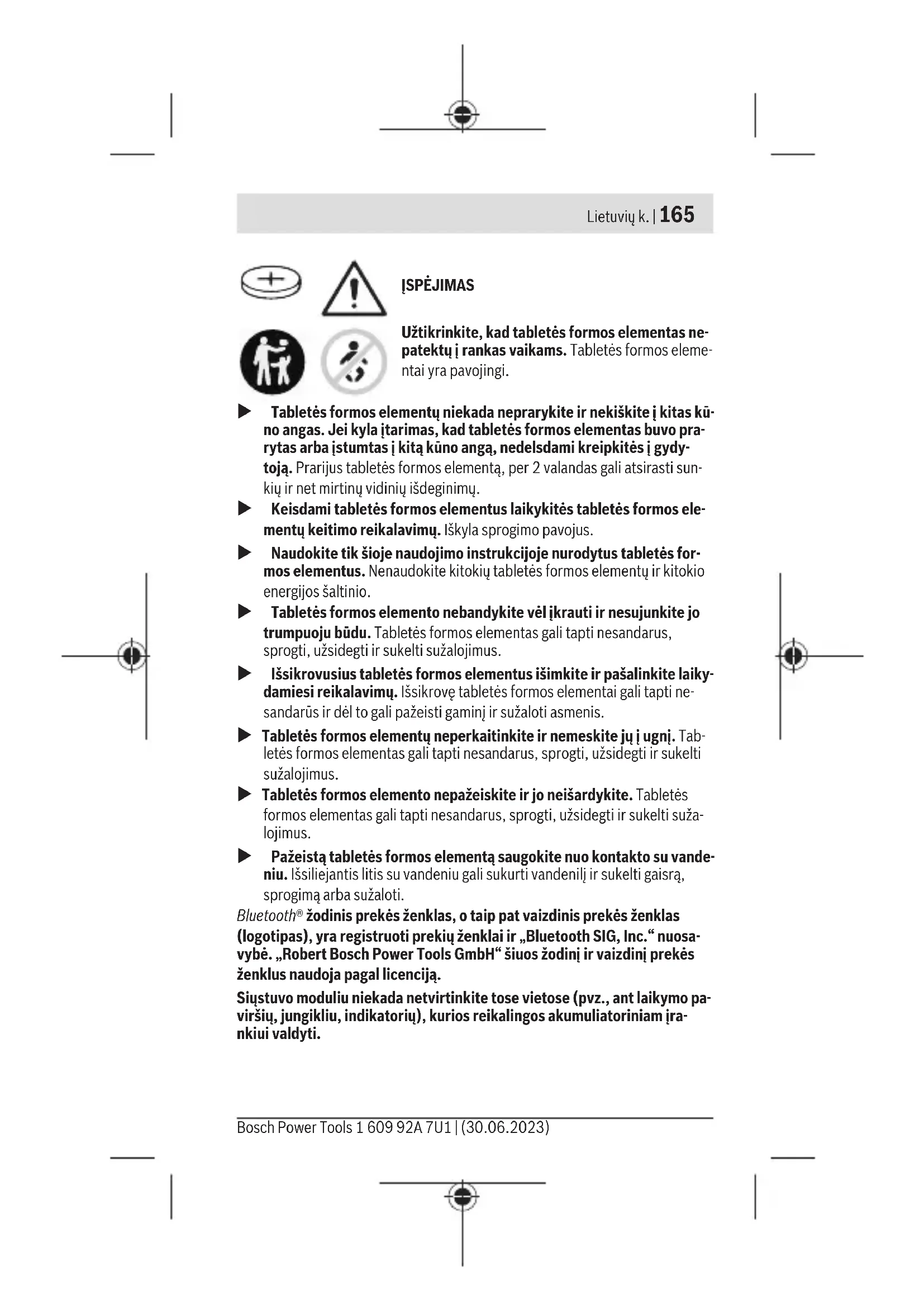 Geltona – Beveik išsikrovęs table- tės formos elementas Tuoj pakeiskite tabletės for- mos elementą Raudona – Ryšys nesukurtas arba – Išsikrovęs tabletės for- mos elementas – Pabandykite iš naujo sukurti ryšį arba – Pakeiskite tabletės for- mos elementą 1 609 92A 7U1 | (30.06.2023) Bosch Power ToolsLietuvių k. | 169 Priežiūra ir servisas Priežiūra ir valymas Nešvarumus pašalinkite teptuku arba drėgnu skudurėliu.Nenaudokite valymo priemonių ir tirpiklių. Tabletės formos elemento keitimas u Dėmesio: tabletės formos elementą visada keiskite tokio paties tipo tabletės formos elementu. Iškyla sprogimo pavojus. u Išsikrovusius tabletės formos elementus išimkite ir pašalinkite laiky- damiesi reikalavimų. Išsikrovę tabletės formos elementai gali tapti ne- sandarūs ir dėl to gali pažeisti gaminį ir sužaloti asmenis. – Moneta atidarykite baterijų skyriaus dangtelį, esantį siųstuvo modulio už- pakalinėje pusėje. – Išimkite tabletės formos elementą ir įdėkite naują tabletės formos eleme- ntą. Atkreipkite dėmesį į ženklinimą, kaip tinkamai įdėti tabletės formos ele- mentą. – Moneta uždarykite baterijų skyriaus dangtelį. Sukite dangtelį iki atramos, kad užtikrintumėte tinkamą uždarymą. Klientų aptarnavimo skyrius ir konsultavimo tarnyba Klientų aptarnavimo skyriuje gausite atsakymus į klausimus, susijusius su jūsų gaminio remontu, technine priežiūra bei atsarginėmis dalimis. Detalius brėži- nius ir informacijos apie atsargines dalis rasite interneto puslapyje: www.bosch-pt.com Bosch konsultavimo tarnybos specialistai mielai pakonsultuos Jus apie ga- minius ir jų papildomą įrangą. Ieškant informacijos ir užsakant atsargines dalis prašome būtinai nurodyti de- šimtženklį gaminio numerį, esantį firminėje lentelėje. Lietuva Bosch įrankių servisas Informacijos tarnyba: (037) 713350 ļrankių remontas: (037) 713352 Faksas: (037) 713354 El. paštas: service-pt@lv.bosch.com Kitus techninės priežiūros skyriaus adresus rasite čia: www.bosch-pt.com/serviceaddresses Bosch Power Tools 1 609 92A 7U1 | (30.06.2023)170 | 한국어 Šalinimas Siųstuvo modulis, papildoma įranga ir pakuotės turi būti ekologiškai utilizuoja- mi. Nemeskite elektroninių konstrukcinių dalių ir baterijų į bui-tinių atliekų konteinerius!