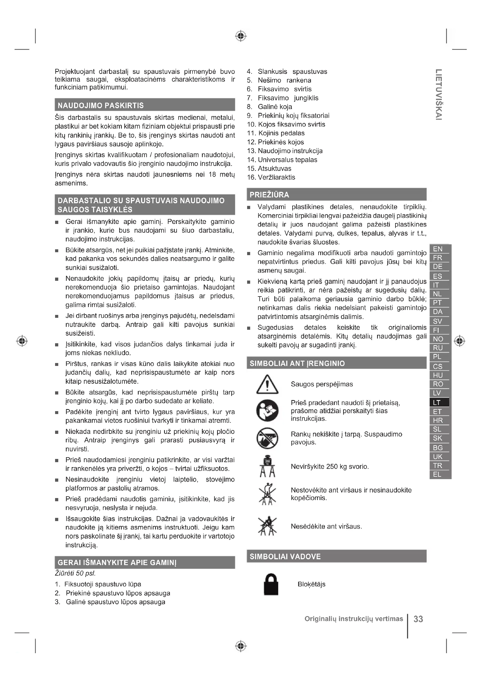 ■ Gerai išmanykite apie gaminį. Perskaitykite gaminio ir įrankio, kurie bus naudojami su šiuo darbastaliu, naudojimo instrukcijas. ■ Būkite atsargūs, net jei puikiai pažįstate įrankį. Atminkite, kad pakanka vos sekundės dalies neatsargumo ir galite sunkiai susižaloti. ■ Nenaudokite jokių papildomų įtaisų ar priedų, kurių nerekomenduoja šio prietaiso gamintojas. Naudojant nerekomenduojamus papildomus įtaisus ar priedus, galima rimtai susižaloti. ■ Jei dirbant ruošinys arba įrenginys pajudėtų, nedelsdami nutraukite darbą. Antraip gali kilti pavojus sunkiai susižeisti. ■ Įsitikinkite, kad visos judančios dalys tinkamai juda ir joms niekas nekliudo. ■ Pirštus, rankas ir visas kūno dalis laikykite atokiai nuo judančių dalių, kad neprisispaustumėte ar kaip nors kitaip nesusižalotumėte. ■ Būkite atsargūs, kad neprisispaustumėte pirštų tarp įrenginio kojų, kai jį po darbo sudedate ar keliate. ■ Padėkite įrenginį ant tvirto lygaus paviršiaus, kur yra pakankamai vietos ruošiniui tvarkyti ir tinkamai atremti. ■ Niekada nedirbkite su įrenginiu už priekinių kojų pločio ribų. Antraip įrenginys gali prarasti pusiausvyrą ir nuvirsti. ■ Prieš naudodamiesi įrenginiu patikrinkite, ar visi varžtai ir rankenėlės yra priveržti, o kojos – tvirtai užfiksuotos. ■ Nesinaudokite įrenginiu vietoj laiptelio, stovėjimo platformos ar pastolių atramos. ■ Prieš pradėdami naudotis gaminiu, įsitikinkite, kad jis nesvyruoja, neslysta ir nejuda. ■ Išsaugokite šias instrukcijas. Dažnai ja vadovaukitės ir naudokite ją kitiems asmenims instruktuoti. Jeigu kam nors paskolinate šį įrankį, tai kartu perduokite ir vartotojo instrukciją.