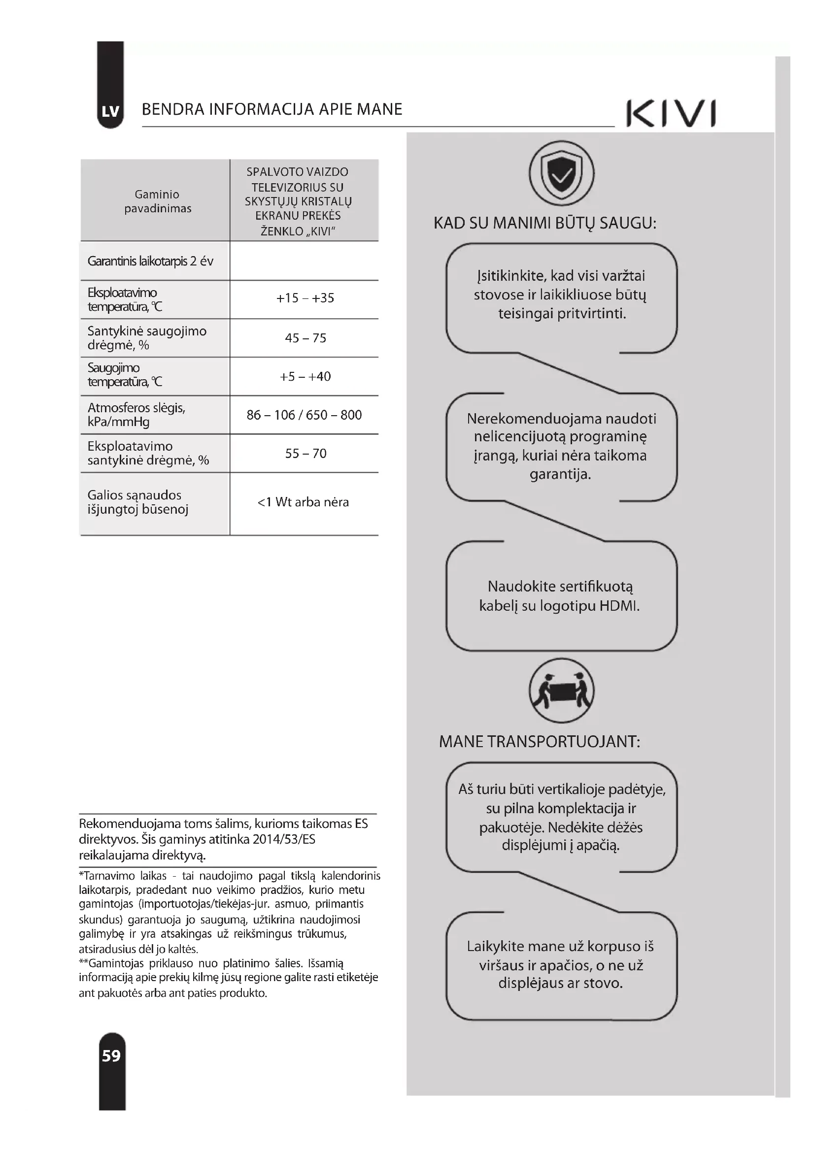 *Tarnavimo laikas - tai naudojimo pagal tikslą kalendorinis laikotarpis, pradedant nuo veikimo pradžios, kurio metu gamintojas (importuotojas/tiekėjas-jur. asmuo, priimantis skundus) garantuoja jo saugumą, užtikrina naudojimosi galimybę ir yra atsakingas už reikšmingus trūkumus, atsiradusius dėl jo kaltės. **Gamintojas priklauso nuo platinimo šalies. Išsamią informaciją apie prekių kilmę jūsų regione galite rasti etiketėje ant pakuotės arba ant paties produkto. Rekomenduojama toms šalims, kurioms taikomas ES direktyvos. Šis gaminys atitinka 2014/53/ES reikalaujama direktyvą. MANE TRANSPORTUOJANT: Aš turiu būti vertikalioje padėtyje, su pilna komplektacija ir pakuotėje. Nedėkite dėžės displėjumi į apačią. Laikykite mane už korpuso iš viršaus ir apačios, o ne už displėjaus ar stovo. Naudokite sertifikuotą kabelį su logotipu HDMI. Nerekomenduojama naudoti nelicencijuotą programinę įrangą, kuriai nėra taikoma garantija. Įsitikinkite, kad visi varžtai stovose ir laikikliuose būtų teisingai pritvirtinti. KAD SU MANIMI BŪTŲ SAUGU: Gaminio pavadinimas SPALVOTO VAIZDO TELEVIZORIUS SU