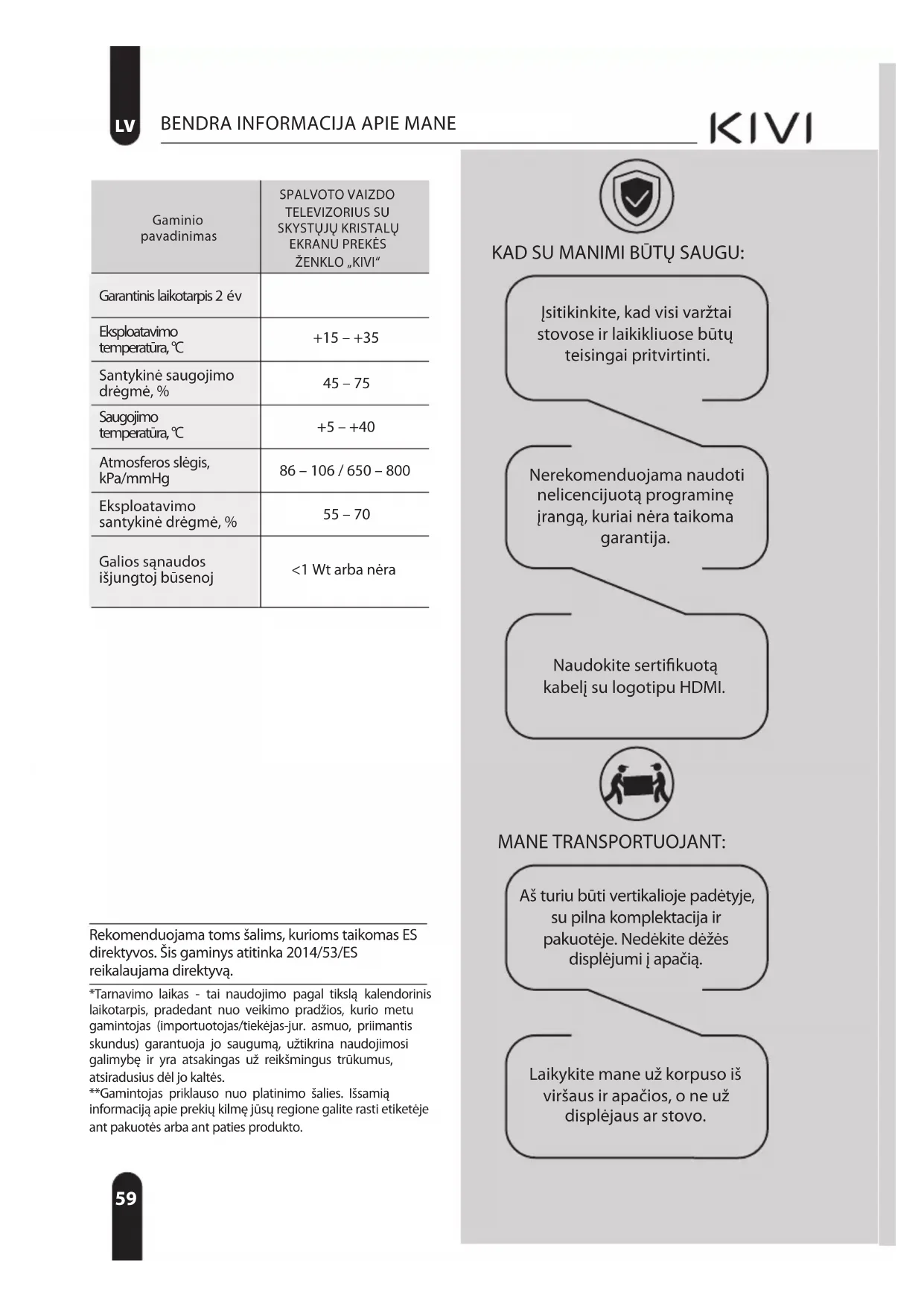 *Tarnavimo laikas - tai naudojimo pagal tikslą kalendorinis laikotarpis, pradedant nuo veikimo pradžios, kurio metu gamintojas (importuotojas/tiekėjas-jur. asmuo, priimantis skundus) garantuoja jo saugumą, užtikrina naudojimosi galimybę ir yra atsakingas už reikšmingus trūkumus, atsiradusius dėl jo kaltės. **Gamintojas priklauso nuo platinimo šalies. Išsamią informaciją apie prekių kilmę jūsų regione galite rasti etiketėje ant pakuotės arba ant paties produkto. Rekomenduojama toms šalims, kurioms taikomas ES direktyvos. Šis gaminys atitinka 2014/53/ES reikalaujama direktyvą. MANE TRANSPORTUOJANT: Aš turiu būti vertikalioje padėtyje, su pilna komplektacija ir pakuotėje. Nedėkite dėžės displėjumi į apačią. Laikykite mane už korpuso iš viršaus ir apačios, o ne už displėjaus ar stovo. Naudokite sertifikuotą kabelį su logotipu HDMI. Nerekomenduojama naudoti nelicencijuotą programinę įrangą, kuriai nėra taikoma garantija. Įsitikinkite, kad visi varžtai stovose ir laikikliuose būtų teisingai pritvirtinti. KAD SU MANIMI BŪTŲ SAUGU: Gaminio pavadinimas SPALVOTO VAIZDO TELEVIZORIUS SU