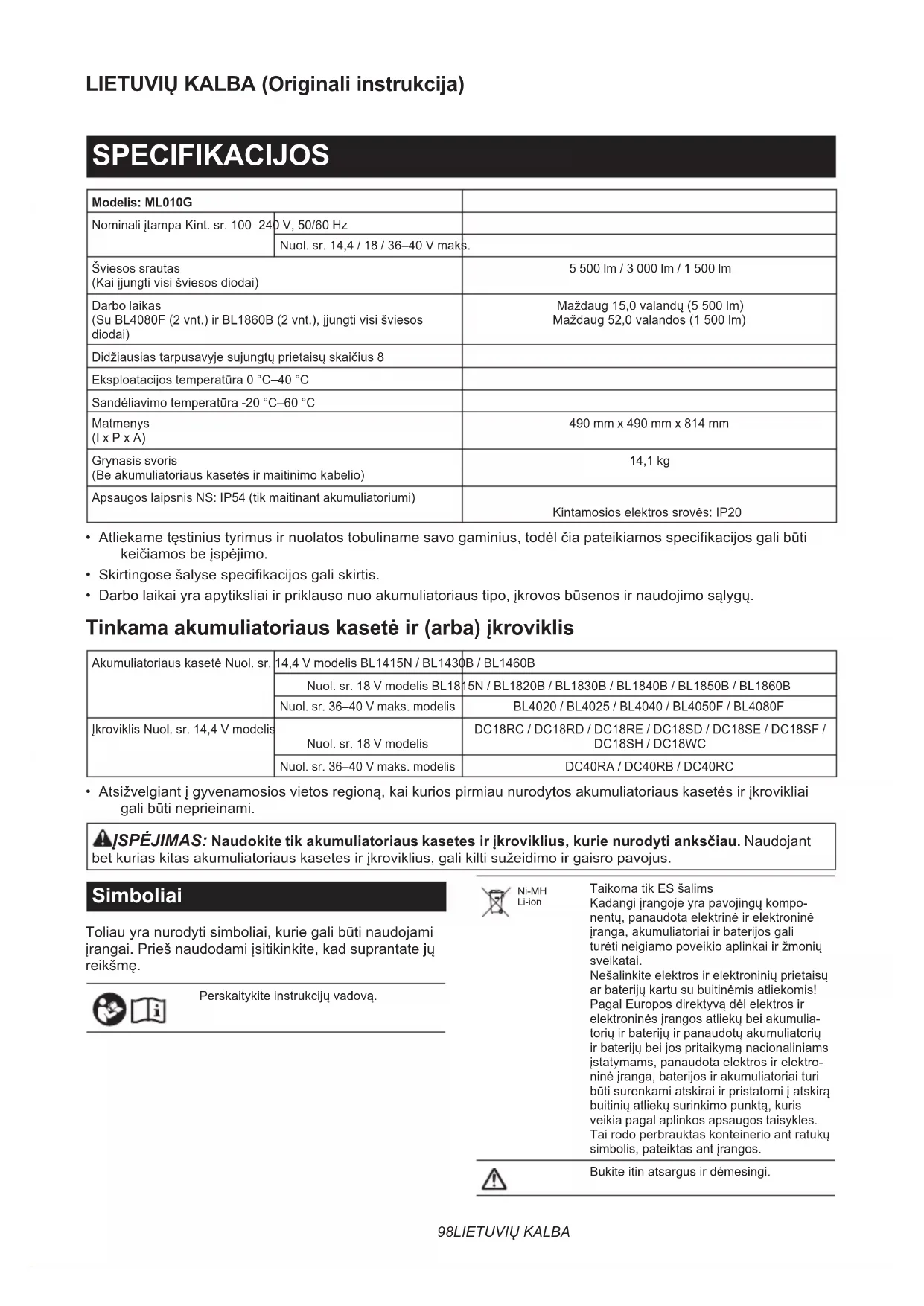 ML010G - Apšvietimas MAKITA - Nemokama naudojimo instrukcija