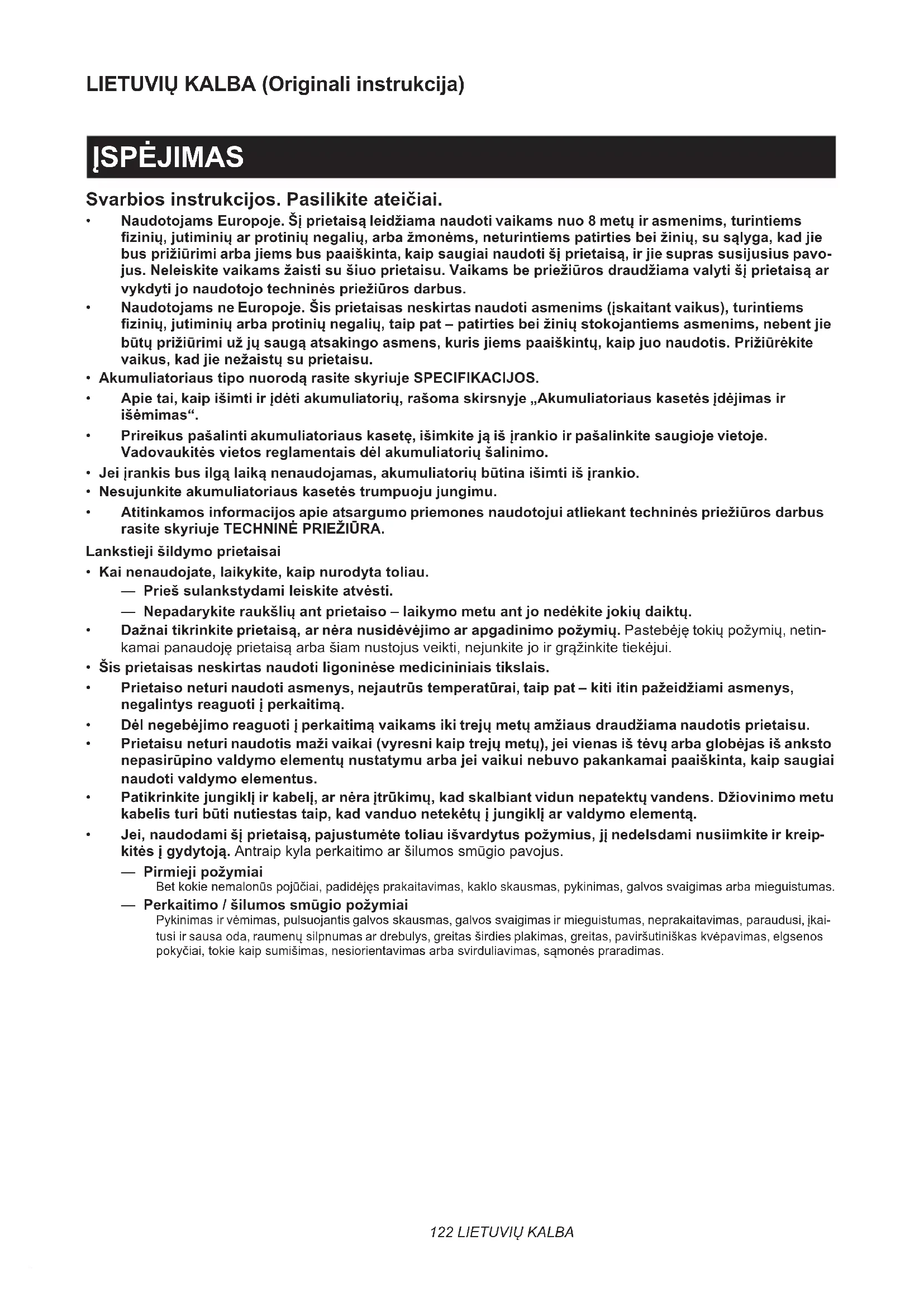 LIETUVIŲ KALBA (Originali instrukcija) ĮSPĖJIMAS Svarbios instrukcijos. Pasilikite ateičiai.