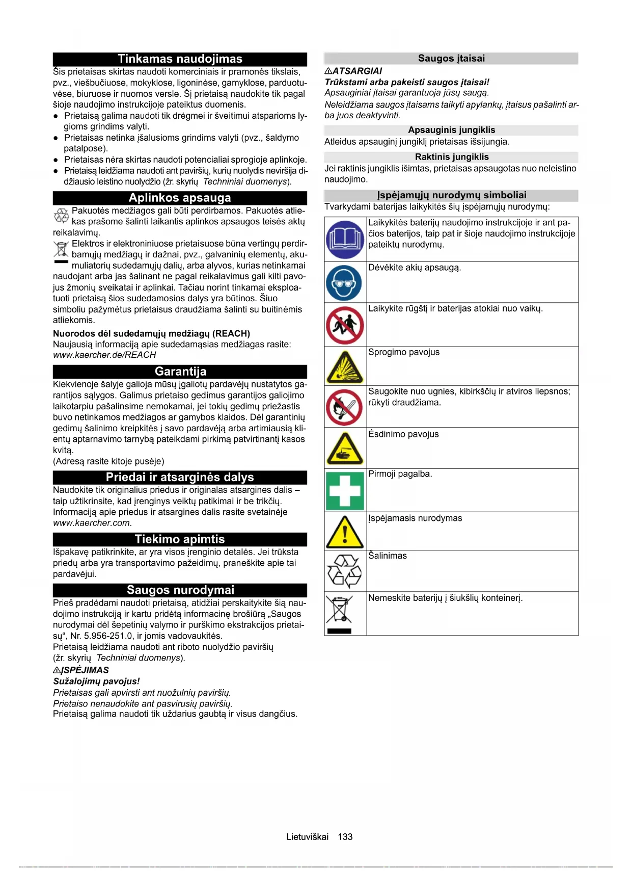 • ES atitikties deklaracija Lietuviškai 133 Tinkamas naudojimas Šis prietaisas skirtas naudoti komerciniais ir pramonės tikslais, pvz., viešbučiuose, mokyklose, ligoninėse, gamyklose, parduotu- vėse, biuruose ir nuomos versle. Šį prietaisą naudokite tik pagal šioje naudojimo instrukcijoje pateiktus duomenis. ● Prietaisą galima naudoti tik drėgmei ir šveitimui atsparioms ly- gioms grindims valyti. ● Prietaisas netinka įšalusioms grindims valyti (pvz., šaldymo patalpose). ● Prietaisas nėra skirtas naudoti potencialiai sprogioje aplinkoje. ● Prietaisą leidžiama naudoti ant paviršių, kurių nuolydis neviršija di- džiausio leistino nuolydžio (žr. skyrių Techniniai duomenys). Aplinkos apsauga Pakuotės medžiagos gali būti perdirbamos. Pakuotės atlie- kas prašome šalinti laikantis aplinkos apsaugos teisės aktų reikalavimų. Elektros ir elektroniniuose prietaisuose būna vertingų perdir- bamųjų medžiagų ir dažnai, pvz., galvaninių elementų, aku- muliatorių sudedamųjų dalių, arba alyvos, kurias netinkamai naudojant arba jas šalinant ne pagal reikalavimus gali kilti pavo- jus žmonių sveikatai ir aplinkai. Tačiau norint tinkamai eksploa- tuoti prietaisą šios sudedamosios dalys yra būtinos. Šiuo simboliu pažymėtus prietaisus draudžiama šalinti su buitinėmis atliekomis. Nuorodos dėl sudedamųjų medžiagų (REACH) Naujausią informaciją apie sudedamąsias medžiagas rasite: www.kaercher.de/REACH Garantija Kiekvienoje šalyje galioja mūsų įgaliotų pardavėjų nustatytos ga- rantijos sąlygos. Galimus prietaiso gedimus garantijos galiojimo laikotarpiu pašalinsime nemokamai, jei tokių gedimų priežastis buvo netinkamos medžiagos ar gamybos klaidos. Dėl garantinių gedimų šalinimo kreipkitės į savo pardavėją arba artimiausią kli- entų aptarnavimo tarnybą pateikdami pirkimą patvirtinantį kasos kvitą. (Adresą rasite kitoje pusėje) Priedai ir atsarginės dalys Naudokite tik originalius priedus ir originalas atsargines dalis – taip užtikrinsite, kad įrenginys veiktų patikimai ir be trikčių. Informaciją apie priedus ir atsargines dalis rasite svetainėje www.kaercher.com. Tiekimo apimtis Išpakavę patikrinkite, ar yra visos įrenginio detalės. Jei trūksta priedų arba yra transportavimo pažeidimų, praneškite apie tai pardavėjui. Saugos nurodymai Prieš pradėdami naudoti prietaisą, atidžiai perskaitykite šią nau- dojimo instrukciją ir kartu pridėtą informacinę brošiūrą „Saugos nurodymai dėl šepetinių valymo ir purškimo ekstrakcijos prietai- sų“, Nr. 5.956-251.0, ir jomis vadovaukitės. Prietaisą leidžiama naudoti ant riboto nuolydžio paviršių (žr. skyrių Techniniai duomenys). 몇 ĮSPĖJIMAS Sužalojimų pavojus! Prietaisas gali apvirsti ant nuožulnių paviršių. Prietaiso nenaudokite ant pasvirusių paviršių. Prietaisą galima naudoti tik uždarius gaubtą ir visus dangčius. Saugos įtaisai 몇 ATSARGIAI Trūkstami arba pakeisti saugos įtaisai! Apsauginiai įtaisai garantuoja jūsų saugą. Neleidžiama saugos įtaisams taikyti apylankų, įtaisus pašalinti ar- ba juos deaktyvinti. Apsauginis jungiklis Atleidus apsauginį jungiklį prietaisas išsijungia. Raktinis jungiklis Jei raktinis jungiklis išimtas, prietaisas apsaugotas nuo neleistino naudojimo. Įspėjamųjų nurodymų simboliai Tvarkydami baterijas laikykitės šių įspėjamųjų nurodymų: Laikykitės baterijų naudojimo instrukcijoje ir ant pa- čios baterijos, taip pat ir šioje naudojimo instrukcijoje pateiktų nurodymų. Dėvėkite akių apsaugą. Laikykite rūgštį ir baterijas atokiai nuo vaikų. Sprogimo pavojus Saugokite nuo ugnies, kibirkščių ir atviros liepsnos; rūkyti draudžiama. Ėsdinimo pavojus Pirmoji pagalba. Įspėjamasis nurodymas Šalinimas Nemeskite baterijų į šiukšlių konteinerį.134 Lietuviškai Prietaiso aprašymas Priekinės dalies apžvalga Paveikslas A 1 Stumiamoji rankena 2 Apsauginis jungiklis 3 Nešvaraus vandens talpyklos dangtis 4 „Homebase“ atraminis kreipiklis 5 Nešvaraus vandens talpykla 6 **Baterija 7 Švaraus vandens filtras 8 Švaraus vandens talpyklos dangtelis 9 Šepečių keitimo pedalas 10 Diskinis šepetys 11 Švaraus vandens talpykla 12 Žarnos laikiklis 13 Švaraus vandens talpyklos pildymo anga ** Į tiekimo rinkinį neįtraukiama Galinės dalies apžvalga Paveikslas B 1 Nešvaraus vandens išleidimo žarna su dozavimo įtaisu 2 Valymo galvutė 3 Šepečių keitimo pedalas 4 Siurbimo žarna 5 Siurbimo sijos polinkio reguliavimas 6 Siurbimo sijos tvirtinimo sparnuotoji veržlė 7 Siurbimo sijos aukščio reguliavimas 8 Siurbimo sija 9 Švaraus vandens pripildymo lygio indikatorius Švaraus vandens išleidimo žarna 10 Valymo galvutės svirtis 11 Vandens kiekio reguliavimo rankenėlė 12 Siurbimo sijos svirtis 13 Baterijos kištukas 14 Raktinis jungiklis 15 Ekranas 16 Darbo spartos reguliatorius 17 Važiavimo krypties jungiklis R galvutės apžvalga Paveikslas D 1 R galvutė 2 Nukreipiantysis ritinėlis 3 Vandens paskirstymo briauna 4 Šoninis purvasaugis 5 Nešvarumų talpykla Nešvaraus vandens talpyklos apžvalga Paveikslas E 1 Stambiųjų nešvarumų dalelių sietas 2 Pūkelių filtravimo sietelis 3 Plūdė Identifikacinė plokštelė Paveikslas C 1 Identifikacinė plokštelė Spalvinis ženklinimas ● Valymo proceso valdymo elementai yra geltoni. ● Techninės priežiūros ir aptarnavimo elementai yra šviesiai žali. Simboliai ant prietaiso p. 141