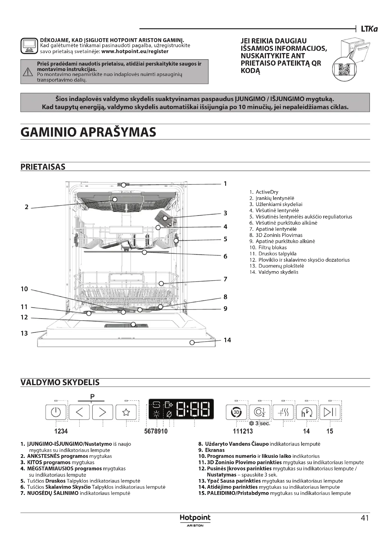 KODĄ DĖKOJAME, KAD ĮSIGIJOTE HOTPOINT ARISTON GAMINĮ. Kad galėtumėte tinkamai pasinaudoti pagalba, užregistruokite savo prietaisą svetainėje: www.hotpoint.eu/registerPrieš pradėdami naudotis prietaisu, atidžiai perskaitykite saugos ir montavimo instrukcijas.Po montavimo nepamirškite nuo indaplovės nuimti apsauginių transportavimo dalių.