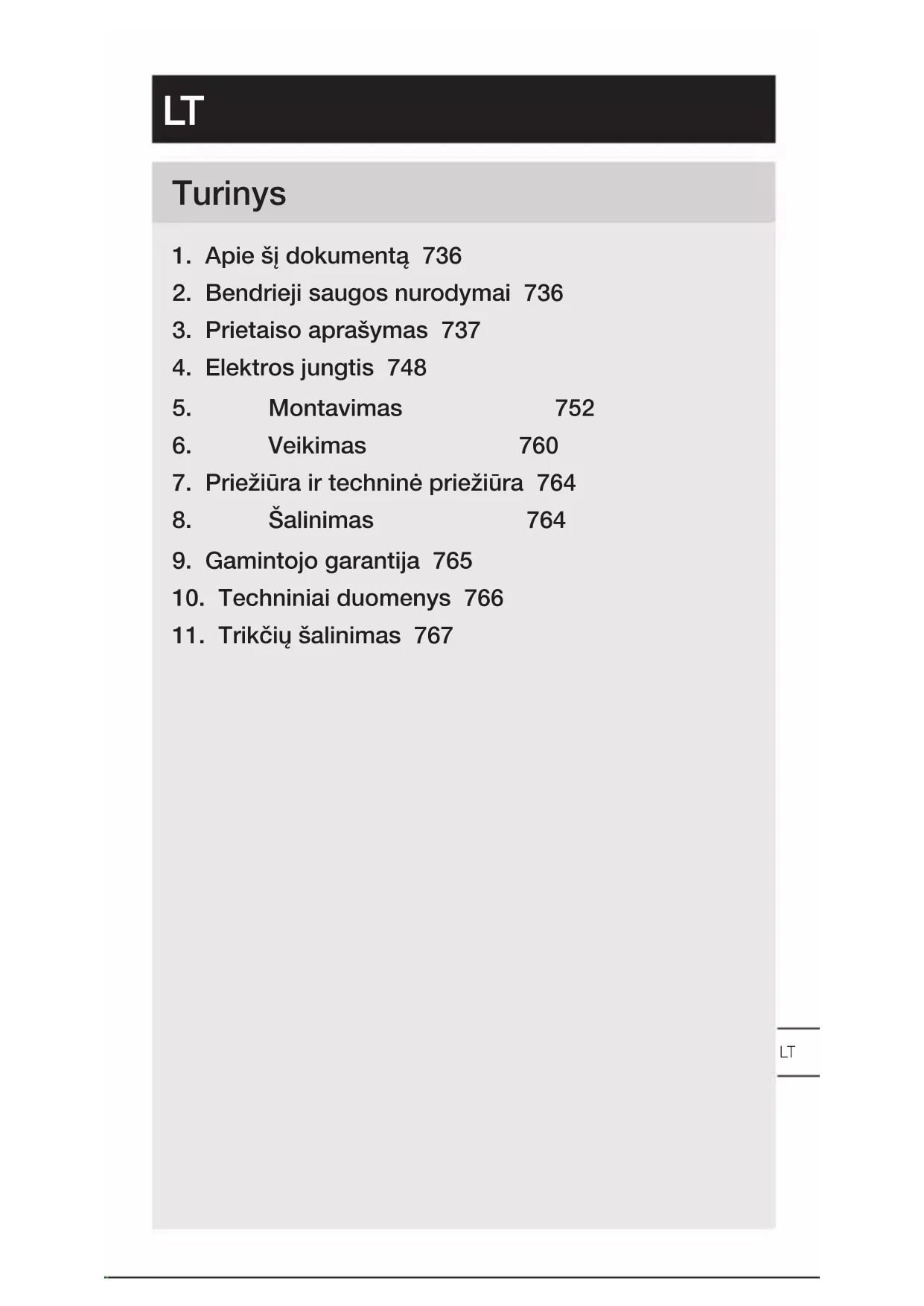 - Laikykite pasiekiamoje vietoje. – Dirbant su elektros srove galimos pavojingos situacijos. Prisilietus prie dalių, kuriomis teka srovė, galima patirti smūgį, nudegimus arba žūti. – Darbus, susijusius su tinklo įtampa, gali atlikti tik kvalifi- kuoti darbuotojai. – Būtina laikytis šalyje galiojančių įrengimo instrukcijų ir prijungimo reikalavimų (pvz., D: VDE 0100, A: ÖVE-ÖNORM E8001-1, CH: SEV 1000). – Naudokite tik originalias atsargines dalis.LT – 737 – Turinys – Remontą gali atlikti tik specializuotos įmonės.