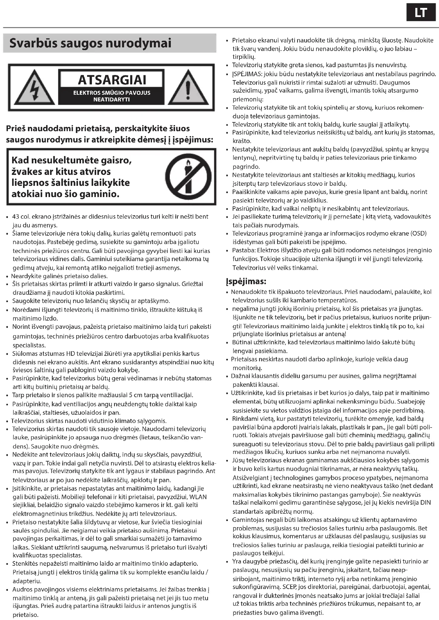 Prieš naudodami prietaisą, perskaitykite šiuos saugos nurodymus ir atkreipkite dėmesį į įspėjimus: Kad nesukeltumėte gaisro, žvakes ar kitus atviros liepsnos šaltinius laikykite atokiai nuo šio gaminio.
