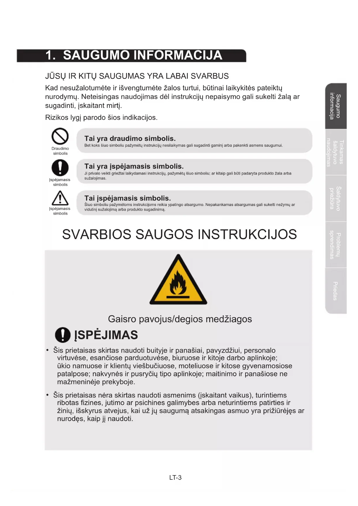 - Šis prietaisas nėra skirtas naudoti asmenims (įskaitant vaikus), turintiems ribotas zines, jutimo ar psichines galimybes arba neturintiems patirties ir žinių, išskyrus atvejus, kai už jų saugumą atsakingas asmuo yra prižiūrėjęs ar nurodęs, kaip jį naudoti.LT-4 Saugumo informacija Saugumo informacija Tinkamas šaldytuvo naudojimas Tinkamas šaldytuvo naudojimas Šaldytuvo priežiūra Šaldytuvo priežiūra Problemų sprendimas Priedas Problemų sprendimas Priedas