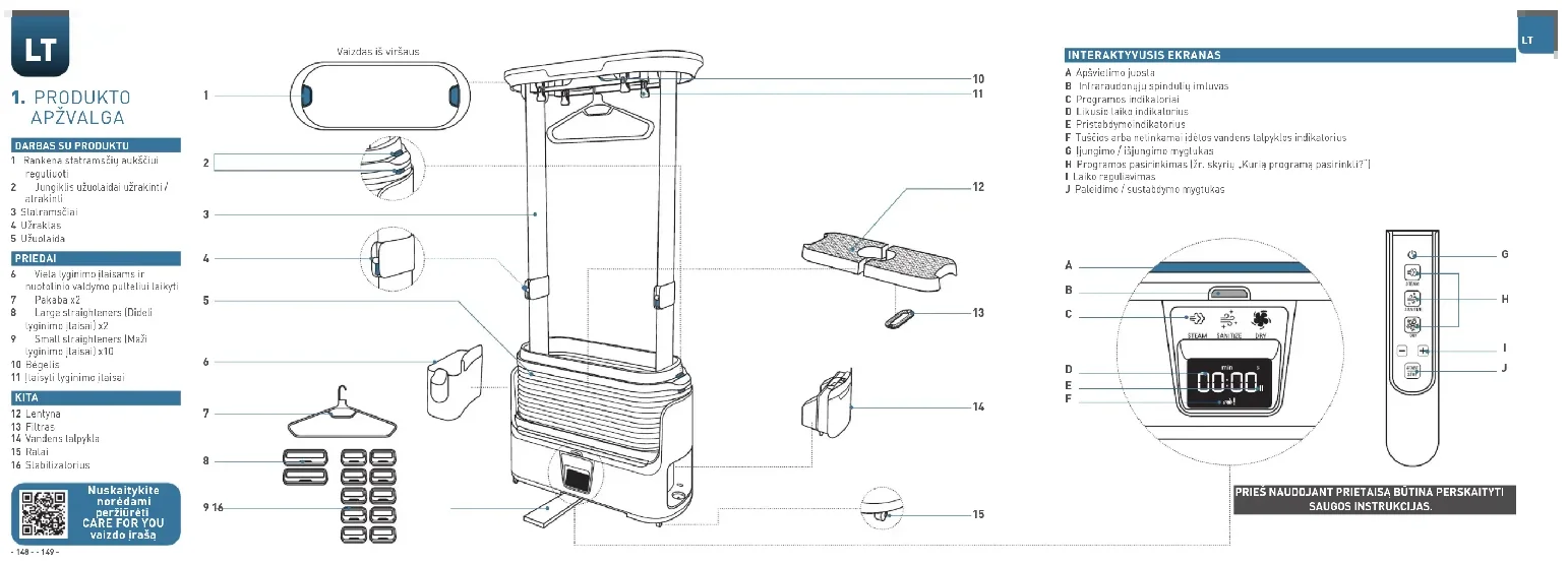 1 Rankena statramsčių aukščiui reguliuoti 2 Jungiklis užuolaidai užrakinti / atrakinti 3 Statramsčiai 4 Užraktas 5 Užuolaida PRIEDAI 6 Vieta lyginimo įtaisams ir nuotolinio valdymo pulteliui laikyti 7 Pakaba x2 8 Large straighteners (Dideli lyginimo įtaisai) x2 9 Small straighteners (Maži lyginimo įtaisai) x10 10 Bėgelis 11 Įtaisyti lyginimo įtaisai KITA 12 Lentyna 13 Filtras 14 Vandens talpykla 15 Ratai 16 Stabilizatorius Vaizdas iš viršaus Nuskaitykite norėdami peržiūrėti