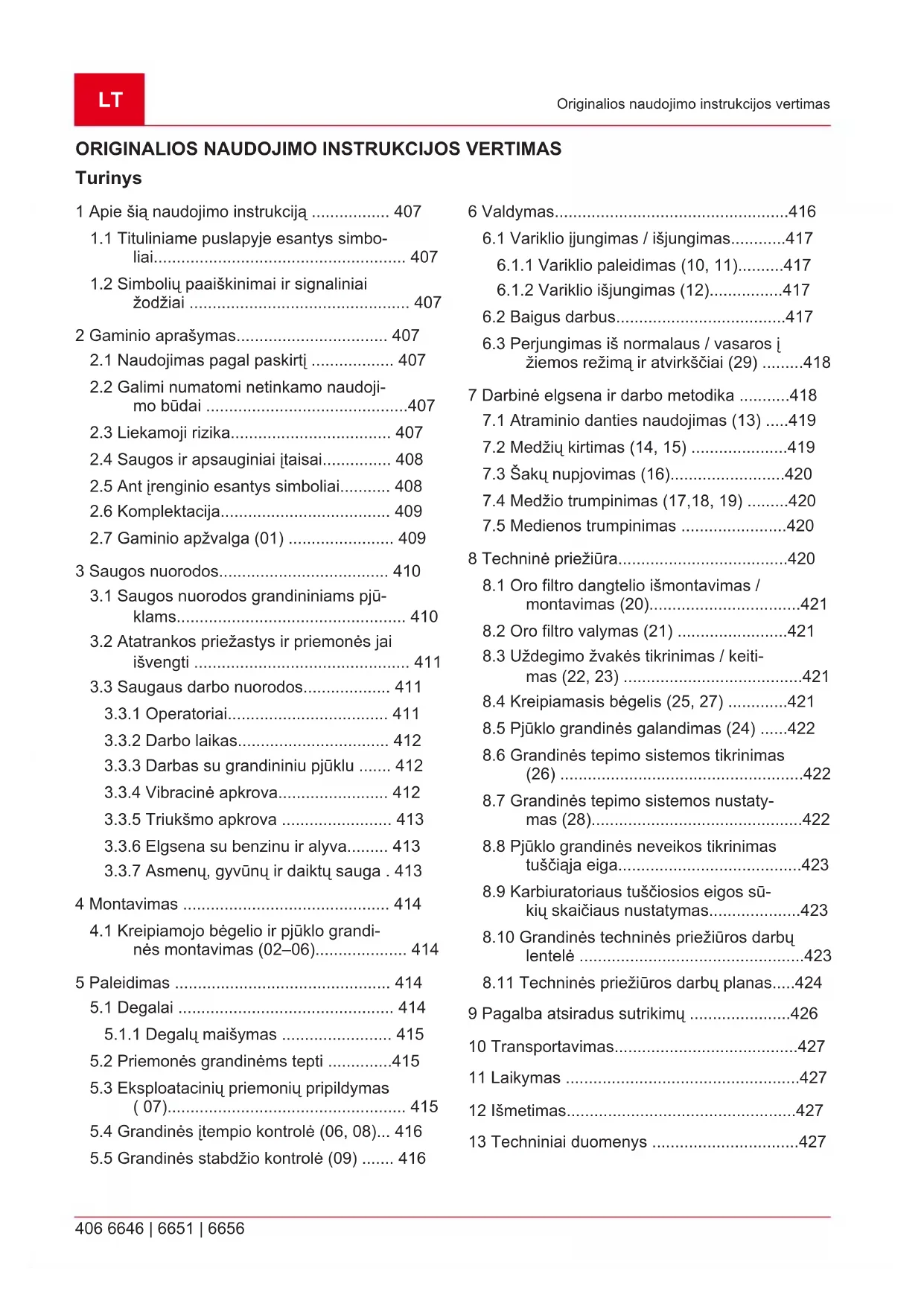 Sąlytis su atvirais grandinės dantimis (pavo- jus įsipjauti).LT 408 6646 | 6651 | 6656 Gaminio aprašymas