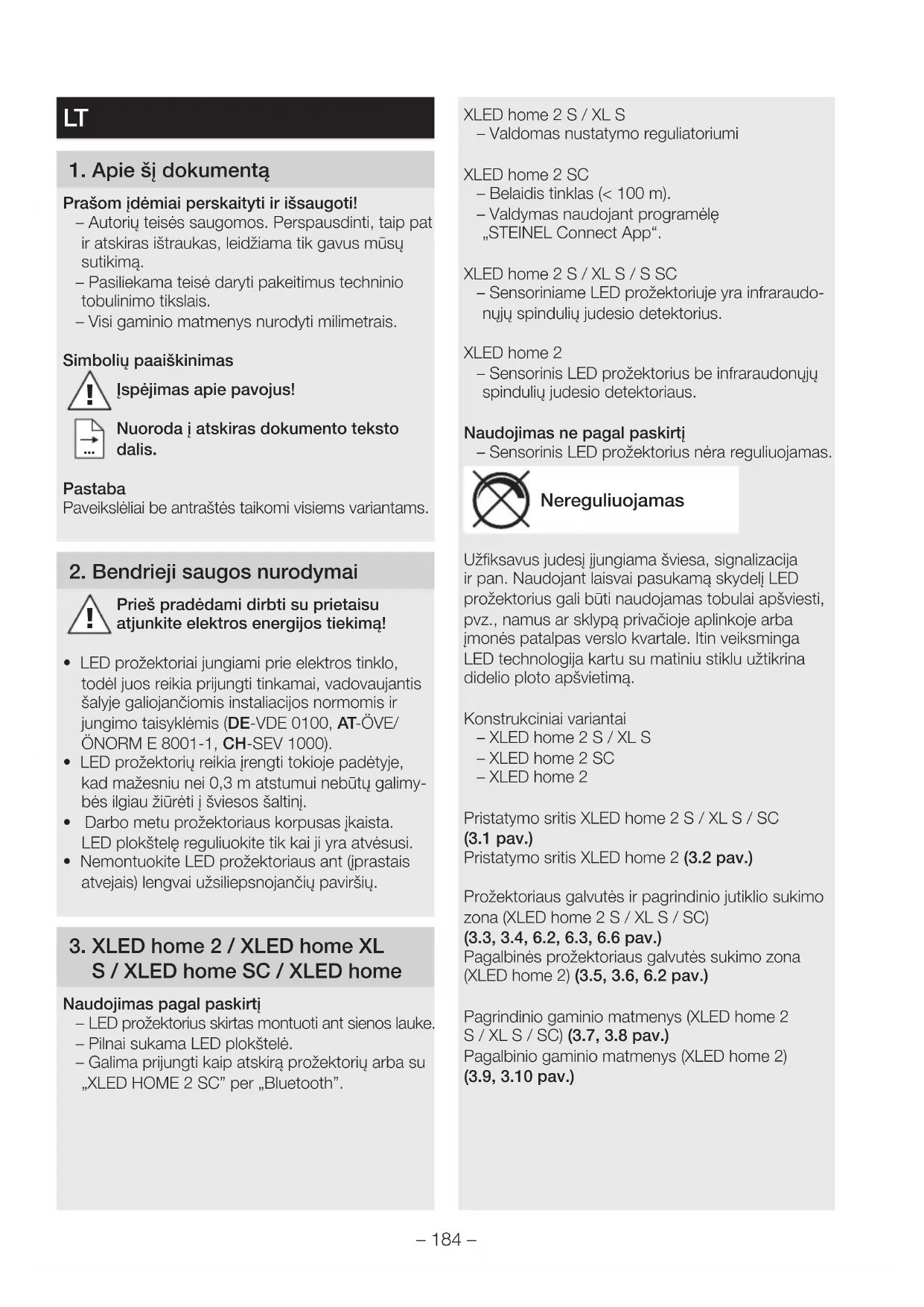S/XLEDhome SC/XLEDhome Naudojimas pagal paskirtį – LED prožektorius skirtas montuoti ant sienos lauke. – Pilnai sukama LED plokštelė. – Galima prijungti kaip atskirą prožektorių arba su „XLED HOME 2 SC” per „Bluetooth”. XLEDhome2 S/XL S – Valdomas nustatymo reguliatoriumi XLEDhome2 SC – Belaidis tinklas (<100m). – Valdymas naudojant programėlę „STEINEL Connect App“. XLED home 2 S/XL S/S SC – Sensoriniame LED prožektoriuje yra infraraudo- nųjų spindulių judesio detektorius. XLED home 2 – Sensorinis LED prožektorius be infraraudonųjų spindulių judesio detektoriaus. Naudojimas ne pagal paskirtį – Sensorinis LED prožektorius nėra reguliuojamas. Nereguliuojamas Užfiksavus judesį įjungiama šviesa, signalizacija ir pan. Naudojant laisvai pasukamą skydelį LED prožektorius gali būti naudojamas tobulai apšviesti, pvz., namus ar sklypą privačioje aplinkoje arba įmonės patalpas verslo kvartale. Itin veiksminga LED technologija kartu su matiniu stiklu užtikrina didelio ploto apšvietimą. Konstrukciniai variantai – XLEDhome2 S/XL S – XLEDhome2SC – XLEDhome2 Pristatymo sritis XLED home 2 S/XL S/SC (3.1 pav.) Pristatymo sritis XLEDhome2 (3.2 pav.) Prožektoriaus galvutės ir pagrindinio jutiklio sukimo zona (XLED home 2 S/XL S/SC) (3.3,3.4,6.2,6.3,6.6 pav.) Pagalbinės prožektoriaus galvutės sukimo zona (XLEDhome2) (3.5,3.6,6.2 pav.) Pagrindinio gaminio matmenys (XLED home 2 S/XL S/SC) (3.7,3.8 pav.) Pagalbinio gaminio matmenys (XLED home 2) (3.9,3.10 pav.)– 185 –