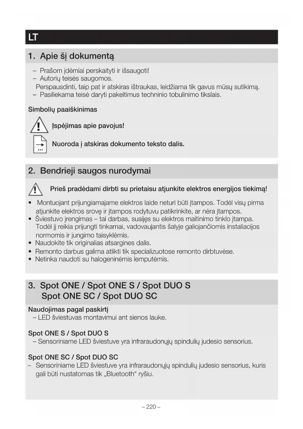 20° cd / 1000 lm 072C / 09C081C / 0C Sensorinė technika Spot ONE/DUO S, ONE/DUO SC: Pasyvūs infraraudonieji spinduliai Jautrumo zona: jautrumo zonos kampas Spot ONE/DUO S, ONE/DUO SC: 90° Jautrumo zona Atverties kampas Spot ONE/DUO S, ONE/DUO SC: 90° LT– 228 – Jautrumo zona Spot ONE/DUO S, ONE/DUO SC: maks. 10m Patarimas dėl lempučių GU10 LED lemputė (maks. 9 W) Švietimo trukmės nustatymas Spot ONE/DUO S: 8s – 35 min. Spot ONE/DUO SC: 5 s – 60min. Prieblandos lygio nustatymas Spot ONE/DUO S: 2 – 1.000liuksų Spot ONE/DUO SC: 2 – 2.000 liuksų Saugos klasė IP44 Apsaugos klasė I Aplinkos temperatūra -20 – +40 °C „Bluetooth“ dažnis Spot ONE/DUO SC: 2,4 – 2,48GHz „Bluetooth“ siuntimo galia Spot ONE/DUO SC: 5dBm/3mW Energinio veiksmingumo klasė Šiame gaminyje yra vienas / du „F“ energinio veiksmingumo klasės šviesos šaltinis / šaltiniai.