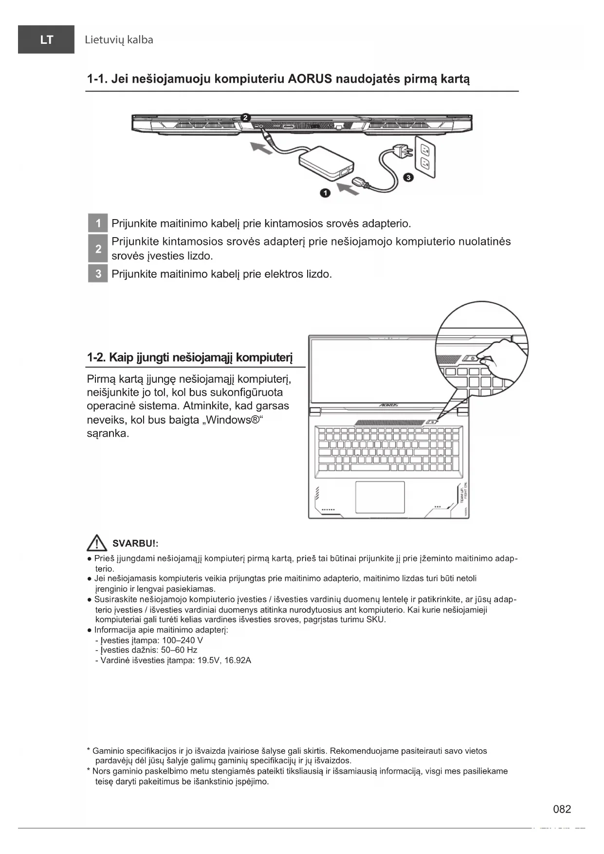 Prijunkite maitinimo kabelį prie elektros lizdo. 1-2. Kaip įjungti nešiojamąjį kompiuterį Pirmą kartą įjungę nešiojamąjį kompiuterį, neišjunkite jo tol, kol bus sukongūruota operacinė sistema. Atminkite, kad garsas neveiks, kol bus baigta „Windows®“ sąranka. SVARBU!: ● Prieš įjungdami nešiojamąjį kompiuterį pirmą kartą, prieš tai būtinai prijunkite jį prie įžeminto maitinimo adap- terio.● Jei nešiojamasis kompiuteris veikia prijungtas prie maitinimo adapterio, maitinimo lizdas turi būti netoli įrenginio ir lengvai pasiekiamas. ● Susiraskite nešiojamojo kompiuterio įvesties / išvesties vardinių duomenų lentelę ir patikrinkite, ar jūsų adap- terio įvesties / išvesties vardiniai duomenys atitinka nurodytuosius ant kompiuterio. Kai kurie nešiojamieji kompiuteriai gali turėti kelias vardines išvesties sroves, pagrįstas turimu SKU.● Informacija apie maitinimo adapterį: - Įvesties įtampa: 100–240 V - Įvesties dažnis: 50–60 Hz - Vardinė išvesties įtampa: 19.5V, 16.92A* Gaminio specikacijos ir jo išvaizda įvairiose šalyse gali skirtis. Rekomenduojame pasiteirauti savo vietos pardavėjų dėl jūsų šalyje galimų gaminių specikacijų ir jų išvaizdos. * Nors gaminio paskelbimo metu stengiamės pateikti tiksliausią ir išsamiausią informaciją, visgi mes pasiliekame teisę daryti pakeitimus be išankstinio įspėjimo.Lietuvių kalba