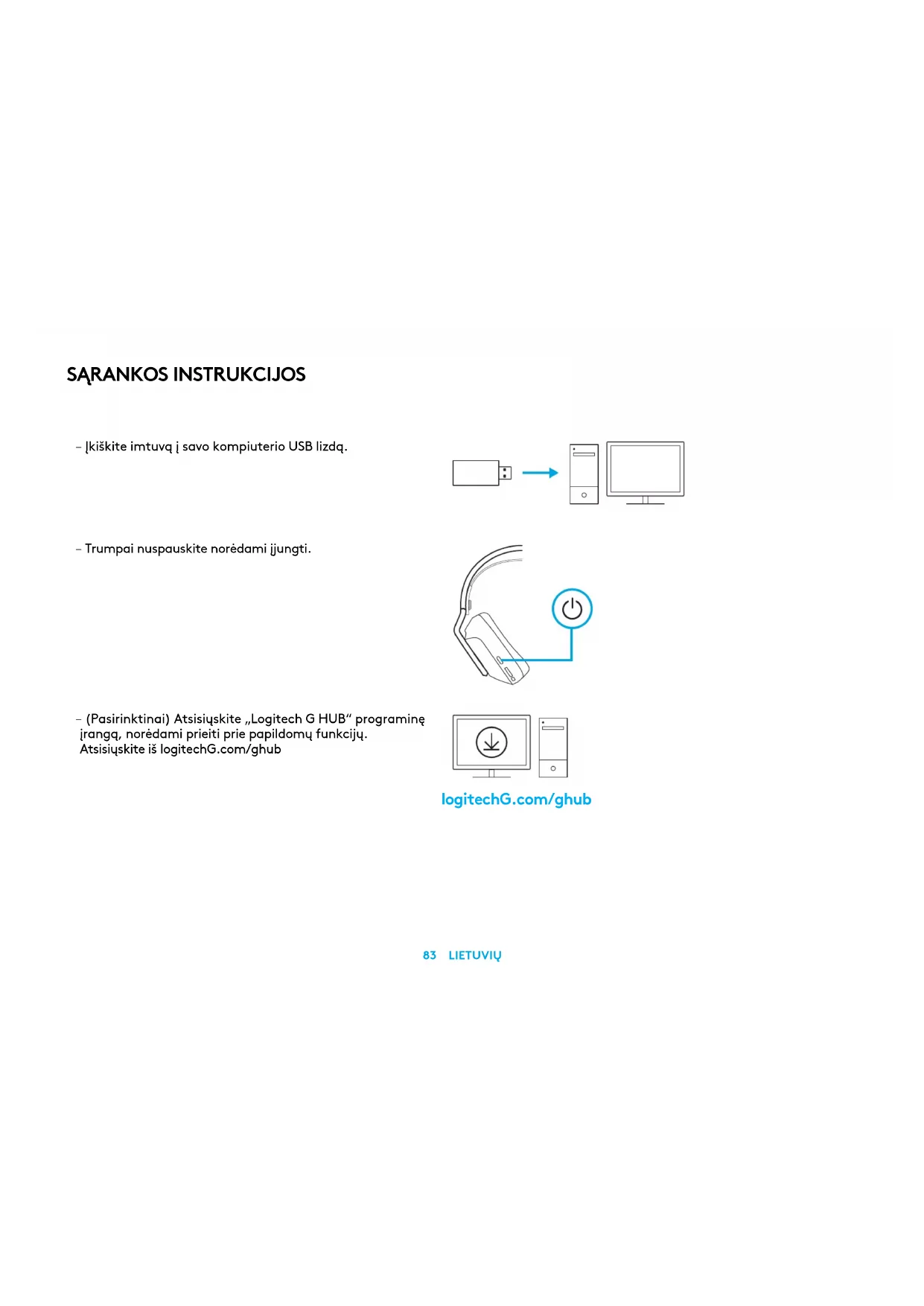 – Įkiškite imtuvą į savo kompiuterio USB lizdą. – Trumpai nuspauskite norėdami įjungti. – (Pasirinktinai) Atsisiųskite „Logitech G HUB“ programinę įrangą, norėdami prieiti prie papildomų funkcijų. Atsisiųskiteiš logitechG.com/ghub logitechG.com/ghub84 LIETUVIŲ – Ausinių pagalvėles galima reguliuoti traukiant aukštyn iržemyn. – Taip pat galima reguliuoti lankelio ilgį.85 LIETUVIŲ – Pajudinkite mikrofono stiebą aukštyn norėdami nutildyti. – Įkraukite ausines, kai akumuliatorius išsekęs.86 LIETUVIŲ FUNKCIJOS 1 Reguliuojama, apgręžiama juosta 2 Prisitaikančios ausinių pagalvėlės 3 40mm keitliai 4 Garsumo valdiklis ant ausinės 5 Nutildomas 6mm mikrofonas 6 USB-C įkrovimo jungtis
