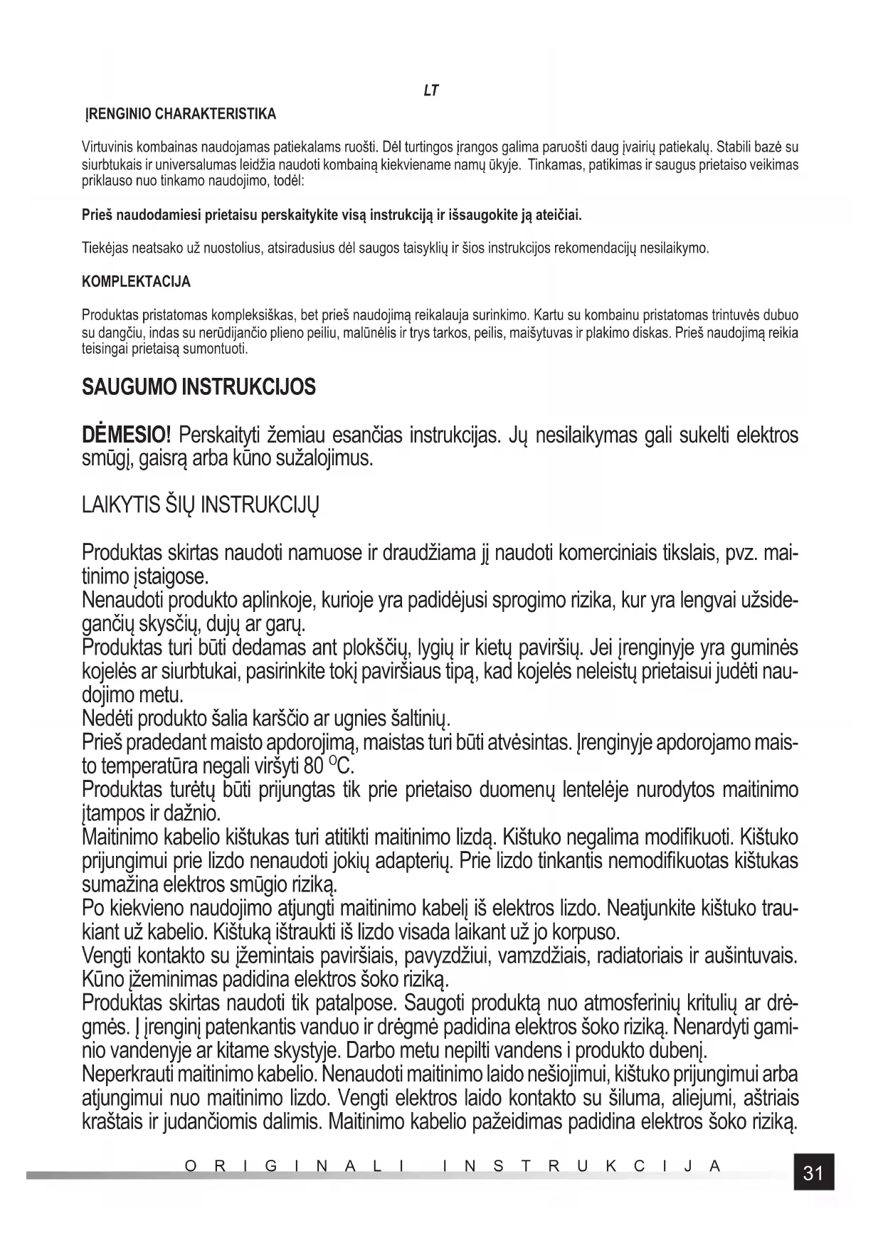 Produktas turėtų būti prijungtas tik prie prietaiso duomenų lentelėje nurodytos maitinimo įtampos ir dažnio. Maitinimo kabelio kištukas turi atitikti maitinimo lizdą. Kištuko negalima modifi kuoti. Kištuko prijungimui prie lizdo nenaudoti jokių adapterių. Prie lizdo tinkantis nemodifi kuotas kištukas sumažina elektros smūgio riziką. Po kiekvieno naudojimo atjungti maitinimo kabelį iš elektros lizdo. Neatjunkite kištuko trau- kiant už kabelio. Kištuką ištraukti iš lizdo visada laikant už jo korpuso. Vengti kontakto su įžemintais paviršiais, pavyzdžiui, vamzdžiais, radiatoriais ir aušintuvais. Kūno įžeminimas padidina elektros šoko riziką. Produktas skirtas naudoti tik patalpose. Saugoti produktą nuo atmosferinių kritulių ar drė- gmės. Į įrenginį patenkantis vanduo ir drėgmė padidina elektros šoko riziką. Nenardyti gami- nio vandenyje ar kitame skystyje. Darbo metu nepilti vandens i produkto dubenį. Neperkrauti maitinimo kabelio. Nenaudoti maitinimo laido nešiojimui, kištuko prijungimui arba atjungimui nuo maitinimo lizdo. Vengti elektros laido kontakto su šiluma, aliejumi, aštriais kraštais ir judančiomis dalimis. Maitinimo kabelio pažeidimas padidina elektros šoko riziką.32 ORIGINALI INSTRUKCIJA