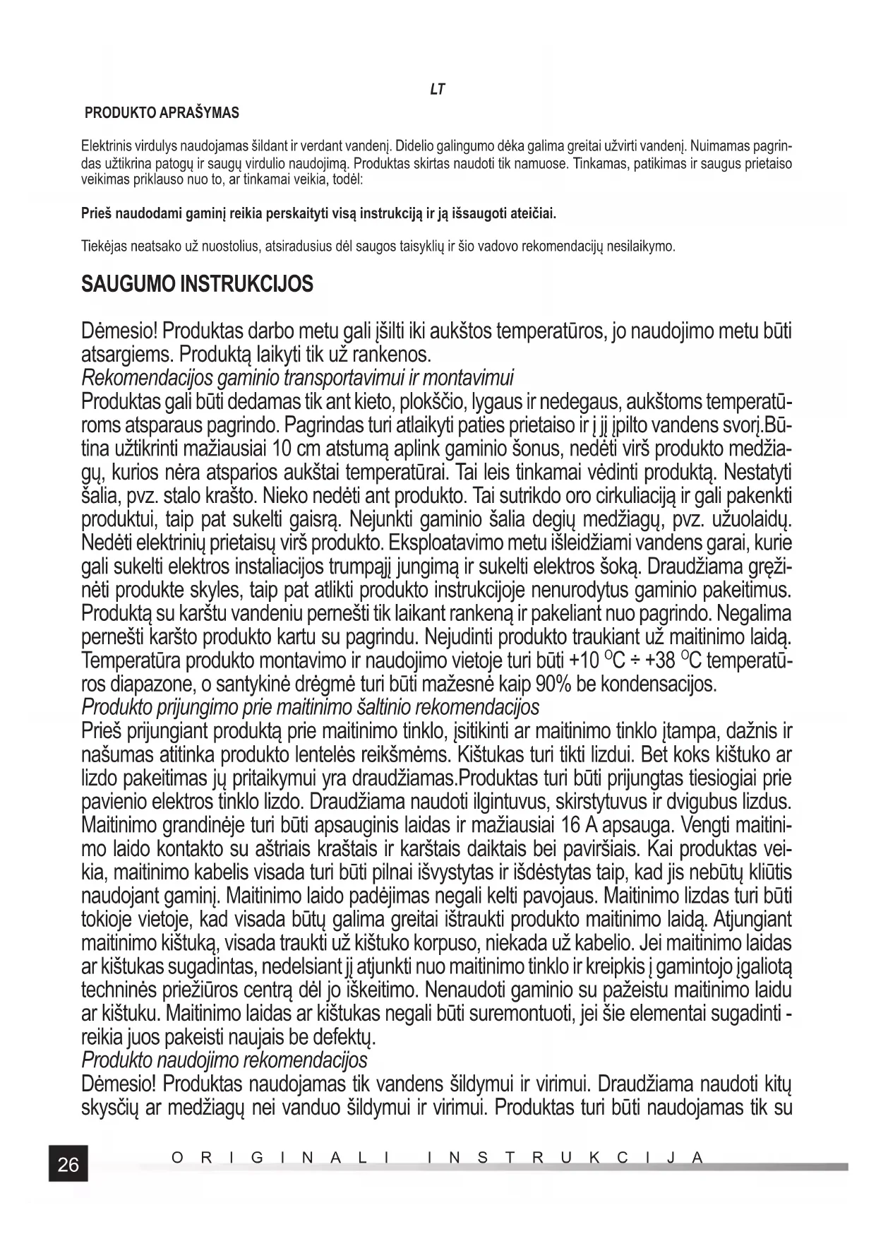 C temperatū- ros diapazone, o santykinė drėgmė turi būti mažesnė kaip 90% be kondensacijos. Produkto prijungimo prie maitinimo šaltinio rekomendacijos Prieš prijungiant produktą prie maitinimo tinklo, įsitikinti ar maitinimo tinklo įtampa, dažnis ir našumas atitinka produkto lentelės reikšmėms. Kištukas turi tikti lizdui. Bet koks kištuko ar lizdo pakeitimas jų pritaikymui yra draudžiamas.Produktas turi būti prijungtas tiesiogiai prie pavienio elektros tinklo lizdo. Draudžiama naudoti ilgintuvus, skirstytuvus ir dvigubus lizdus. Maitinimo grandinėje turi būti apsauginis laidas ir mažiausiai 16 A apsauga. Vengti maitini- mo laido kontakto su aštriais kraštais ir karštais daiktais bei paviršiais. Kai produktas vei- kia, maitinimo kabelis visada turi būti pilnai išvystytas ir išdėstytas taip, kad jis nebūtų kliūtis naudojant gaminį. Maitinimo laido padėjimas negali kelti pavojaus. Maitinimo lizdas turi būti tokioje vietoje, kad visada būtų galima greitai ištraukti produkto maitinimo laidą. Atjungiant maitinimo kištuką, visada traukti už kištuko korpuso, niekada už kabelio. Jei maitinimo laidas ar kištukas sugadintas, nedelsiant jį atjunkti nuo maitinimo tinklo ir kreipkis į gamintojo įgaliotą techninės priežiūros centrą dėl jo iškeitimo. Nenaudoti gaminio su pažeistu maitinimo laidu ar kištuku. Maitinimo laidas ar kištukas negali būti suremontuoti, jei šie elementai sugadinti - reikia juos pakeisti naujais be defektų. Produkto naudojimo rekomendacijos Dėmesio! Produktas naudojamas tik vandens šildymui ir virimui. Draudžiama naudoti kitų skysčių ar medžiagų nei vanduo šildymui ir virimui. Produktas turi bū ti naudojamas tik su27 ORIGINALI INSTRUKCIJA