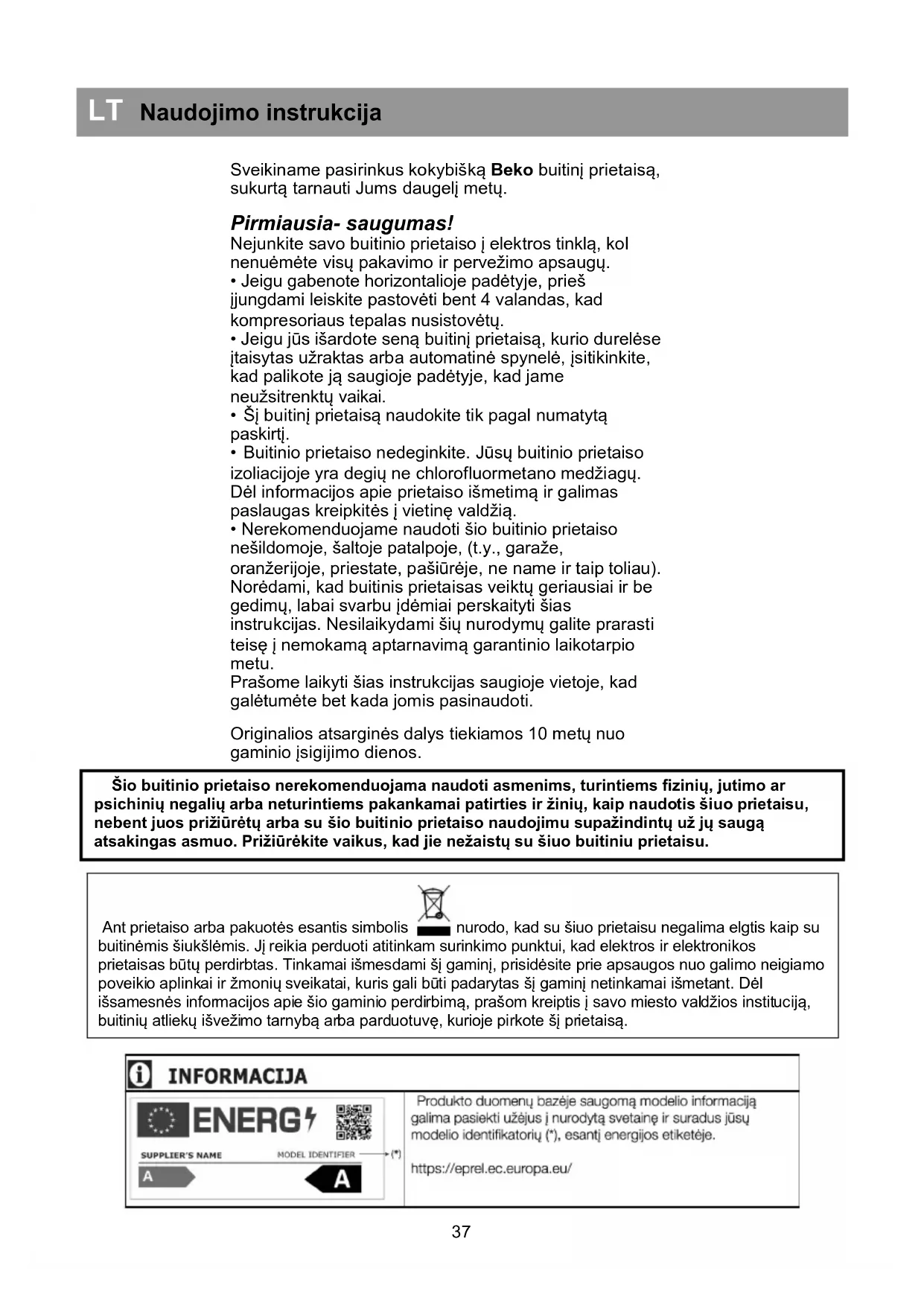 Pirmiausia- saugumas! /37 Elektros reikalavimai /38 Gabenimo instrukcijos /38 Instaliavimo instrukcijos /38 Susipažinkite su buitiniu prietaisu /38 Rekomenduojamas maisto produktų išdėstymas buitiniame prietaise /38 Temperatūros kontrolė ir reguliavimas /39 Prieš pradedant naudoti /39 Šaldytų maisto produktų laikymas /39 Šviežių maisto produktų užšaldymas /39 Ledo gabaliukų gaminimas /39 Atšildymas /39 Vidinės lemputės pakeitimas /40 Valymas ir priežiūra /40 Durelių perstatymas /40 Nurodymai /40 Energijos sąnaudos /41 Informacija apie garsus ir vibraciją /41 Gedimų šalinimas /41