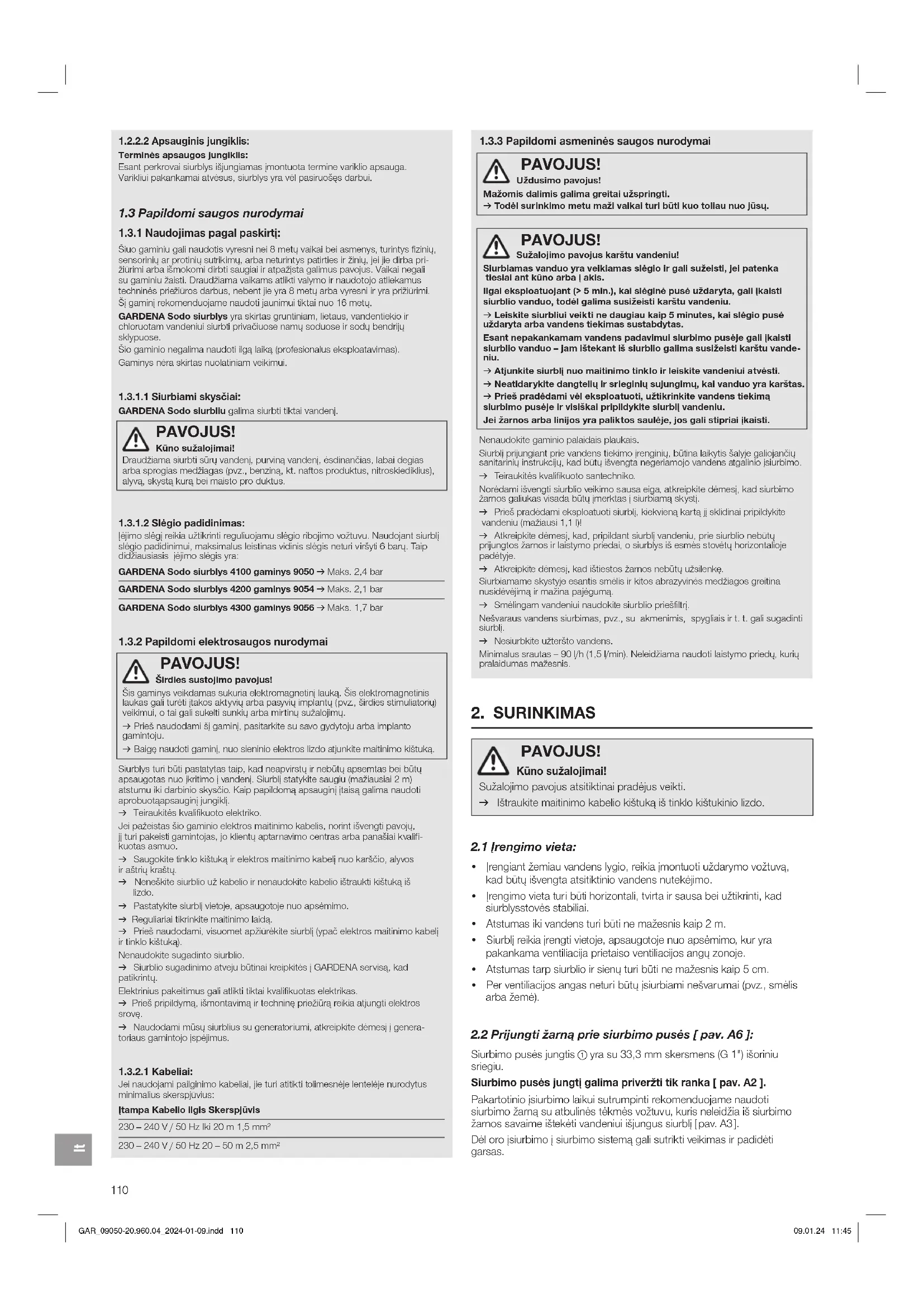 PAVOJUS! Širdies sustojimo pavojus!Šis gaminys veikdamas sukuria elektromagnetinį lauką. Šis elektromagnetinis laukas gali turėti įtakos aktyvių arba pasyvių implantų (pvz., širdies stimuliatorių) veikimui, o tai gali sukelti sunkių arba mirtinų sužalojimų. v Prieš naudodami šį gaminį, pasitarkite su savo gydytoju arba implanto gamintoju. v Baigę naudoti gaminį, nuo sieninio elektros lizdo atjunkite maitinimo kištuką. Siurblys turi būti pastatytas taip, kad neapvirstų ir nebūtų apsemtas bei būtų apsaugotas nuo įkritimo į vandenį. Siurblį statykite saugiu (mažiausiai 2m) atstumu iki darbinio skysčio. Kaip papildomą apsauginį įtaisą galima naudoti aprobuotą apsauginį jungiklį.v Teiraukitės kvalifikuoto elektriko.Jei pažeistas šio gaminio elektros maitinimo kabelis, norint išvengti pavojų, jį turi pakeisti gamintojas, jo klientų aptarnavimo centras arba panašiai kvalifi- kuotasasmuo. v Saugokite tinklo kištuką ir elektros maitinimo kabelį nuo karščio, alyvos ir aštrių kraštų.v Neneškite siurblio už kabelio ir nenaudokite kabelio ištraukti kištuką iš lizdo. v Pastatykite siurblį vietoje, apsaugotoje nuo apsėmimo. v Reguliariai tikrinkite maitinimo laidą. v Prieš naudodami, visuomet apžiūrėkite siurblį (ypač elektros maitinimo kabelį ir tinklo kištuką).Nenaudokite sugadinto siurblio. v Siurblio sugadinimo atveju būtinai kreipkitės į GARDENA servisą, kad patikrintų.Elektrinius pakeitimus gali atlikti tiktai kvalifikuotas elektrikas.v Prieš pripildymą, išmontavimą ir techninę priežiūrą reikia atjungti elektros srovę. v Naudodami mūsų siurblius su generatoriumi, atkreipkite dėmesį į genera- toriaus gamintojo įspėjimus.1.3.2.1 Kabeliai: Jei naudojami pailginimo kabeliai, jie turi atitikti tolimesnėje lentelėje nurodytus minimalius skerspjūvius:Įtampa Kabelio ilgis Skerspjūvis230 – 240 V / 50 Hz Iki 20 m 1,5 mm²230 – 240 V / 50 Hz 20 – 50 m 2,5 mm²