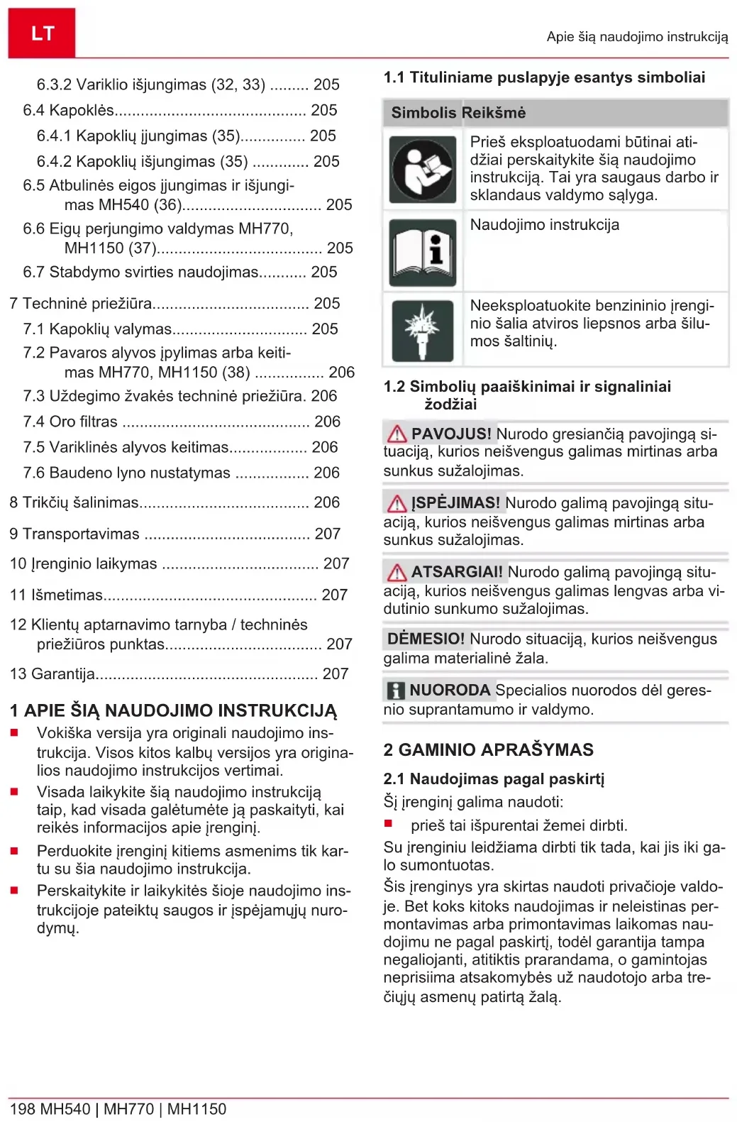 198 MH540 | MH770 | MH1150 Apie šią naudojimo instrukciją