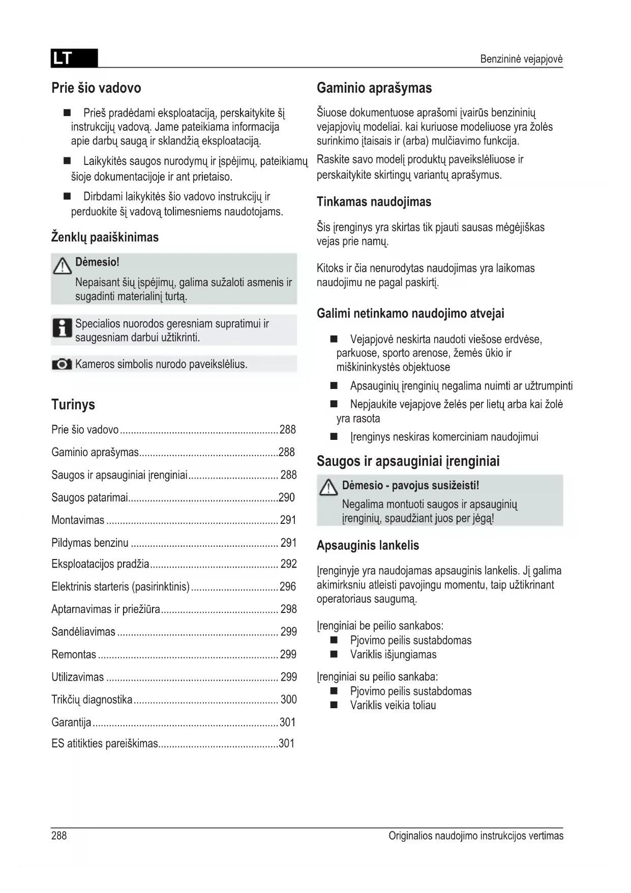 - ES atitikties pareiškimas Prie šio vadovo Priešpradėdamieksploataciją,perskaitykitešį instrukcijųvadovą.Jamepateikiamainformacija apiedarbųsaugąirsklandžiąeksploataciją. Laikykitėssaugosnurodymųirįspėjimų,pateikiamų šioje dokumentacijoje ir ant prietaiso. Dirbdamilaikykitėsšiovadovoinstrukcijųir perduokitešįvadovątolimesniemsnaudotojams. Ženklų paaiškinimas Dėmesio! Nepaisantšiųįspėjimų,galimasužalotiasmenisir sugadintimaterialinįturtą. Specialios nuorodos geresniam supratimui ir saugesniamdarbuiužtikrinti. Kamerossimbolisnurodopaveikslėlius. Gaminio aprašymas Šiuosedokumentuoseaprašomiįvairūsbenzininių vejapjoviųmodeliai.kaikuriuosemodeliuoseyražolės surinkimoįtaisaisir(arba)mulčiavimofunkcija. Raskitesavomodelįproduktųpaveikslėliuoseir perskaitykiteskirtingųvariantųaprašymus. Tinkamas naudojimas Šisįrenginysyraskirtastikpjautisausasmėgėjiškas vejasprienamų. Kitoksirčianenurodytasnaudojimasyralaikomas naudojimunepagalpaskirtį. Galimi netinkamo naudojimo atvejai Vejapjovėneskirtanaudotiviešoseerdvėse, parkuose,sportoarenose,žemėsūkioir miškininkystėsobjektuose Apsauginiųįrenginiųnegalimanuimtiaružtrumpinti Nepjaukitevejapjoveželėsperlietųarbakaižolė yra rasota Įrenginysneskiraskomerciniamnaudojimui Saugos ir apsauginiai įrenginiai Dėmesio - pavojus susižeisti! Negalimamontuotisaugosirapsauginių įrenginių,spaudžiantjuosperjėgą! Apsauginis lankelis Įrenginyjeyranaudojamasapsauginislankelis.Jįgalima akimirksniuatleistipavojingumomentu,taipužtikrinant operatoriaussaugumą. Įrenginiaibepeiliosankabos: Pjovimo peilis sustabdomas Variklis išjungiamas Įrenginiaisupeiliosankaba: Pjovimo peilis sustabdomas Variklis veikia toliauLT 289470 592_c 1 Starterio trosas 9 Pjovimoaukščioreguliatorius* 2 Paleidimas, sustabdymas* 10 Peilio sankaba* 3 Ratųpavara* 11 Kintamogreičiopavara* 4 Apsauginis lankelis 12 Naudojimo instrukcija 5 Ergonomiškopjovimoaukščioreguliatorius* 13 Žolėsišmetimoįtaisas* 6 Pripildymo lygio rodiklis* 14 Užsikimšimosklendė* 7 Išmetimo angos dangtelis* 15 Mulčiavimopriedas* 8 Žolėssurinkimotalpa* * priklauso nuo komplektacijos Simboliai ant prietaisų Dėmesio! Dirbkiteypačatsargiai. Prieš atlikdami darbus su pjovimo mechanizmuatjunkitedegimožvakės kištuką. Priešeksploatacijąperskaitykitenaudojimo instrukciją! Atjunkitevarikliostabdį. Saugokitės,kadįdarbozonąneįeitųpašalinių asmenų! Įjunkiteratųpavarą. Saugokiterankasirkojasnuopeilių! p. 301