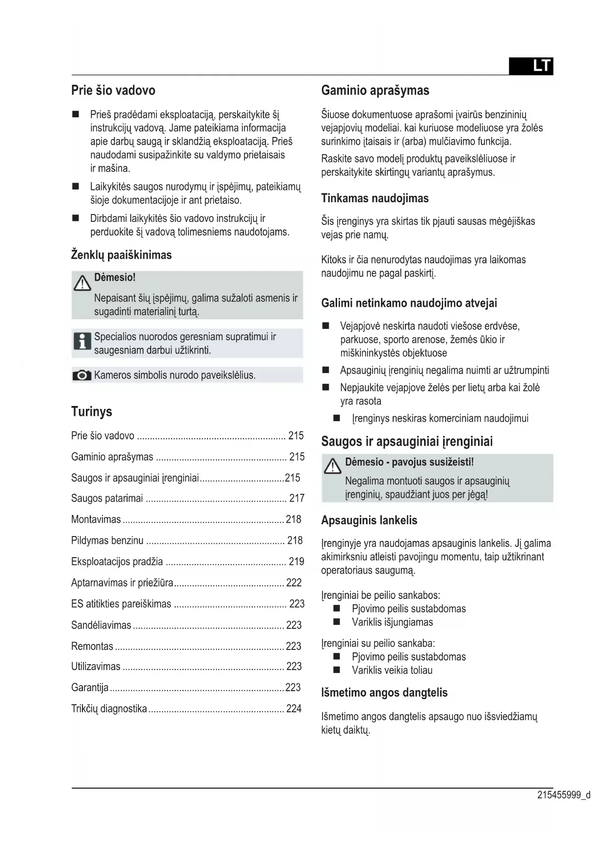 - Doties uz klientu apkalpošanas centra darbnīcu Ierīce neparasti stipri vibrē ▪ Pārbaudīt pļaušanas asmeni Darbības traucējumu gadījumā, kas nav aprakstīti šajā tabulā vai kurus jūs pats nespējat novērst, lūdzam vērsties mūsu atbildīgajā klientu apkalpošanas centrā.LT 215455999_d Turinys Prie šio vadovo .......................................................... 215 Gaminio aprašymas ................................................... 215 Saugos ir apsauginiai įrenginiai ................................. 215 Saugos patarimai ....................................................... 217 Montavimas ............................................................... 218 Pildymas benzinu ...................................................... 218 Eksploatacijos pradžia ............................................... 219 Aptarnavimas ir priežiūra ........................................... 222 ES atitikties pareiškimas ............................................ 223 Sandėliavimas ........................................................... 223 Remontas .................................................................. 223 Utilizavimas ............................................................... 223 Garantija .................................................................... 223 Trikčių diagnostika ..................................................... 224 Prie šio vadovo Prieš pradėdami eksploataciją, perskaitykite šį instrukcijų vadovą. Jame pateikiama informacija apie darbų saugą ir sklandžią eksploataciją. Prieš naudodami susipažinkite su valdymo prietaisais ir mašina. Laikykitės saugos nurodymų ir įspėjimų, pateikiamų šioje dokumentacijoje ir ant prietaiso. Dirbdami laikykitės šio vadovo instrukcijų ir perduokite šį vadovą tolimesniems naudotojams. Ženklų paaiškinimas Dėmesio! Nepaisant šių įspėjimų, galima sužaloti asmenis ir sugadinti materialinį turtą. Specialios nuorodos geresniam supratimui ir saugesniam darbui užtikrinti. Kameros simbolis nurodo paveikslėlius. Gaminio aprašymas Šiuose dokumentuose aprašomi įvairūs benzininių vejapjovių modeliai. kai kuriuose modeliuose yra žolės surinkimo įtaisais ir (arba) mulčiavimo funkcija. Raskite savo modelį produktų paveikslėliuose ir perskaitykite skirtingų variantų aprašymus. Tinkamas naudojimas Šis įrenginys yra skirtas tik pjauti sausas mėgėjiškas vejas prie namų. Kitoks ir čia nenurodytas naudojimas yra laikomas naudojimu ne pagal paskirtį. Galimi netinkamo naudojimo atvejai Vejapjovė neskirta naudoti viešose erdvėse, parkuose, sporto arenose, žemės ūkio ir miškininkystės objektuose Apsauginių įrenginių negalima nuimti ar užtrumpinti Nepjaukite vejapjove želės per lietų arba kai žolė yra rasota Įrenginys neskiras komerciniam naudojimui Saugos ir apsauginiai įrenginiai Dėmesio - pavojus susižeisti! Negalima montuoti saugos ir apsauginių įrenginių, spaudžiant juos per jėgą! Apsauginis lankelis Įrenginyje yra naudojamas apsauginis lankelis. Jį galima akimirksniu atleisti pavojingu momentu, taip užtikrinant operatoriaus saugumą. Įrenginiai be peilio sankabos: Pjovimo peilis sustabdomas Variklis išjungiamas Įrenginiai su peilio sankaba: Pjovimo peilis sustabdomas Variklis veikia toliau Išmetimo angos dangtelis Išmetimo angos dangtelis apsaugo nuo išsviedžiamų kietų daiktų.LT Originalios naudojimo instrukcijos vertimas Benzininė vejapjovė1 Starterio trosas 10 Kintamo greičio pavara*2 Ratų pavara* 11 Naudojimo instrukcija3 Apsauginis lankelis 12 Žolės išmetimo įtaisas*4 Ergonomiško pjovimo aukščio reguliatorius* 13 Užsikimšimo sklendė*5 Pripildymo lygio rodiklis* 14 Mulčiavimo priedas*6 Išmetimo angos dangtelis 15 Užvedimo užraktas elektriniam paleidimui*7 Žolės surinkimo talpa 16 Trumpas vadovas8 Pjovimo aukščio reguliatorius 17 Nuotolinio degalų padavimo*9 Peilio sankaba* * priklauso nuo komplektacijosSimboliai ant prietaisųDėmesio!Dirbkite ypač atsargiai.Prieš atlikdami darbus su pjovimo mechanizmu atjunkite degimo žvakės kištuką.Prieš eksploataciją perskaitykite naudojimo instrukciją!STARTUžvedimo užraktas elektriniam paleidi- mui: Prieš atlikdami techninės priežiūros ir re-monto darbus, ištraukite uždegimo raktą! Saugokitės, kad į darbo zoną neįeitų pašalinių asmenų!Trumpas vadovasAtjunkite variklio stabdį.Saugokite rankas ir kojas nuo peilių!Trumpas vadovasĮjunkite ratų pavarą.Laikykitės saugaus atstumo.Trumpas vadovasNuotolinio degalų padavimo įjungimas ir išjungimas.