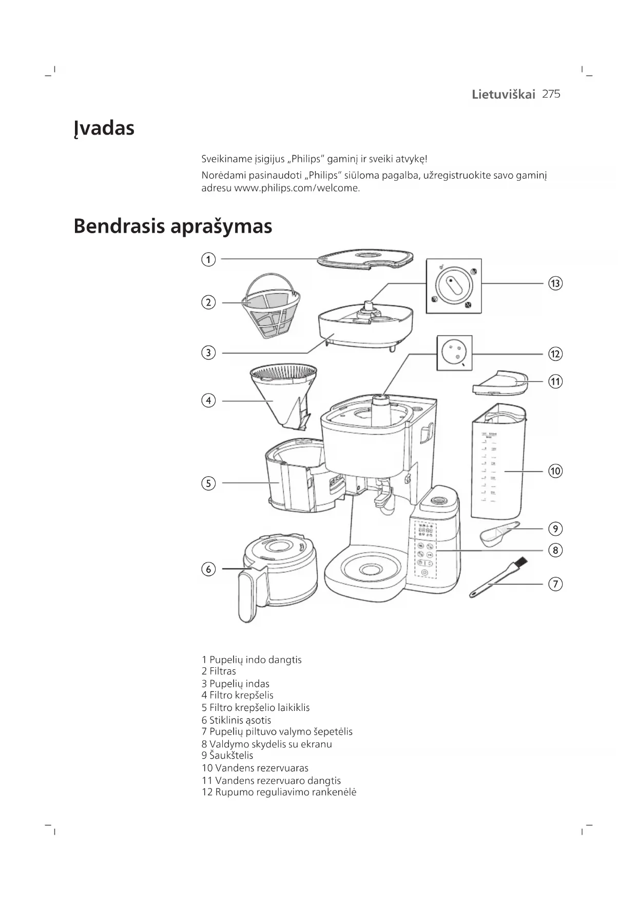Prieš pirmą kartą naudodami visada praplaukite prietaisą švariu vandeniu. Nedėkite prietaiso ant karšto paviršiaus ir saugokite, kad prie karštų paviršiųneprisiliestų maitinimo laidas. Naudojamo prietaiso nelaikykite spintelėje. Prieš valydami prietaisą ir iškilus problemoms jam verdant, atjunkite jį nuoelektros lizdo. Visada prietaisui atvėsus jį išvalykite. Virimo ir šilumos išlaikymo metu vandens bakelis, filtro laikiklis, viryklė,apatinė prietaiso dalis ir kavos pripildytas ąsotis yra karšti net praėjus kuriamlaikui. Nedėkite ąsočio ant viryklės ar į mikrobangų krosnelę norėdami pašildytikavą. Šis prietaisas skirtas naudoti buityje ir panašiose vietose, pvz., sodonameliuose, viešbučiuose, kuriuose patiekiami pusryčiai, personalo virtuvėjeparduotuvėse, biuruose ar kitoje darbo aplinkoje, taip pat viešbučiuose,moteliuose ir kitoje gyvenamojo tipo aplinkoje. Prietaisą apžiūrėti ar taisyti pristatykite tik į „Philips“ įgaliotąjį techninėspriežiūros centrą. Neatidarykite prietaiso ir nebandykite jo taisyti patys. Kaitinimo elemento paviršius, filtro laikiklis, apatinė prietaiso dalis, viryklė irkavos pripildytas ąsotis kurį laiką po naudojimo išlaiko šilumą. Jei nenurodyta kitaip, visa pakavimo medžiaga dėžutėje yra pagaminta išperdirbto popieriaus; žr. PAP žymėjimą ant dėžutės. Kalkių nuosėdų šalinimas