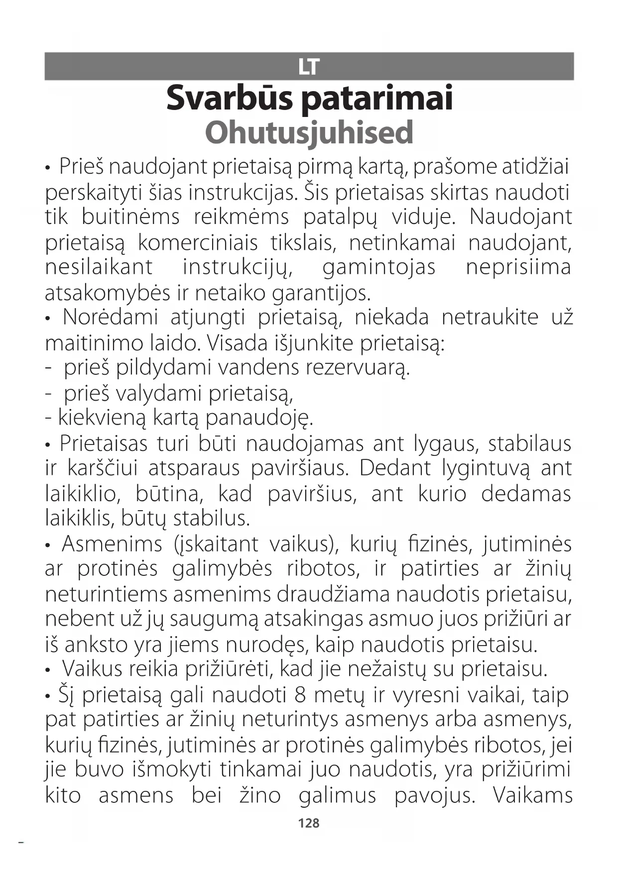 - Asmenims (įskaitant vaikus), kurių zinės, jutiminės ar protinės galimybės ribotos, ir patirties ar žinių neturintiems asmenims draudžiama naudotis prietaisu, nebent už jų saugumą atsakingas asmuo juos prižiūri ar iš anksto yra jiems nurodęs, kaip naudotis prietaisu.