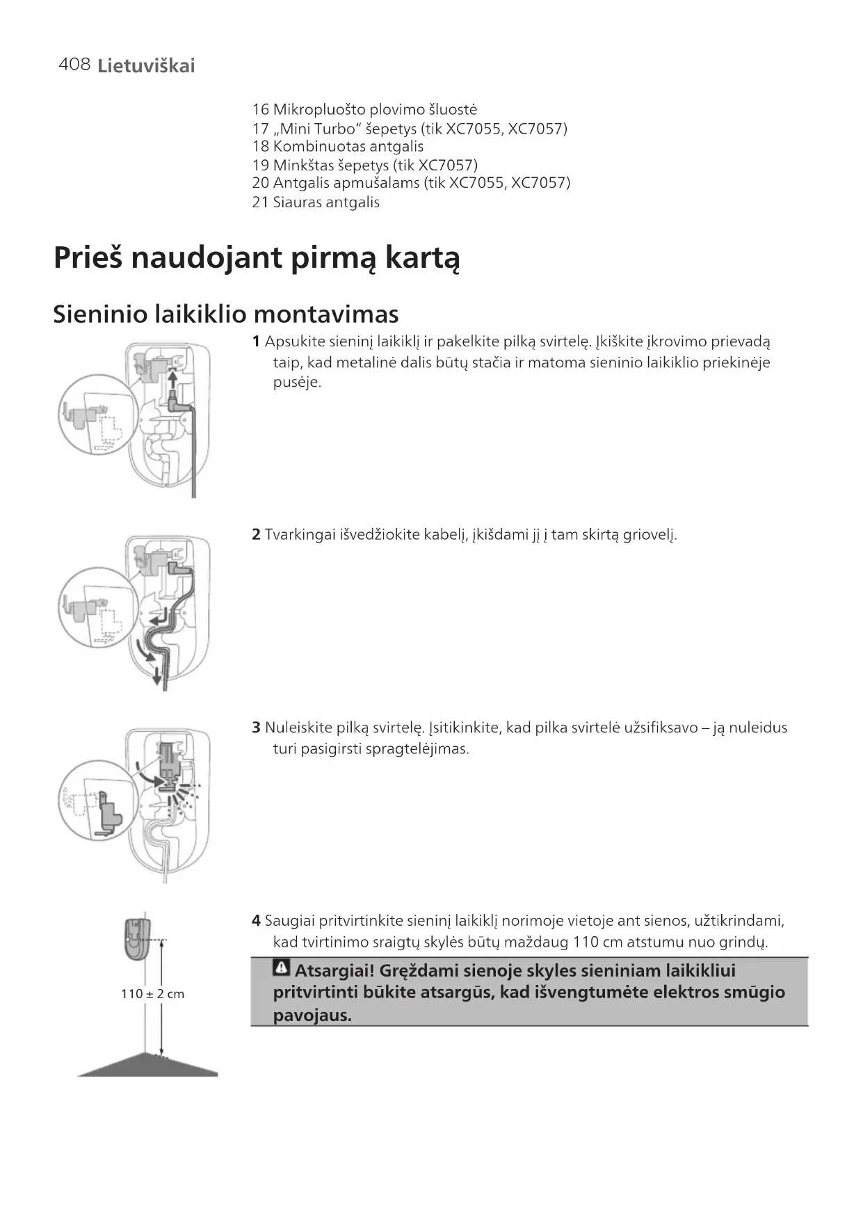 Lietuviškai Turinys Įvadas ____________________________________________________________________________________ 407 Bendrasis aprašymas________________________________________________________________________ 407 Prieš naudojant pirmą kartą _________________________________________________________________ 408 Sieninio laikiklio montavimas ________________________________________________________________ 408 Paruošimas naudoti ________________________________________________________________________ 409 Prietaiso naudojimas________________________________________________________________________ 410 Prietaiso surinkimas ________________________________________________________________________ 410 Kietų ir minkštų grindų siurbimas_____________________________________________________________ 411 Kietų grindų siurbimas jas plaunant___________________________________________________________ 412 Universalus panaudojimas ir priedai __________________________________________________________ 415 Pritaikymas poreikiams ir papildoma informacija _______________________________________________ 417 Techninė priežiūra po naudojimo_____________________________________________________________ 420 Dažna techninė priežiūra po kiekvieno valymo ciklo_____________________________________________ 420 Periodinė techninė priežiūra _________________________________________________________________ 423 Pakeitimas ________________________________________________________________________________ 429 Naudotojo sąsajos signalai ir jų reikšmės ______________________________________________________ 430 Trikčių diagnostika ir šalinimas _______________________________________________________________ 432 Sausas valymas_____________________________________________________________________________ 432 Šlapias valymas ____________________________________________________________________________ 436 Įvadas Ačiū, kad pirkote šį „Philips“ gaminį! Norėdami pasinaudoti mūsų siūlomu palaikymu, užregistruokite savo produktą interneto svetainėje www.philips.com/mycordlessvacuum-7000s. Bendrasis aprašymas 1 Skaitmeninis indikatoriaus ekranas a Žiedinis akumuliatoriaus įkrovos lygio indikatorius b Akumuliatoriaus įkrovos lygis procentais c Pasirinktas galios lygis d Grindų tipo atpažinimo funkcijos aktyvavimo piktograma e Filtro valymo priminimo piktograma 2 Meniu/Patvirtinimo mygtukas 3 „+“ mygtukas 4 „–“ mygtukas 5 Įjungimo ir išjungimo mygtukas 6 Rankinis įtaisas 7 Dulkių talpyklą 8 Akumuliatorius 9 Atsarginis filtras (tik XC7057) 10 Dulkių talpyklos atlaisvinimo mygtukas 11 Sieninis laikiklis 12 Adapteris 13 Vamzdis 14 „PrecisionPower Smart“ išmanusis antgalis 15 Vandens bakelis408 Lietuviškai 16 Mikropluošto plovimo šluostė 17 „Mini Turbo“ šepetys (tik XC7055, XC7057) 18 Kombinuotas antgalis 19 Minkštas šepetys (tik XC7057) 20 Antgalis apmušalams (tik XC7055, XC7057) 21 Siauras antgalis Prieš naudojant pirmą kartą Sieninio laikiklio montavimas 1 Apsukite sieninį laikiklį ir pakelkite pilką svirtelę. Įkiškite įkrovimo prievadą taip, kad metalinė dalis būtų stačia ir matoma sieninio laikiklio priekinėje pusėje. 2 Tvarkingai išvedžiokite kabelį, įkišdami jį į tam skirtą griovelį. 3 Nuleiskite pilką svirtelę. Įsitikinkite, kad pilka svirtelė užsifiksavo – ją nuleidus turi pasigirsti spragtelėjimas. 110 ± 2 cm 4 Saugiai pritvirtinkite sieninį laikiklį norimoje vietoje ant sienos, užtikrindami, kad tvirtinimo sraigtų skylės būtų maždaug 110 cm atstumu nuo grindų. Atsargiai! Gręždami sienoje skyles sieniniam laikikliui pritvirtinti būkite atsargūs, kad išvengtumėte elektros smūgio pavojaus.409 Lietuviškai Pastaba. Patikrinkite, ar sieninio laikiklio padėtis leidžia prietaisui kabėti ant sienos taip, kad antgalis nesiliestų prie grindų. 5 Kai nustatysite tinkamiausią prietaiso laikymo ir įkrovimo padėtį bei aukštį, tvirtai priveržkite sraigtus, kad pritvirtintumėte sieninį laikiklį. Paruošimas naudoti Prietaisas turi ličio jonų akumuliatorių. Visiškai įkrauti tuščią akumuliatorių trunka apie 6 valandas. 1 Pritvirtinkite akumuliatorių prie pagrindinio prietaiso korpuso, užtikrindami, kad jis užsifiksavo – teisingai pritvirtinus turi pasigirsti spragtelėjimas. MAX 40⁰C MIN 5⁰C 2 Norėdami įkrauti prietaisą, pritvirtinkite jį prie sieninio laikiklio. Įspėjimas. Laikykite ir kraukite prietaisą ne žemesnėje kaip 5 °C ir ne aukštesnėje kaip 40 °C temperatūroje.410 Lietuviškai Pastaba. Be to, rankinį įtaisą galite pastatyti ant lygaus ir stabilaus paviršiaus, o įkrovimo kabelį tiesiogiai jungti į prietaisą.
