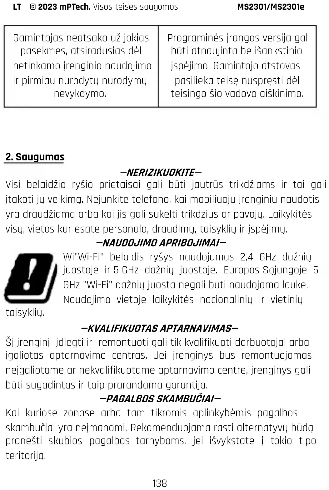 - Wi-Fi® bei Wi-Fi logotipas yra registruoti Wi-Fi Alliance asociacijos prekiniai ženklai.LT © 2023 mPTech. Visos teisės saugomos. MS2301/MS2301e