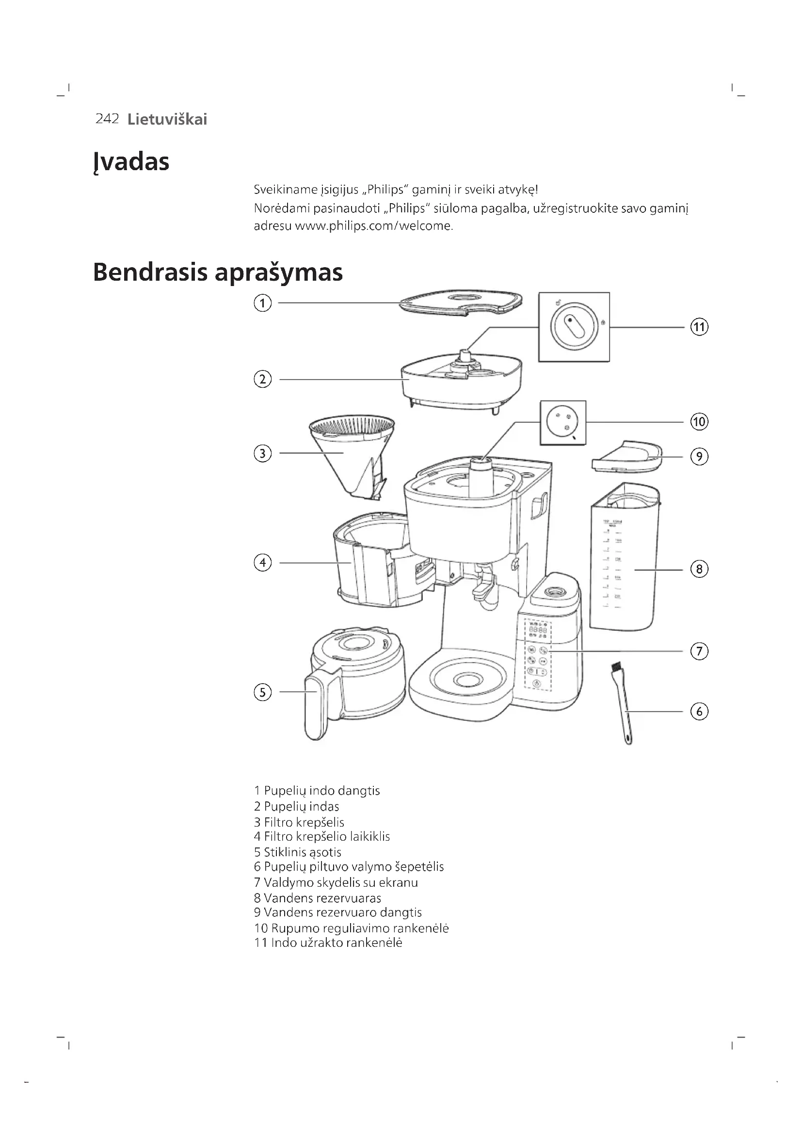 1 Pupelių indo dangtis 2 Pupelių indas 3 Filtro krepšelis 4 Filtro krepšelio laikiklis 5 Stiklinis ąsotis 6 Pupelių piltuvo valymo šepetėlis 7 Valdymo skydelis su ekranu 8 Vandens rezervuaras 9 Vandens rezervuaro dangtis 10 Rupumo reguliavimo rankenėlė 11 Indo užrakto rankenėlė243 Lietuviškai Valdymo skydelis Maitinimo mygtukas Laikmačio mygtukas ir rodyklės mygtukas laikui reguliuoti Paleidimo / pauzės mygtukas Valymo mygtukas Maltos kavos ir kavos stiprumo nustatymo mygtukas Puodelio pasirinkimo mygtukas Rodoma piktograma Puodelių skaičius Karščio palaikymo režimas Malta kava Kavos stiprumas Kalkių nuosėdų šalinimas Rankinio valymo įspėjamasis signalas Mažo vandens kiekio išlaikymas Laikmatis244 Lietuviškai Laiko rodymo ekranas Pirmieji du skaitmenys reiškia valandas, o paskutiniai du skaitmenys – minutes. Pasukite rankenėlę į atrakinimo padėtį. Tada galėsite išimti pupelių indą iš prietaiso. Šia rankenėle nustatomas kavos rupumas. Didesnis dydis reiškia, kad bus malama stambiau. Ąsočio režimas Lašėjimo stabdymo funkcija veikia ąsočio režimu. Pastaba. Patraukus ąsotį, virimo procesas nesustabdomas. Jei per 20 sek. neįdėsite ąsočio atgal į prietaisą, filtro krepšelis persipildys. Puodelio režimas Rankiniu būdu perjunkite rankenėlę iš puodelio į ąsočio režimą, kad įjungtumėte lašėjimo stabdiklį ir nelašėtų pasibaigus virimo ciklui Pastaba. Šaltas keraminis puodelis šildamas sugers kavos šilumą. Iš anksto pašildykite puodelį karštu vandeniu. Svarbu Įspėjimas