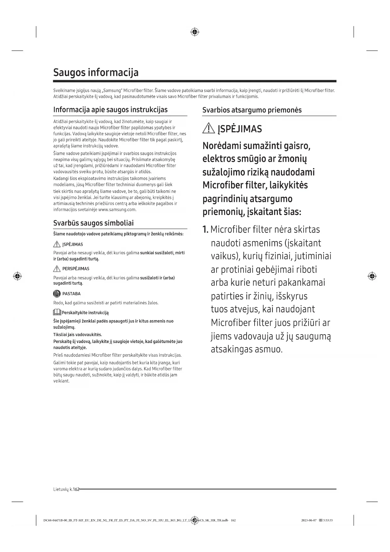 - Посочените тук размери може леко да се различават от действително измерените стойности в зависимост от използвания метод на измерване. DC68-04471B-00_IB_FT-MF_EU_EN_DE_NL_FR_IT_ES_PT_DA_FI_NO_SV_PL_HU_EL_RO_BG_LT_LV_ET_CS_SK_HR_TR.indb 161 2023-06-07 5:53:54Lietuvių k.162 Saugos informacija Sveikiname įsigijus naują „Samsung“ Microfiber filter. Šiame vadove pateikiama svarbi informacija, kaip įrengti, naudoti ir prižiūrėti šį Microfiber filter. Atidžiai perskaitykite šį vadovą, kad pasinaudotumėte visais savo Microfiber filter privalumais ir funkcijomis. Informacija apie saugos instrukcijas Atidžiai perskaitykite šį vadovą, kad žinotumėte, kaip saugiai ir efektyviai naudoti naujo Microfiber filter papildomas ypatybes ir funkcijas. Vadovą laikykite saugioje vietoje netoli Microfiber filter, nes jo gali prireikti ateityje. Naudokite Microfiber filter tik pagal paskirtį, aprašytą šiame instrukcijų vadove. Šiame vadove pateikiami įspėjimai ir svarbios saugos instrukcijos neapima visų galimų sąlygų bei situacijų. Prisiimate atsakomybę už tai, kad įrengdami, prižiūrėdami ir naudodami Microfiber filter vadovausitės sveiku protu, būsite atsargūs ir atidūs. Kadangi šios eksploatavimo instrukcijos taikomos įvairiems modeliams, jūsų Microfiber filter techniniai duomenys gali šiek tiek skirtis nuo aprašytų šiame vadove, be to, gali būti taikomi ne visi įspėjimo ženklai. Jei turite klausimų ar abejonių, kreipkitės į artimiausią techninės priežiūros centrą arba ieškokite pagalbos ir informacijos svetainėje www.samsung.com. Svarbūs saugos simboliai Šiame naudotojo vadove pateikiamų piktogramų ir ženklų reikšmės: ĮSPĖJIMAS Pavojai arba nesaugi veikla, dėl kurios galima sunkiai susižaloti, mirti ir (arba) sugadinti turtą. PERSPĖJIMAS Pavojai arba nesaugi veikla, dėl kurios galima susižaloti ir (arba) sugadinti turtą. PASTABA Rodo, kad galima susižeisti ar patirti materialinės žalos. Perskaitykite instrukciją Šie įspėjamieji ženklai padės apsaugoti jus ir kitus asmenis nuo sužalojimų. Tiksliai jais vadovaukitės. Perskaitę šį vadovą, laikykite jį saugioje vietoje, kad galėtumėte juo naudotis ateityje. Prieš naudodamiesi Microfiber filter perskaitykite visas instrukcijas. Galimi tokie pat pavojai, kaip naudojantis bet kuria kita įranga, kuri varoma elektra ar kurią sudaro judančios dalys. Kad Microfiber filter būtų saugu naudoti, sužinokite, kaip jį valdyti, ir būkite atidūs jam veikiant. Svarbios atsargumo priemonės ĮSPĖJIMAS Norėdami sumažinti gaisro, elektros smūgio ar žmonių sužalojimo riziką naudodami Microfiber filter, laikykitės pagrindinių atsargumo priemonių, įskaitant šias: