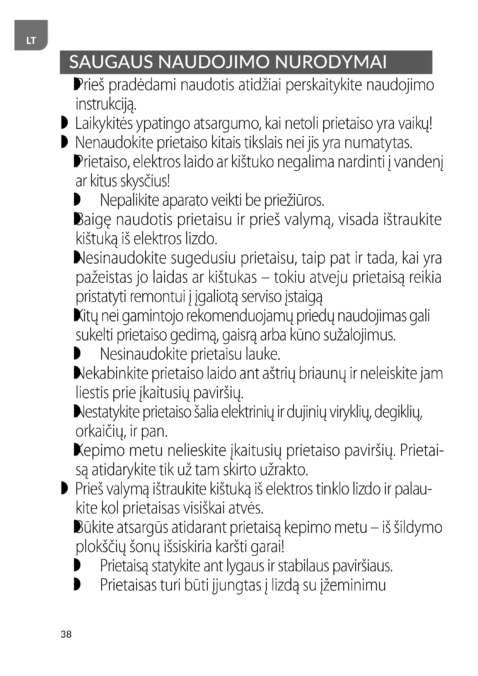 Būkite atsargūs atidarant prietaisą kepimo metu – iš šildymo plokščių šonų išsiskiria karšti garai! Prietaisą statykite ant lygaus ir stabilaus paviršiaus. Prietaisas turi būti įjungtas į lizdą su įžeminimu39