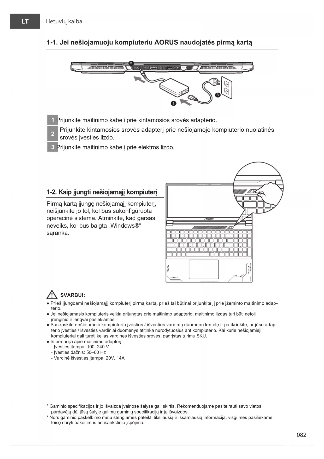 Prijunkite kintamosios srovės adapterį prie nešiojamojo kompiuterio nuolatinės srovės įvesties lizdo. 3 Prijunkite maitinimo kabelį prie elektros lizdo. 1-2. Kaip įjungti nešiojamąjį kompiuterį Pirmą kartą įjungę nešiojamąjį kompiuterį, neišjunkite jo tol, kol bus sukongūruota operacinė sistema. Atminkite, kad garsas neveiks, kol bus baigta „Windows®“ sąranka. SVARBU!: ● Prieš įjungdami nešiojamąjį kompiuterį pirmą kartą, prieš tai būtinai prijunkite jį prie įžeminto maitinimo adap- terio.● Jei nešiojamasis kompiuteris veikia prijungtas prie maitinimo adapterio, maitinimo lizdas turi būti netoli įrenginio ir lengvai pasiekiamas. ● Susiraskite nešiojamojo kompiuterio įvesties / išvesties vardinių duomenų lentelę ir patikrinkite, ar jūsų adap- terio įvesties / išvesties vardiniai duomenys atitinka nurodytuosius ant kompiuterio. Kai kurie nešiojamieji kompiuteriai gali turėti kelias vardines išvesties sroves, pagrįstas turimu SKU.● Informacija apie maitinimo adapterį: - Įvesties įtampa: 100–240 V - Įvesties dažnis: 50–60 Hz - Vardinė išvesties įtampa: 20V, 14A* Gaminio specikacijos ir jo išvaizda įvairiose šalyse gali skirtis. Rekomenduojame pasiteirauti savo vietos pardavėjų dėl jūsų šalyje galimų gaminių specikacijų ir jų išvaizdos. * Nors gaminio paskelbimo metu stengiamės pateikti tiksliausią ir išsamiausią informaciją, visgi mes pasiliekame teisę daryti pakeitimus be išankstinio įspėjimo.Lietuvių kalba
