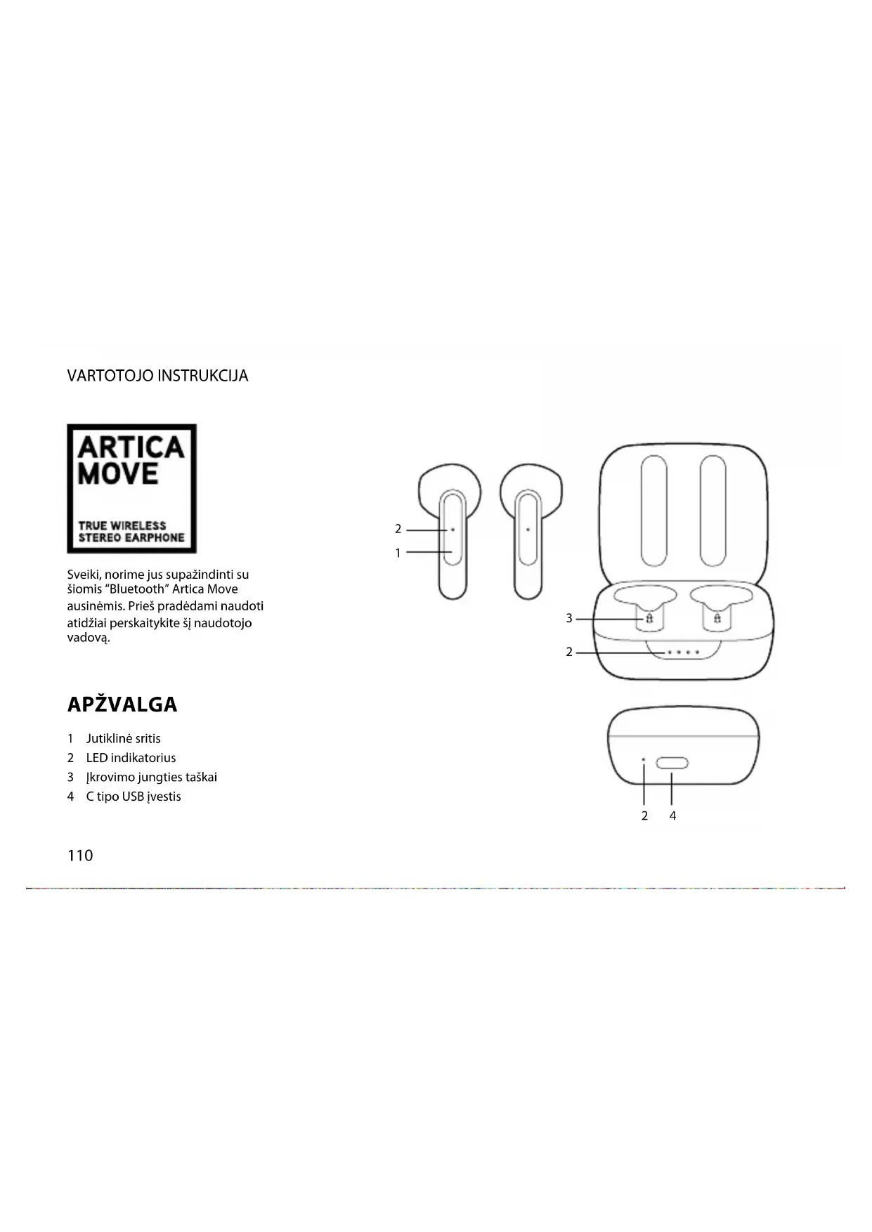 Sveiki, norime jus supažindinti su šiomis “Bluetooth” Artica Move ausinėmis. Prieš pradėdami naudoti atidžiai perskaitykite šį naudotojo vadovą. APŽVALGA Jutiklinė sritis LED indikatorius Įkrovimo jungties taškai C tipo USB įvestis