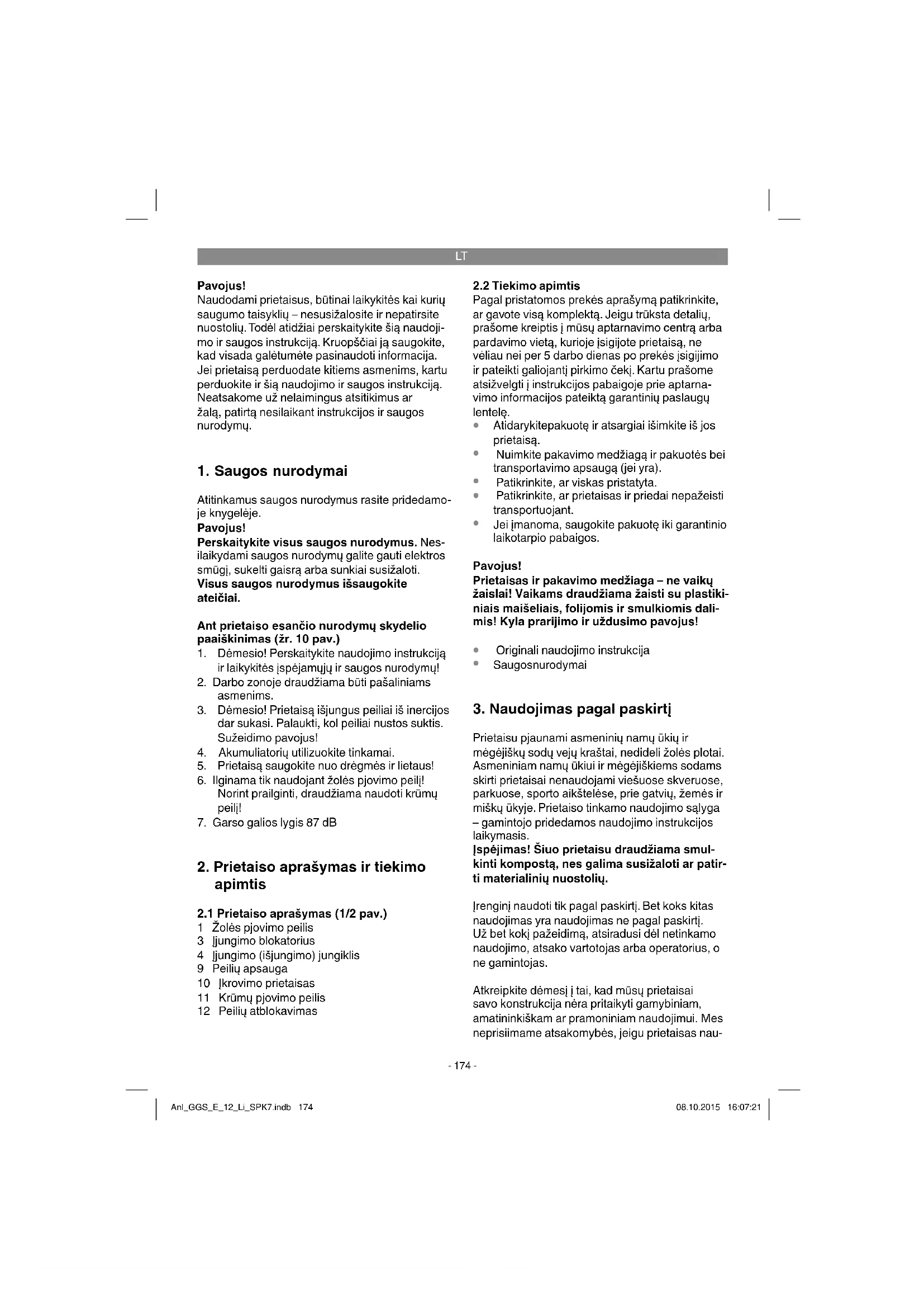 Prietaisu pjaunami asmeninių namų ūkių ir mėgėjiškų sodų vejų kraštai, nedideli žolės plotai. Asmeniniam namų ūkiui ir mėgėjiškiems sodams skirti prietaisai nenaudojami viešuose skveruose, parkuose, sporto aikštelėse, prie gatvių, žemės ir miškų ūkyje. Prietaiso tinkamo naudojimo sąlyga – gamintojo pridedamos naudojimo instrukcijos laikymasis. Įspėjimas! Šiuo prietaisu draudžiama smul- kinti kompostą, nes galima susižaloti ar patir- ti materialinių nuostolių. Įrenginį naudoti tik pagal paskirtį. Bet koks kitas naudojimas yra naudojimas ne pagal paskirtį. Už bet kokį pažeidimą, atsiradusi dėl netinkamo naudojimo, atsako vartotojas arba operatorius, o ne gamintojas. Atkreipkite dėmesį į tai, kad mūsų prietaisai savo konstrukcija nėra pritaikyti gamybiniam, amatininkiškam ar pramoniniam naudojimui. Mes neprisiimame atsakomybės, jeigu prietaisas nau- Anl_GGS_E_12_Li_SPK7.indb 174Anl_GGS_E_12_Li_SPK7.indb 174 08.10.2015 16:07:2108.10.2015 16:07:21LT