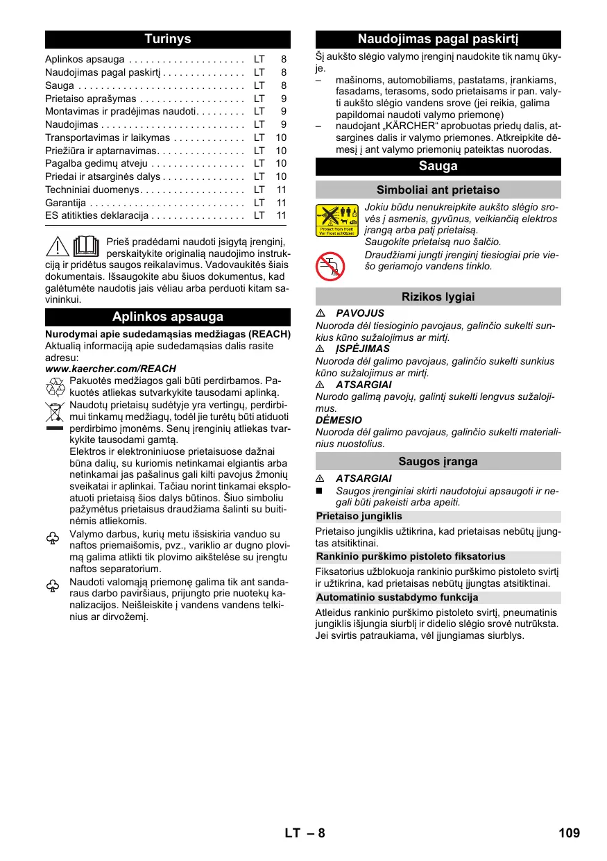 Šį aukšto slėgio valymo įrenginį naudokite tik namų ūkyje. – mašinoms, automobiliams, pastatams, įrankiams, fasadams, terasoms, sodo prietaisams ir pan. valyti aukšto slėgio vandens srove (jei reikia, galima papildomai naudoti valymo priemonę) – naudojant „KÄRCHER“ aprobuotas priedų dalis, atsargines dalis ir valymo priemones. Atkreipkite dėmesį į ant valymo priemonių pateiktas nuorodas. Sauga Simboliai ant prietaiso Jokiu būdu nenukreipkite aukšto slėgio srovės į asmenis, gyvūnus, veikiančią elektros įrangą arba patį prietaisą. Saugokite prietaisą nuo šalčio. Draudžiami jungti įrenginį tiesiogiai prie viešo geriamojo vandens tinklo. Prieš pradėdami naudoti įsigytą įrenginį, perskaitykite originalią naudojimo instrukciją ir pridėtus saugos reikalavimus. Vadovaukitės šiais dokumentais. Išsaugokite abu šiuos dokumentus, kad galėtumėte naudotis jais vėliau arba perduoti kitam savininkui. Aplinkos apsauga Nurodymai apie sudedamąsias medžiagas (REACH) Aktualią informaciją apie sudedamąsias dalis rasite adresu: www.kaercher.com/REACH Pakuotės medžiagos gali būti perdirbamos. Pakuotės atliekas sutvarkykite tausodami aplinką. Naudotų prietaisų sudėtyje yra vertingų, perdirbimui tinkamų medžiagų, todėl jie turėtų būti atiduoti perdirbimo įmonėms. Senų įrenginių atliekas tvarkykite tausodami gamtą. Elektros ir elektroniniuose prietaisuose dažnai būna dalių, su kuriomis netinkamai elgiantis arba netinkamai jas pašalinus gali kilti pavojus žmonių sveikatai ir aplinkai. Tačiau norint tinkamai eksploatuoti prietaisą šios dalys būtinos. Šiuo simboliu pažymėtus prietaisus draudžiama šalinti su buitinėmis atliekomis. Valymo darbus, kurių metu išsiskiria vanduo su naftos priemaišomis, pvz., variklio ar dugno plovimą galima atlikti tik plovimo aikštelėse su įrengtu naftos separatorium. Naudoti valomąją priemonę galima tik ant sandaraus darbo paviršiaus, prijungto prie nuotekų kanalizacijos. Neišleiskite į vandens vandens telkinius ar dirvožemį. Rizikos lygiai PAVOJUS Nuoroda dėl tiesioginio pavojaus, galinčio sukelti sunkius kūno sužalojimus ar mirtį. 몇 ĮSPĖJIMAS Nuoroda dėl galimo pavojaus, galinčio sukelti sunkius kūno sužalojimus ar mirtį. 몇 ATSARGIAI Nurodo galimą pavojų, galintį sukelti lengvus sužalojimus. DĖMESIO Nuoroda dėl galimo pavojaus, galinčio sukelti materialinius nuostolius. Saugos įranga