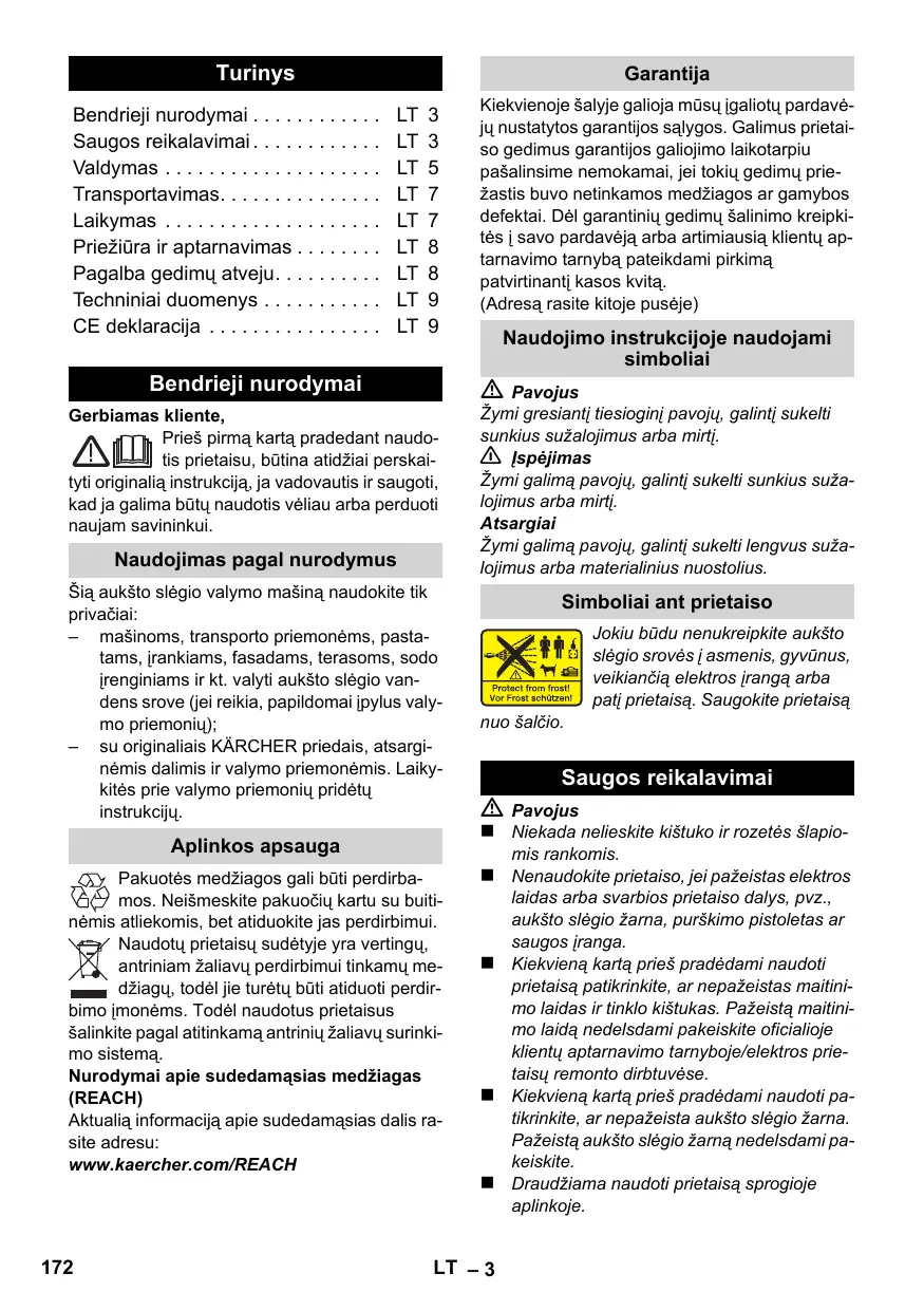 Bendrieji nurodymai Gerbiamas kliente, Prieš pirmą kartą pradedant naudotis prietaisu, būtina atidžiai perskaityti originalią instrukciją, ja vadovautis ir saugoti, kad ja galima būtų naudotis vėliau arba perduoti naujam savininkui. Naudojimas pagal nurodymus Šią aukšto slėgio valymo mašiną naudokite tik privačiai: – mašinoms, transporto priemonėms, pastatams, įrankiams, fasadams, terasoms, sodo įrenginiams ir kt. valyti aukšto slėgio vandens srove (jei reikia, papildomai įpylus valymo priemonių); – su originaliais KÄRCHER priedais, atsarginėmis dalimis ir valymo priemonėmis. Laikykitės prie valymo priemonių pridėtų instrukcijų. Aplinkos apsauga Naudojimo instrukcijoje naudojami simboliai Pavojus Žymi gresiantį tiesioginį pavojų, galintį sukelti sunkius sužalojimus arba mirtį. 몇 Įspėjimas Žymi galimą pavojų, galintį sukelti sunkius sužalojimus arba mirtį. Atsargiai Žymi galimą pavojų, galintį sukelti lengvus sužalojimus arba materialinius nuostolius. Simboliai ant prietaiso Jokiu būdu nenukreipkite aukšto slėgio srovės į asmenis, gyvūnus, veikiančią elektros įrangą arba patį prietaisą. Saugokite prietaisą nuo šalčio. Saugos reikalavimai Pavojus Niekada nelieskite kištuko ir rozetės šlapiomis rankomis. Pakuotės medžiagos gali būti perdirbamos. Neišmeskite pakuočių kartu su buitinėmis atliekomis, bet atiduokite jas perdirbimui. Naudotų prietaisų sudėtyje yra vertingų, antriniam žaliavų perdirbimui tinkamų medžiagų, todėl jie turėtų būti atiduoti perdirbimo įmonėms. Todėl naudotus prietaisus šalinkite pagal atitinkamą antrinių žaliavų surinkimo sistemą. Nurodymai apie sudedamąsias medžiagas (REACH) Aktualią informaciją apie sudedamąsias dalis rasite adresu: www.kaercher.com/REACH
