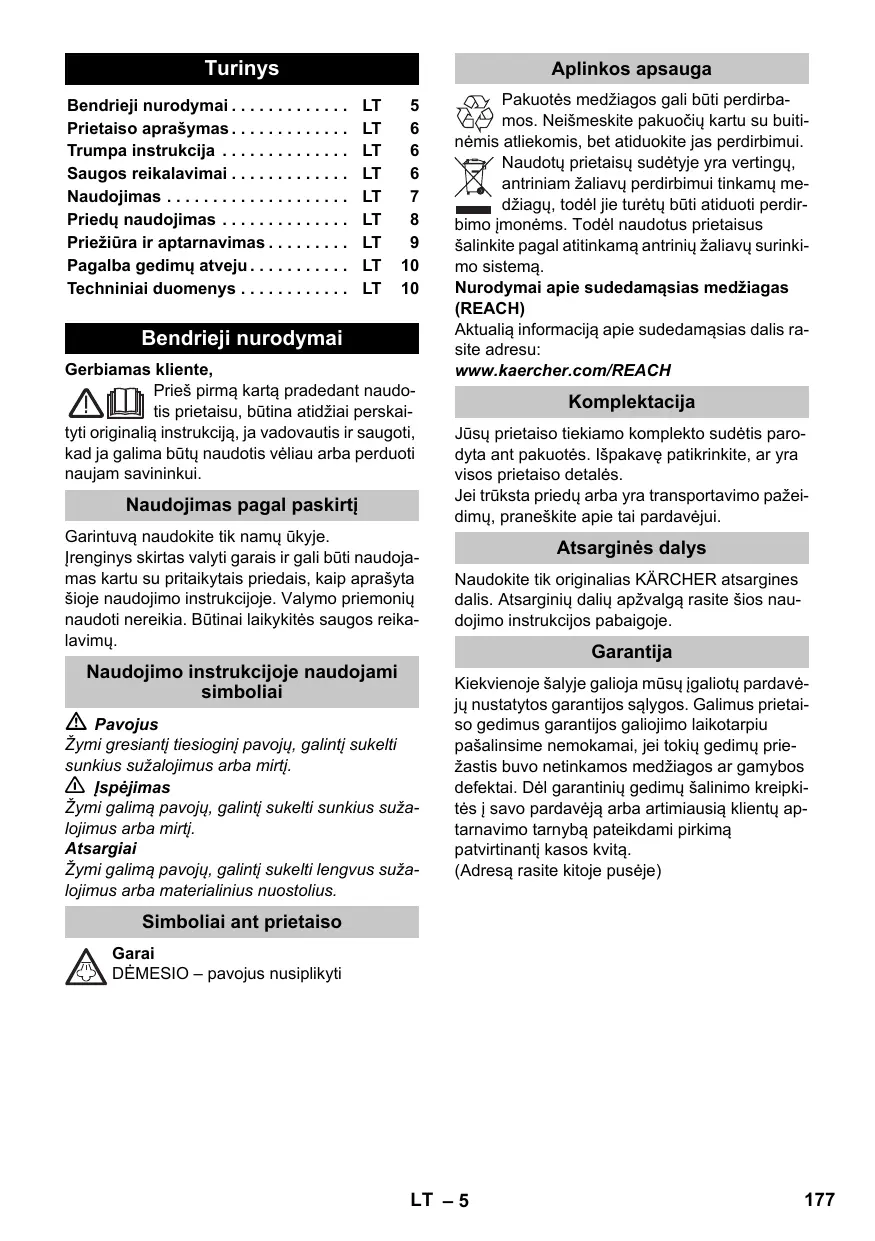 Bendrieji nurodymai Gerbiamas kliente, Prieš pirmą kartą pradedant naudotis prietaisu, būtina atidžiai perskaityti originalią instrukciją, ja vadovautis ir saugoti, kad ja galima būtų naudotis vėliau arba perduoti naujam savininkui. Naudojimas pagal paskirtį Garintuvą naudokite tik namų ūkyje. Įrenginys skirtas valyti garais ir gali būti naudojamas kartu su pritaikytais priedais, kaip aprašyta šioje naudojimo instrukcijoje. Valymo priemonių naudoti nereikia. Būtinai laikykitės saugos reikalavimų. Naudojimo instrukcijoje naudojami simboliai Pavojus Žymi gresiantį tiesioginį pavojų, galintį sukelti sunkius sužalojimus arba mirtį. 몇 Įspėjimas Žymi galimą pavojų, galintį sukelti sunkius sužalojimus arba mirtį. Atsargiai Žymi galimą pavojų, galintį sukelti lengvus sužalojimus arba materialinius nuostolius. Pakuotės medžiagos gali būti perdirbamos. Neišmeskite pakuočių kartu su buitinėmis atliekomis, bet atiduokite jas perdirbimui. Naudotų prietaisų sudėtyje yra vertingų, antriniam žaliavų perdirbimui tinkamų medžiagų, todėl jie turėtų būti atiduoti perdirbimo įmonėms. Todėl naudotus prietaisus šalinkite pagal atitinkamą antrinių žaliavų surinkimo sistemą. Nurodymai apie sudedamąsias medžiagas (REACH) Aktualią informaciją apie sudedamąsias dalis rasite adresu: www.kaercher.com/REACH Komplektacija Jūsų prietaiso tiekiamo komplekto sudėtis parodyta ant pakuotės. Išpakavę patikrinkite, ar yra visos prietaiso detalės. Jei trūksta priedų arba yra transportavimo pažeidimų, praneškite apie tai pardavėjui. Atsarginės dalys Naudokite tik originalias KÄRCHER atsargines dalis. Atsarginių dalių apžvalgą rasite šios naudojimo instrukcijos pabaigoje. Garantija Kiekvienoje šalyje galioja mūsų įgaliotų pardavėjų nustatytos garantijos sąlygos. Galimus prietaiso gedimus garantijos galiojimo laikotarpiu pašalinsime nemokamai, jei tokių gedimų priežastis buvo netinkamos medžiagos ar gamybos defektai. Dėl garantinių gedimų šalinimo kreipkitės į savo pardavėją arba artimiausią klientų aptarnavimo tarnybą pateikdami pirkimą patvirtinantį kasos kvitą. (Adresą rasite kitoje pusėje) Simboliai ant prietaiso Garai DĖMESIO – pavojus nusiplikyti LT – 5